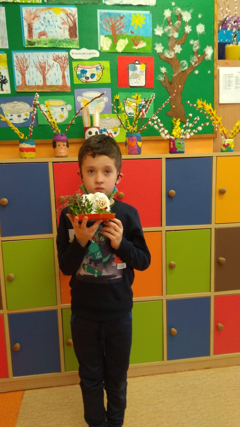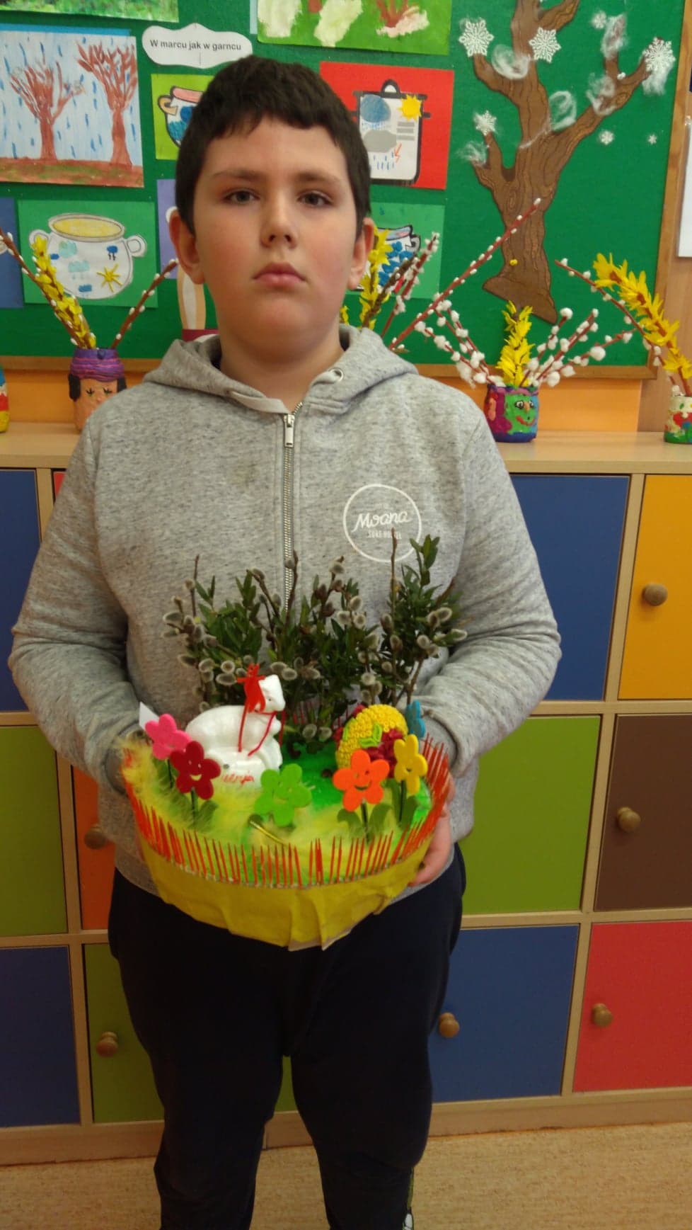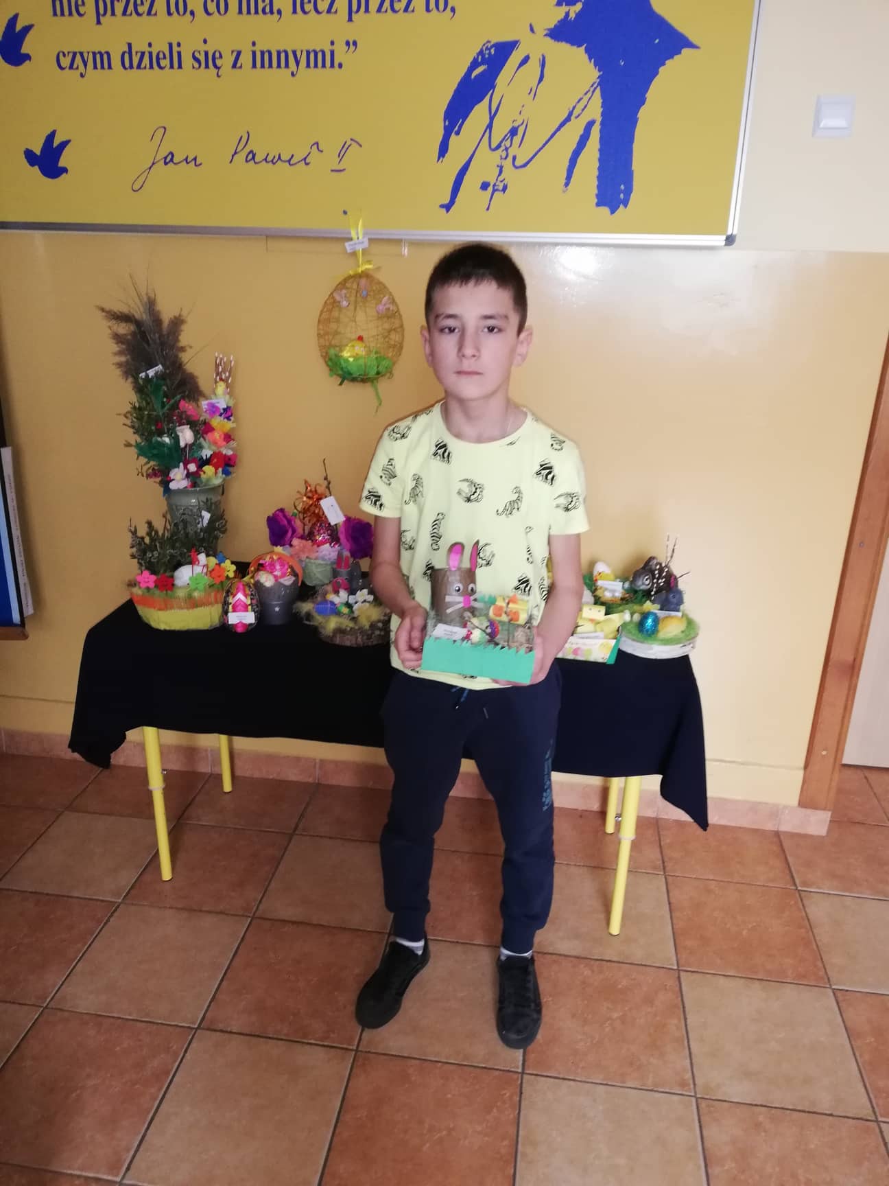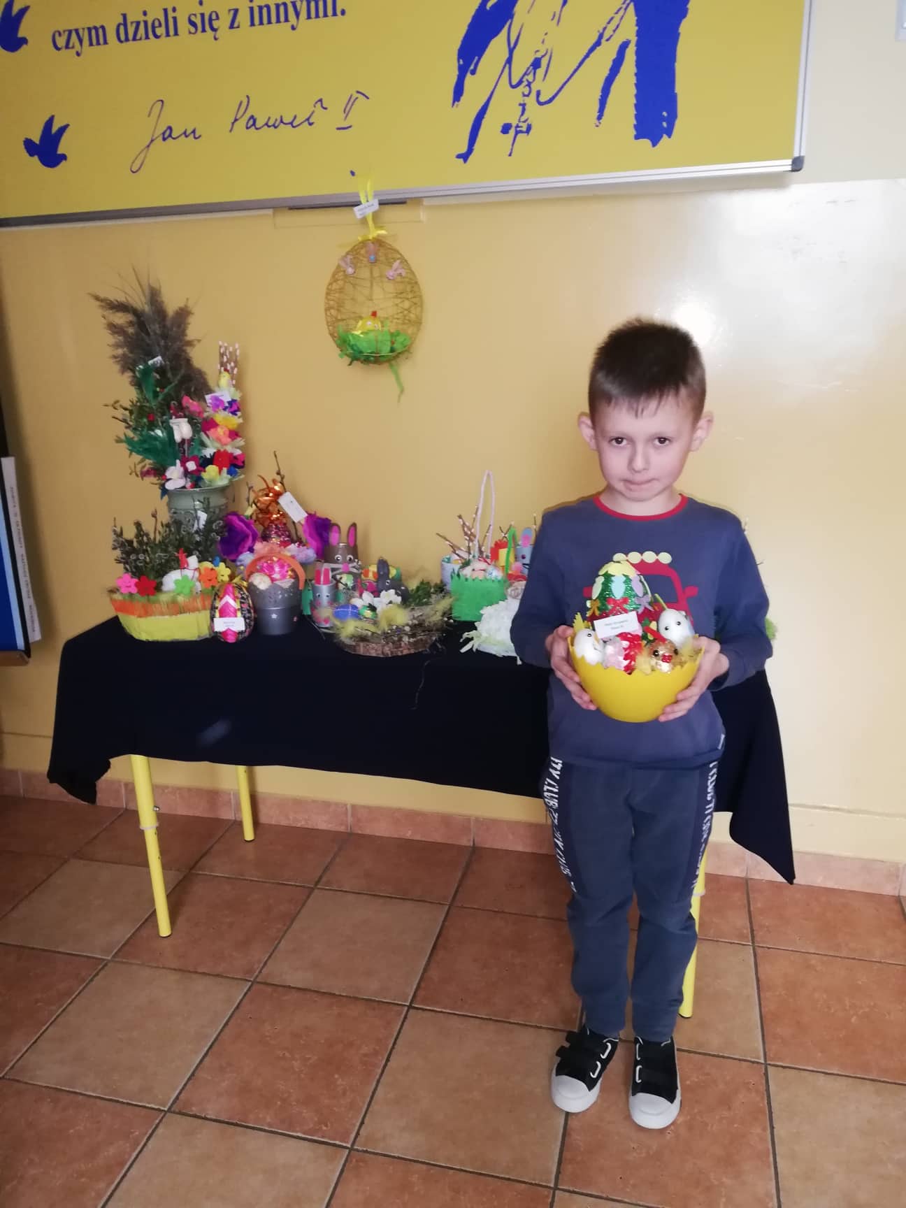 Przed świętami uczniowie naszej szkoły przygotowali prace na szkolny konkurs plastyczny "Ozdoby wielkanocnego stołu." Celem konkursu było kultywowanie tradycji oraz pogłębienie wiedzy na temat symboliki Świąt Wielkanocnych. Prace były bardzo ciekawe i pomysłowe, prezentowały różne techniki plastyczne. Palmy, pisanki, baranki, zajączki i koszyczki wielkanocne w okresie przedświątecznym ozdobiły szkolny korytarz, a wiosenne odcienie zieleni i żółci przykuwały wzrok. Wszystkie dzieci po powrocie do szkoły otrzymają pamiątkowe dyplomy. Uczestnikom konkursu gratulujemy zdolności plastycznych.
