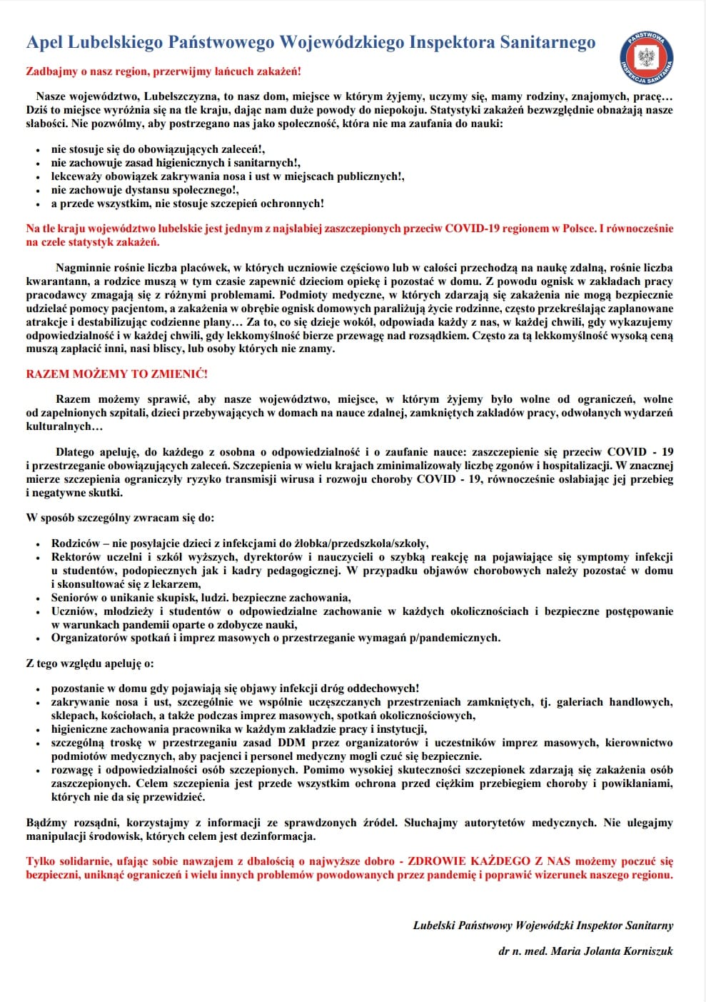 Apel Lubelskiego Państwowego Wojewódzkiego Inspektora Sanitarnego