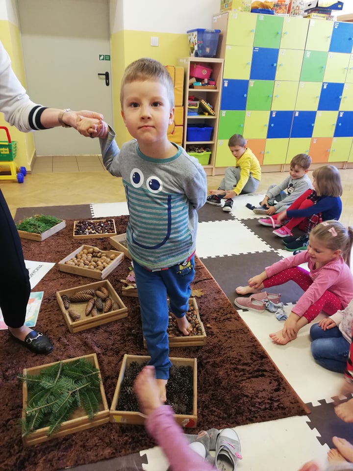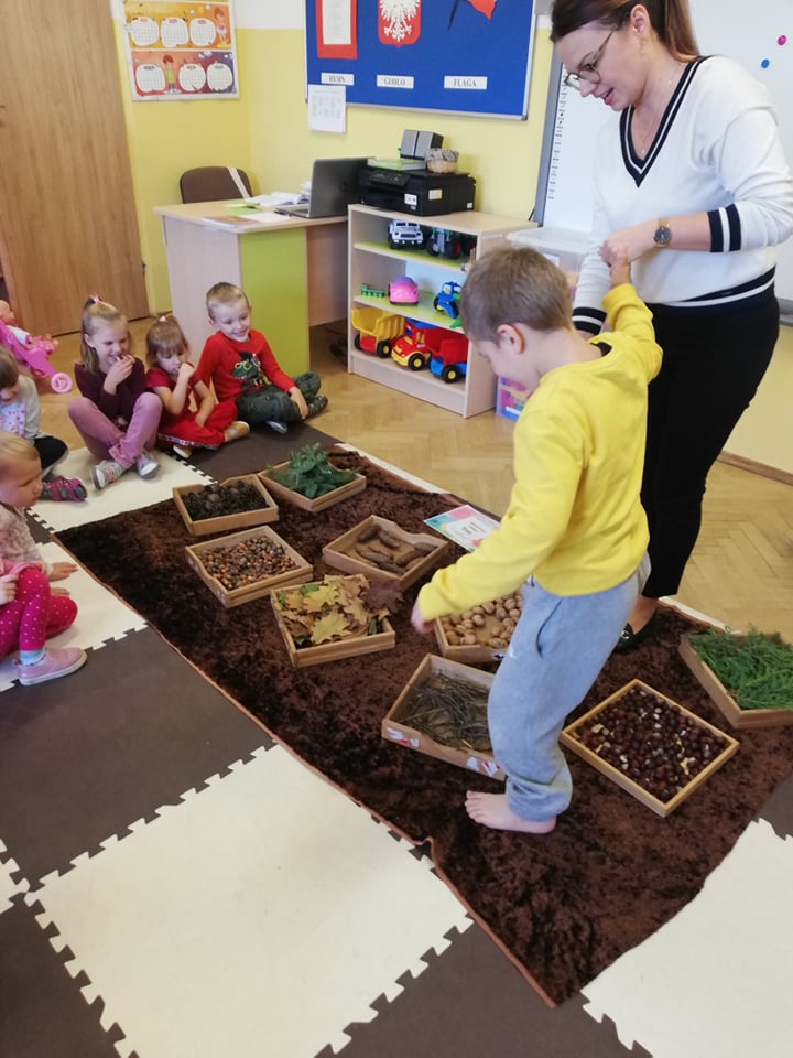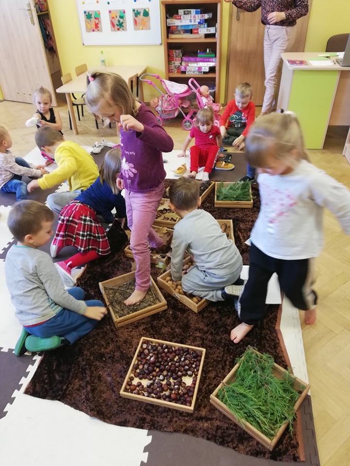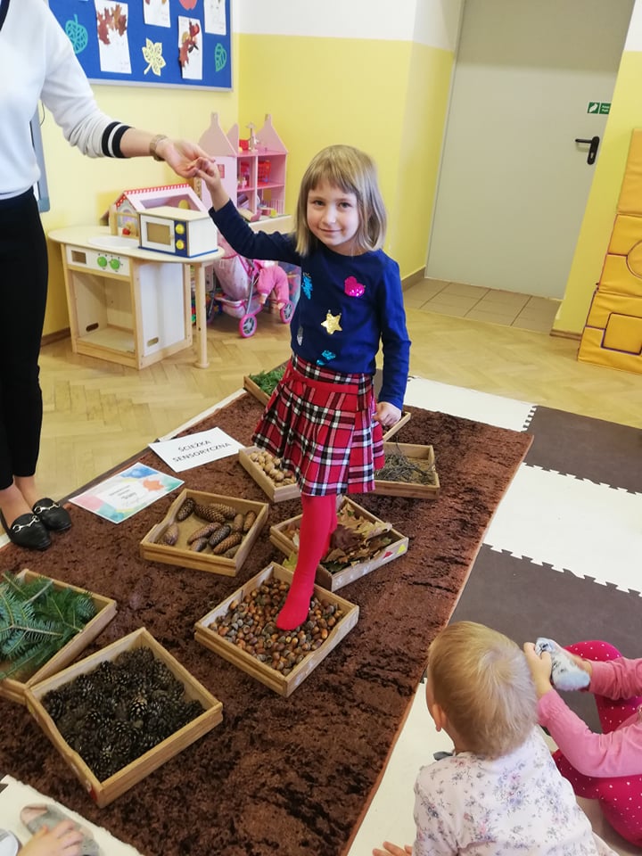 Przedszkolaki z oddziału 3-5 latków biorą udział w Ogólnopolskim Projekcie Edukacyjnym „Gramy Zmysłami”. Głównym celem projektu jest innowacyjne i kreatywne podejście do tematyki rozwijania zmysłów u dzieci. Co miesiąc będzie realizowane jedno zadanie. W październiku była to jesienna ścieżka sensoryczna. Dzieci rozwijały zmysł dotyku, sprawność motoryczną, równowagę i węch. Ścieżka wykonana z darów jesieni sprawiła dzieciom mnóstwo radości. Czekamy na kolejne zadania!