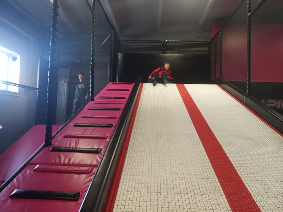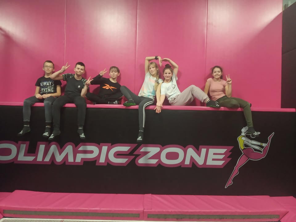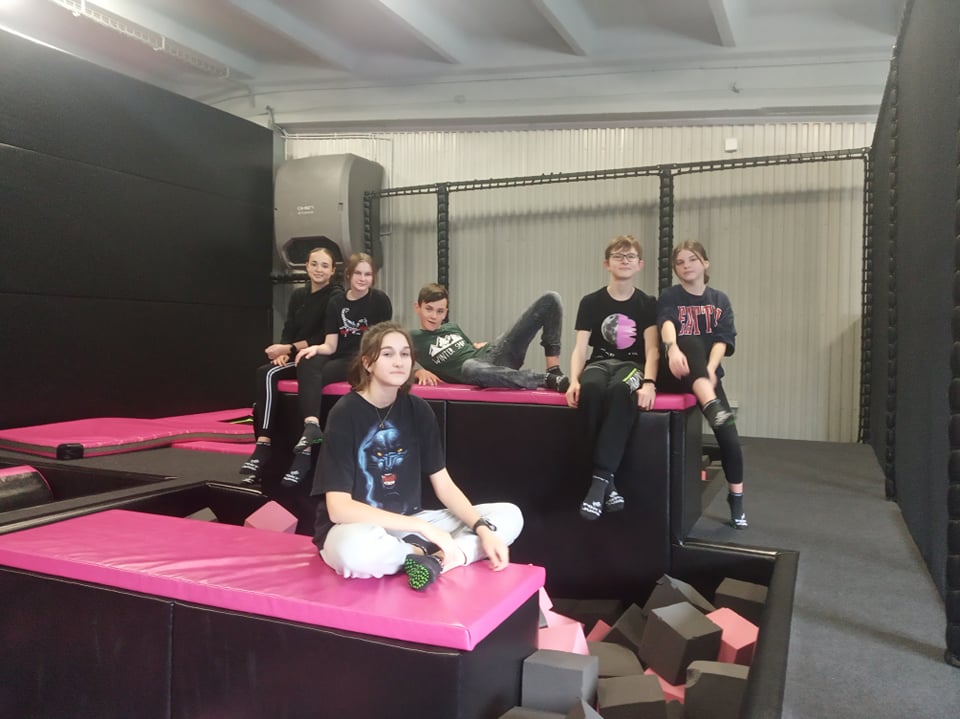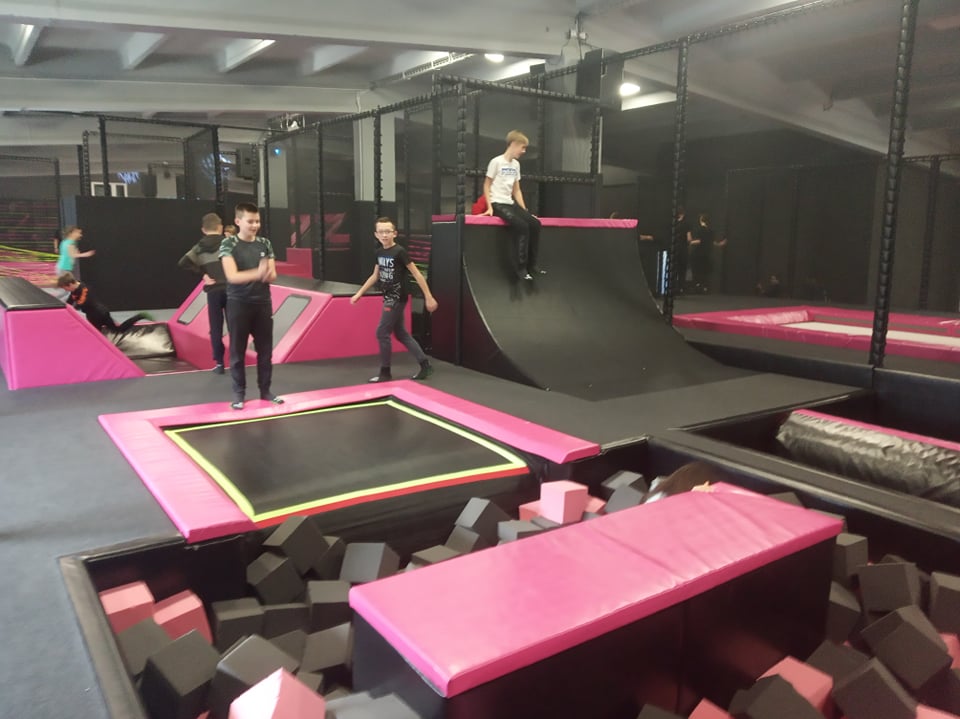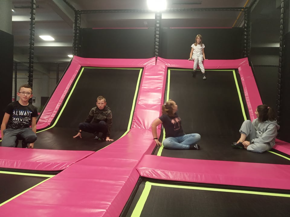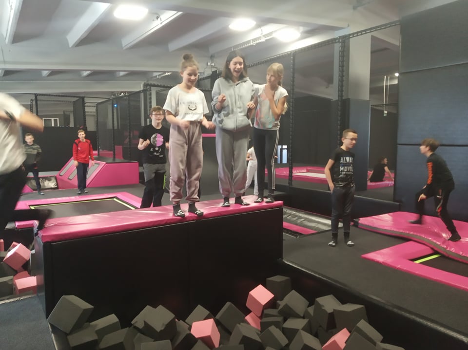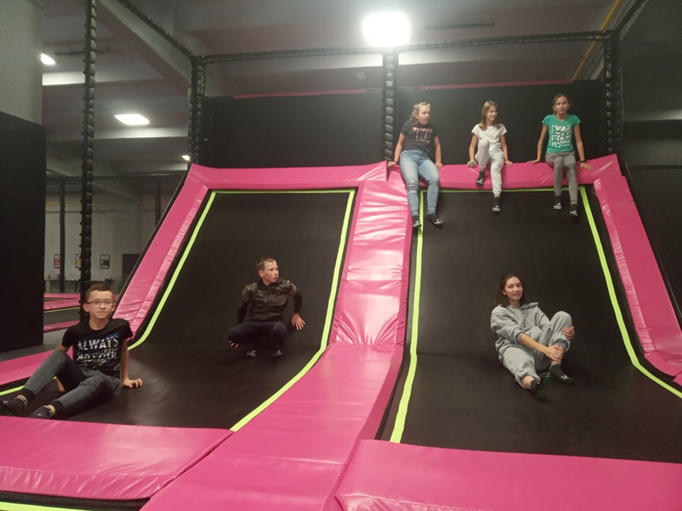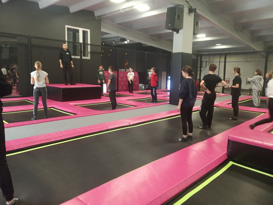 Po seansie filmowym przyszedł czas na aktywną część wycieczki. Wszyscy udali się do parku trampolin Fort Jump. Po zaopatrzeniu w specjalne skarpetki antypoślizgowe oraz po wykonaniu krótkiej rozgrzewki prowadzonej przez trenera, uczniowie zaczęli korzystać ze wszystkich dostępnych w parku atrakcji. Pod okiem specjalistów wykonywali przeróżne akrobacje. Okazało się, że wiele osób mogło pochwalić się nieprawdopodobnymi umiejętnościami w tym zakresie.