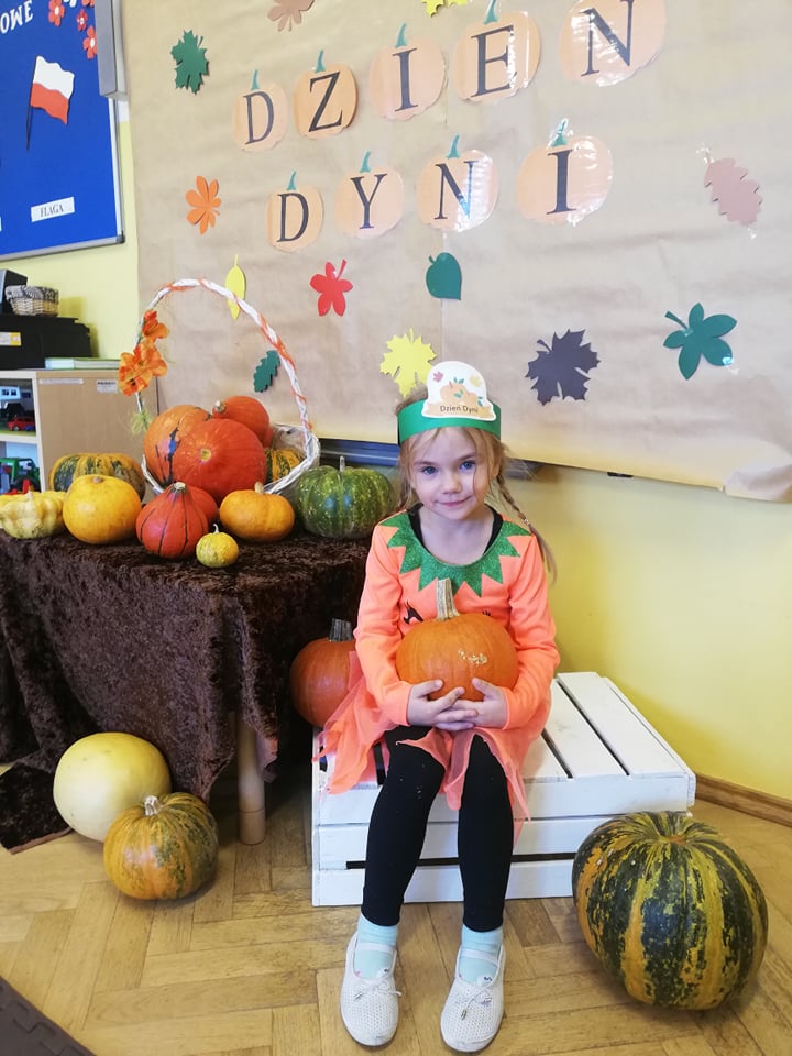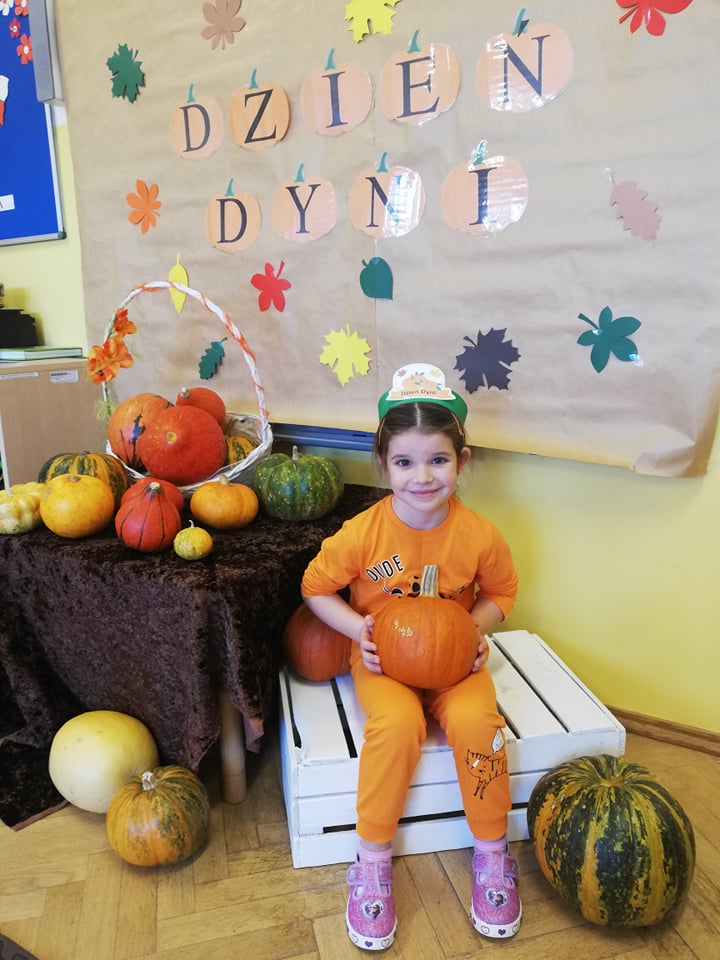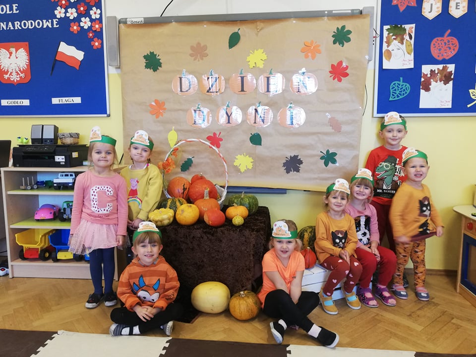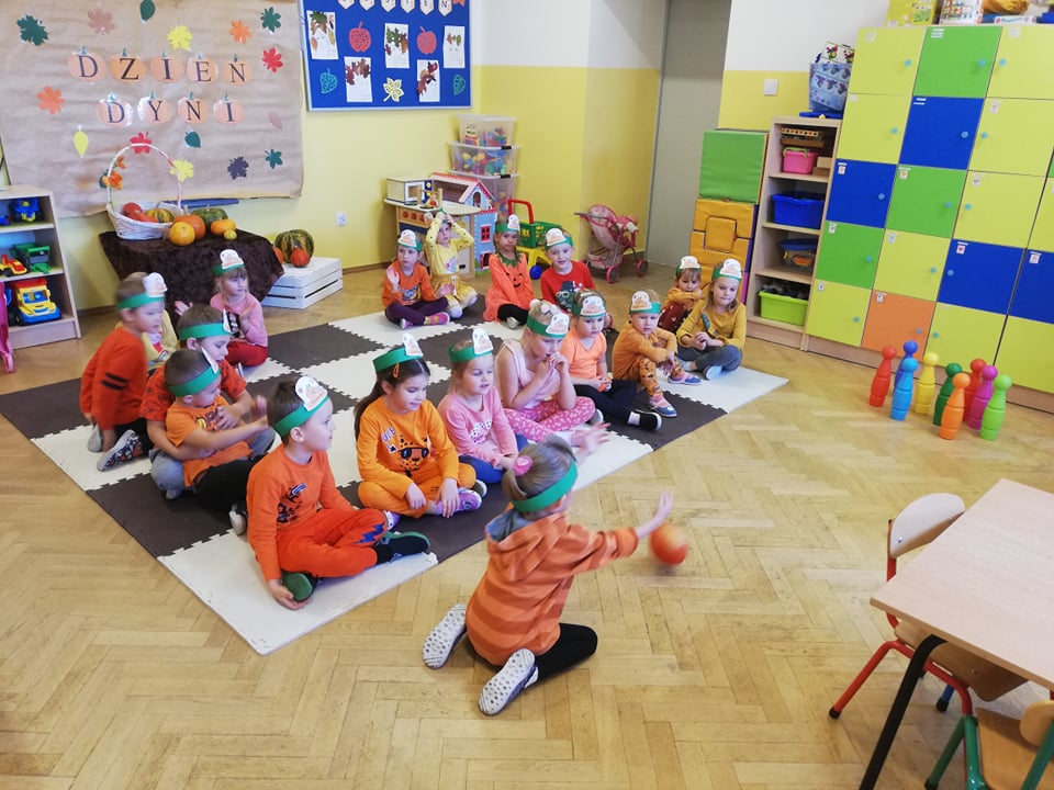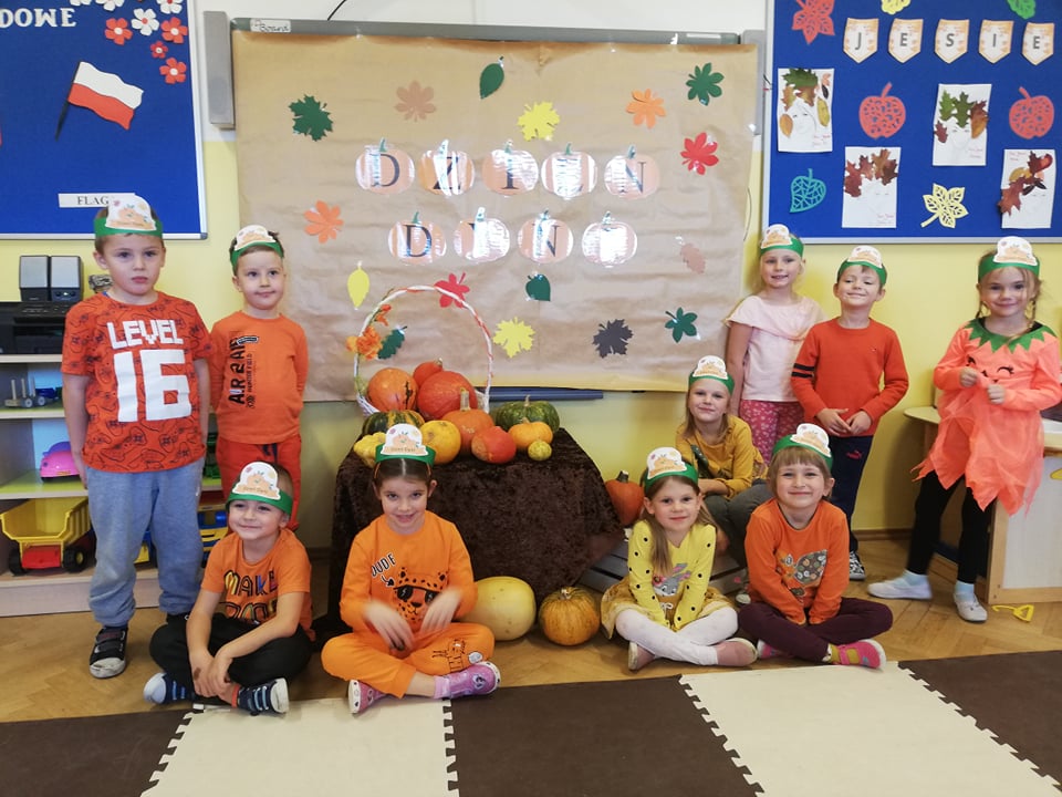 29 października przedszkolaki z grupy 3-5 latków obchodziły ,,Dzień Dyni''. Dzieci poznały jak zdrowe i urodziwe jest to warzywo. Tego dnia królował u nas kolor pomarańczowy. Przedszkolaki przyniosły do przedszkola dynie, co pozwoliło poznać wielką różnorodność dyń oraz wzbogaciło wiedzę przedszkolaków na ich temat. Dzieci wzięły udział w zabawach z dynią; były dyniowe kręgle, zabawa ,,Części ciała i dynia" oraz slalom z dynią. Przedszkolaki wykonały również pracę plastyczną, której tematem była oczywiście dynia. Na zakończenie tego dnia były pamiątkowe zdjęcia wśród naszych pięknych dyń.