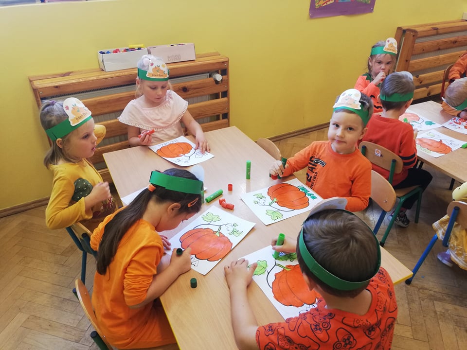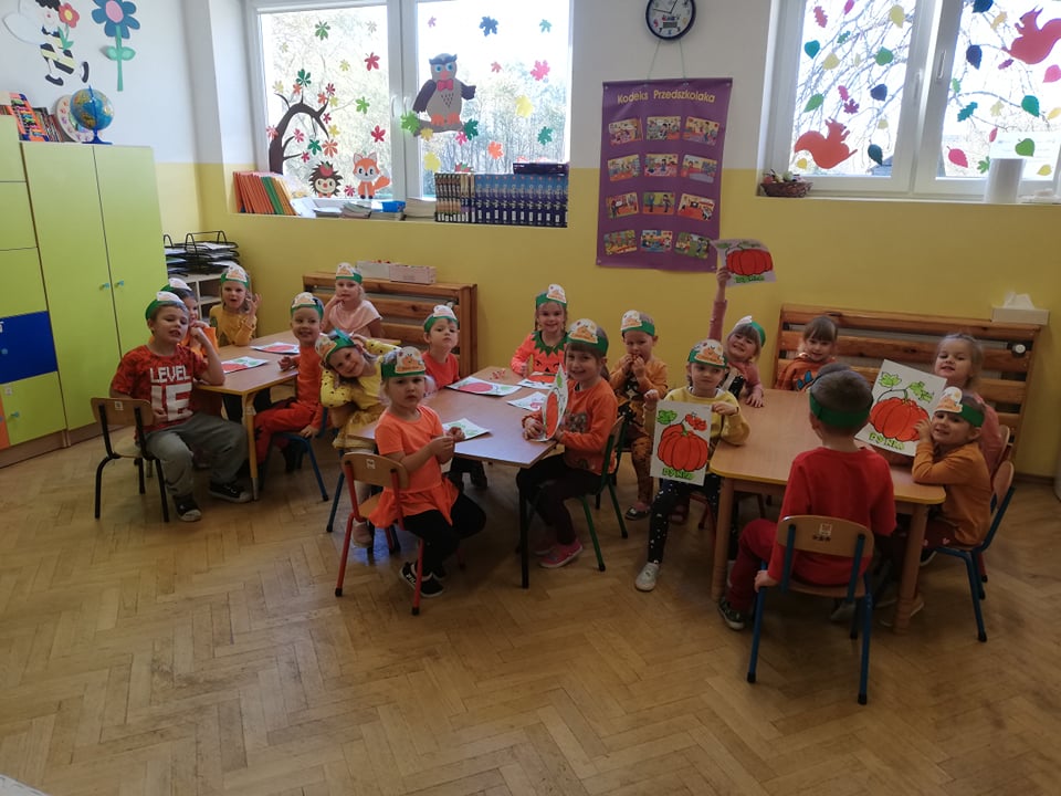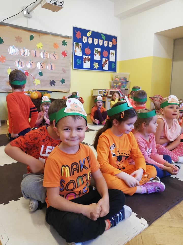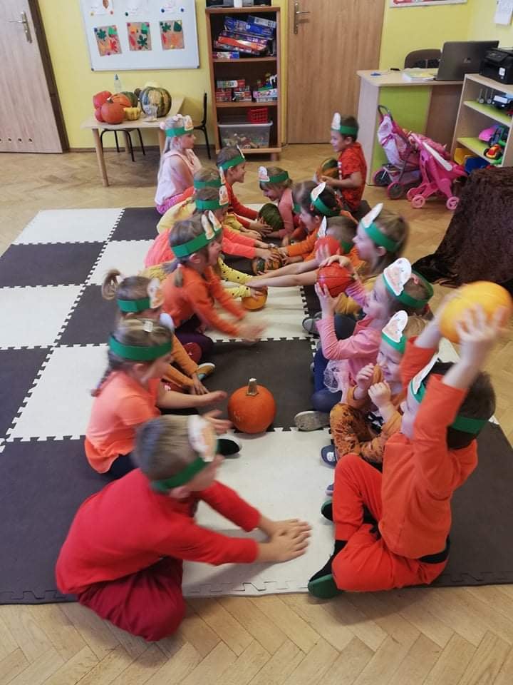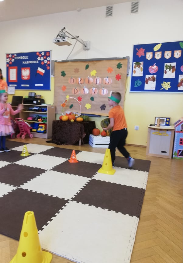 29 października przedszkolaki z grupy 3-5 latków obchodziły ,,Dzień Dyni''. Dzieci poznały jak zdrowe i urodziwe jest to warzywo. Tego dnia królował u nas kolor pomarańczowy. Przedszkolaki przyniosły do przedszkola dynie, co pozwoliło poznać wielką różnorodność dyń oraz wzbogaciło wiedzę przedszkolaków na ich temat. Dzieci wzięły udział w zabawach z dynią; były dyniowe kręgle, zabawa ,,Części ciała i dynia" oraz slalom z dynią. Przedszkolaki wykonały również pracę plastyczną, której tematem była oczywiście dynia. Na zakończenie tego dnia były pamiątkowe zdjęcia wśród naszych pięknych dyń.