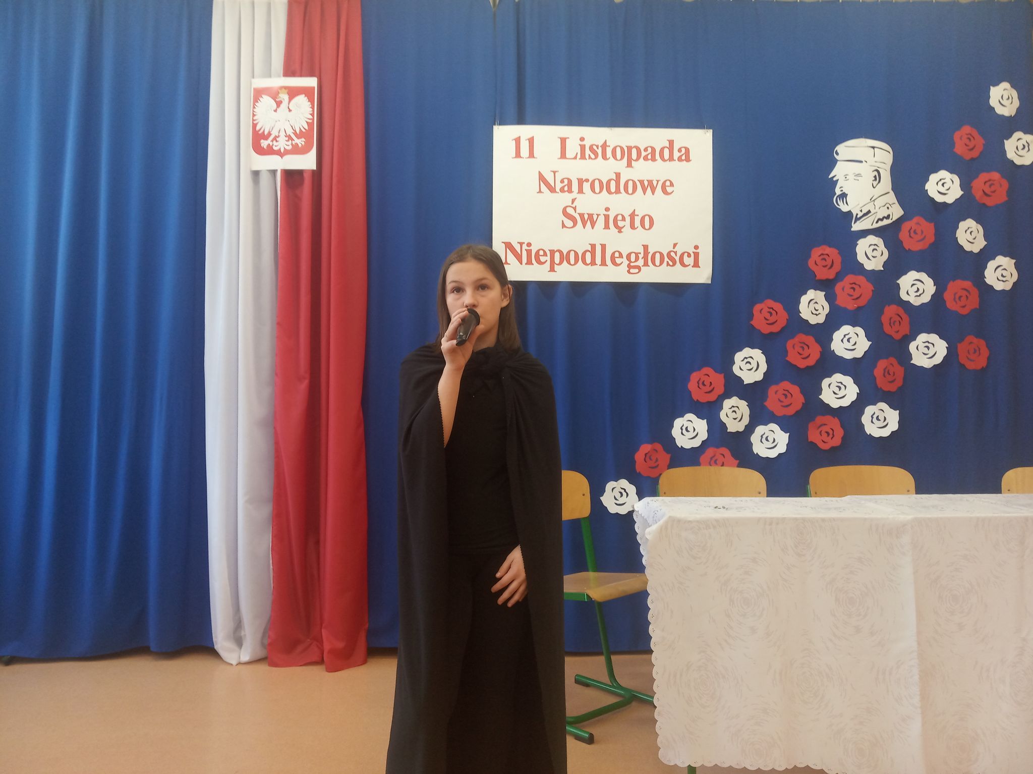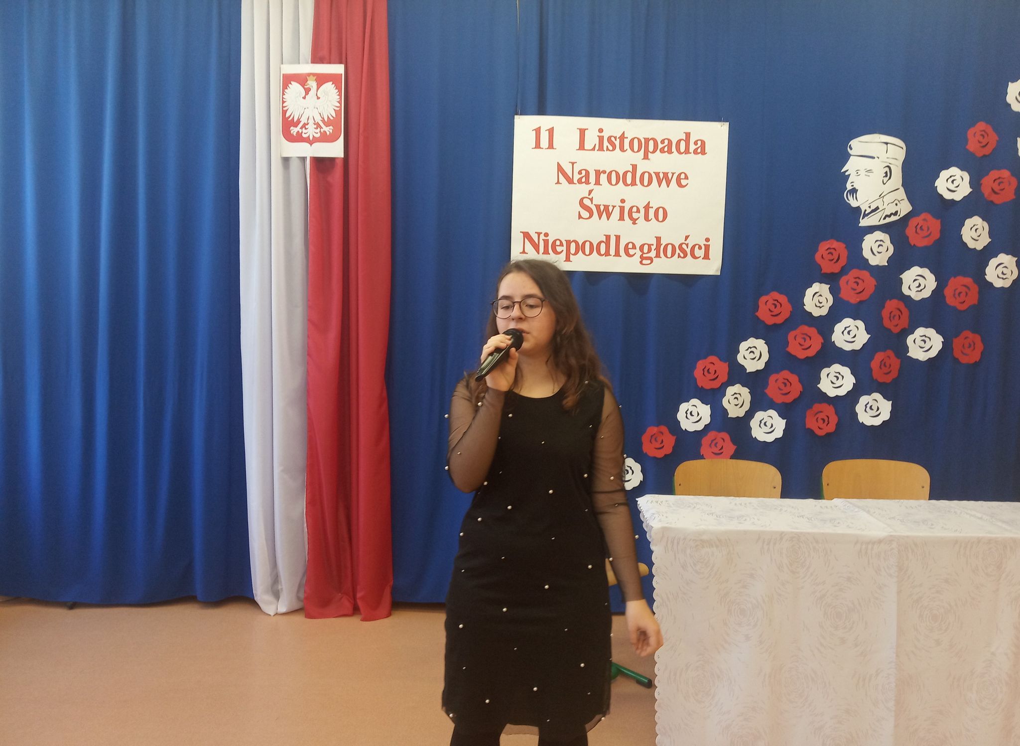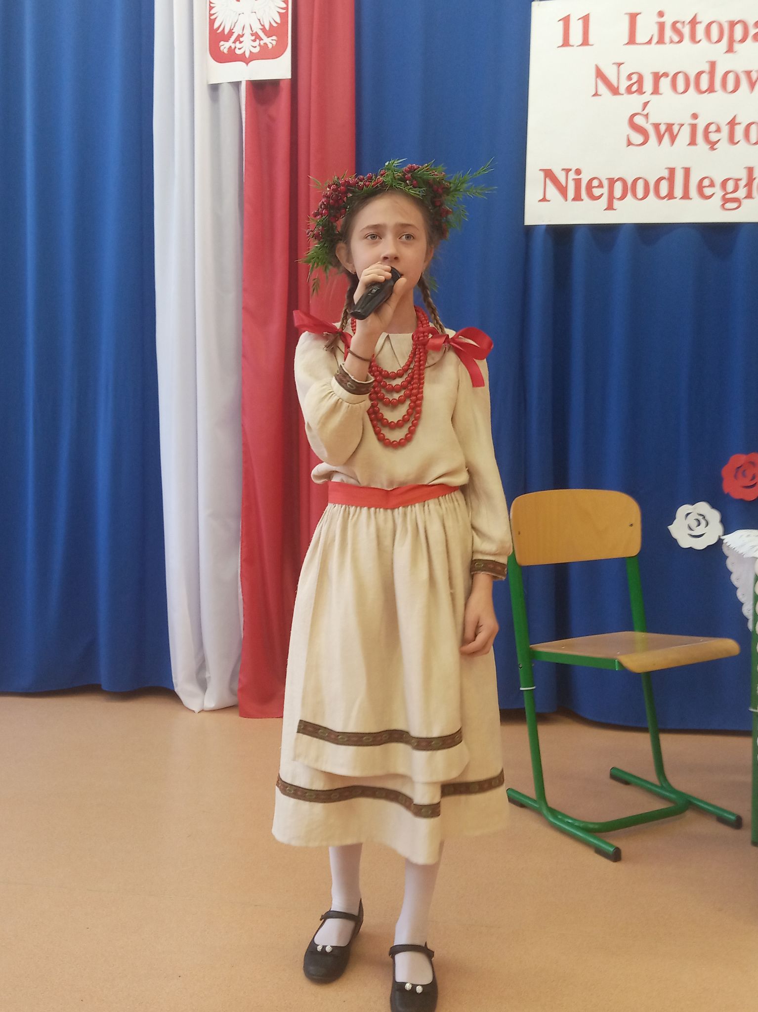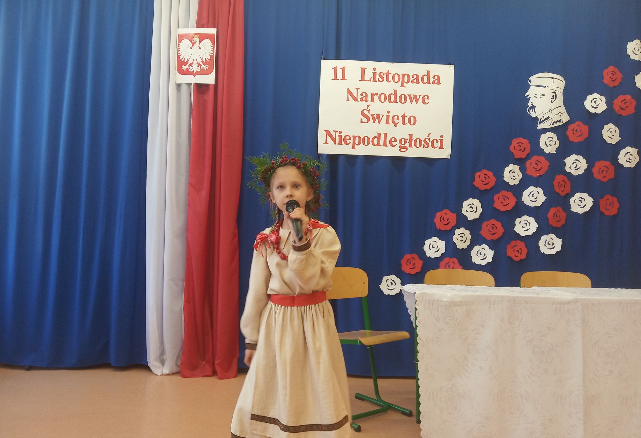 Następnie narratorzy przybliżyli wydarzenia historyczne, które przyczyniły się do odbudowania autonomii kraju. Zwrócili uwagę na to, jak ważna jest wiedza na temat przeszłości swego narodu. Uroczystość uświetniły wiersze oraz piosenki o tematyce patriotycznej.