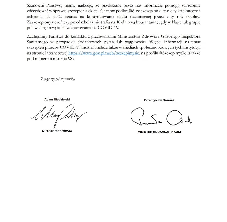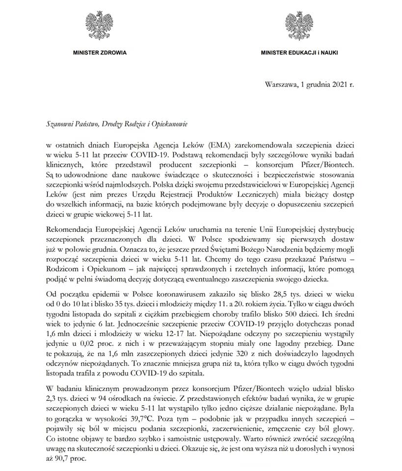 List Ministra Edukacji i Nauki oraz Ministra Zdrowia w sprawie szczepień dzieci w wieku 5-11 lat 2021-12-05 « powrót