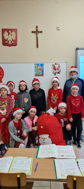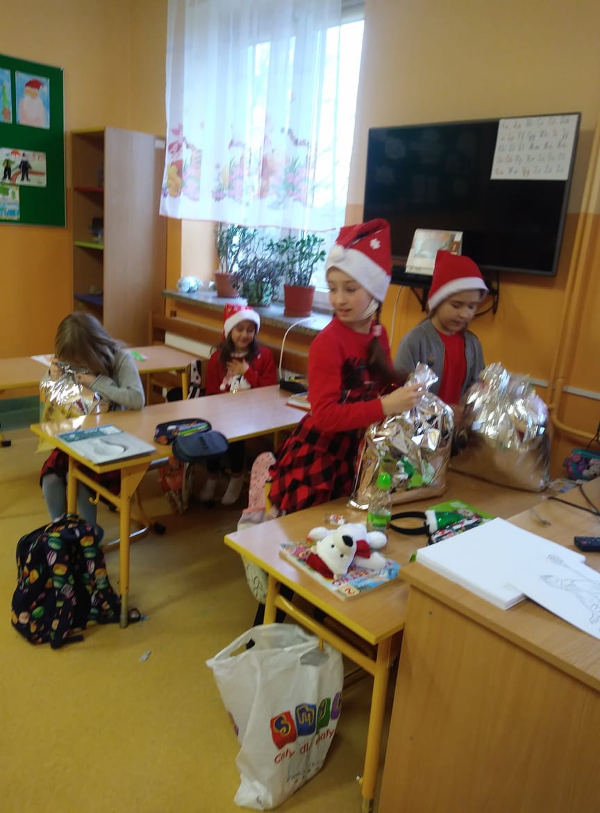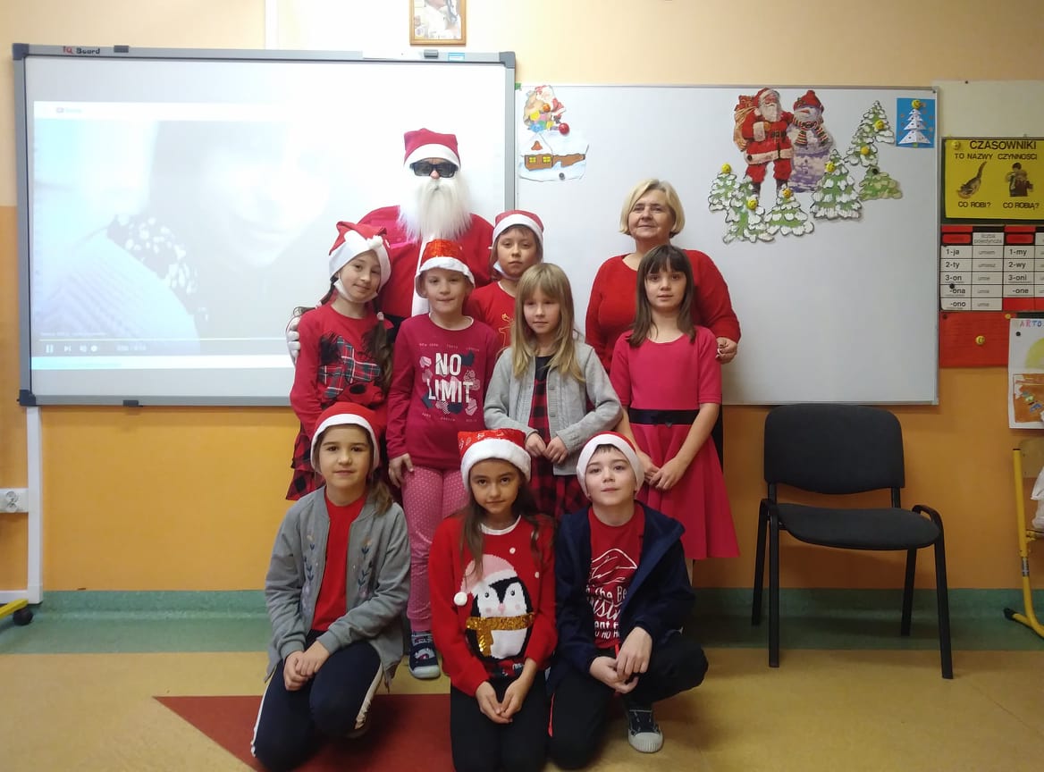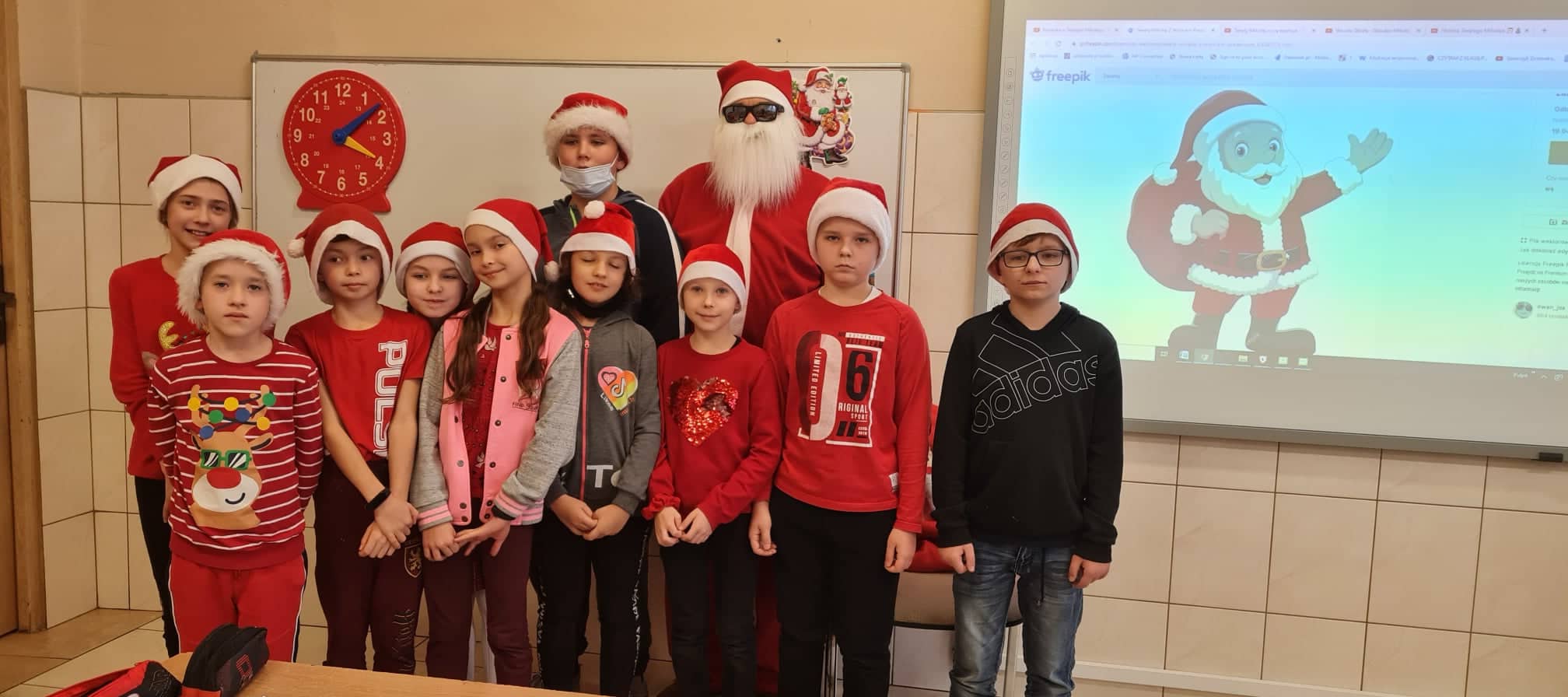 6 grudnia dzieci z klas 1-3 oraz starsi uczniowie ubrani na czerwono i w pięknych mikołajkowych czapkach z niecierpliwością oczekiwali na przybycie Świętego Mikołaja. Powitali go z wielką radością. Mikołaj wręczył uczniom prezenty. Było dużo radości i uśmiechów. Na pożegnanie dzieci złożyły Świętemu Mikołajowi obietnicę, że będą grzeczne przez następnych dwanaście miesięcy. Mikołaj na pewno odwiedzi naszą szkołę w następnym roku szkolnym. Dziękujemy święty Mikołaju za prezenty i zapraszamy za rok.