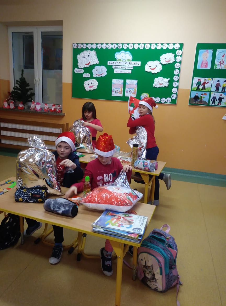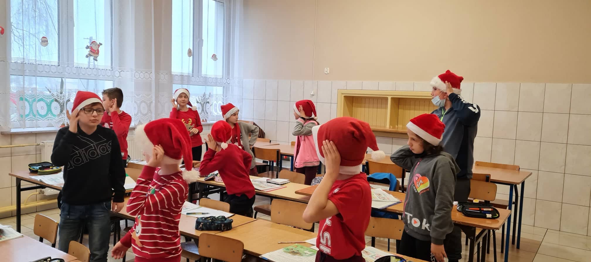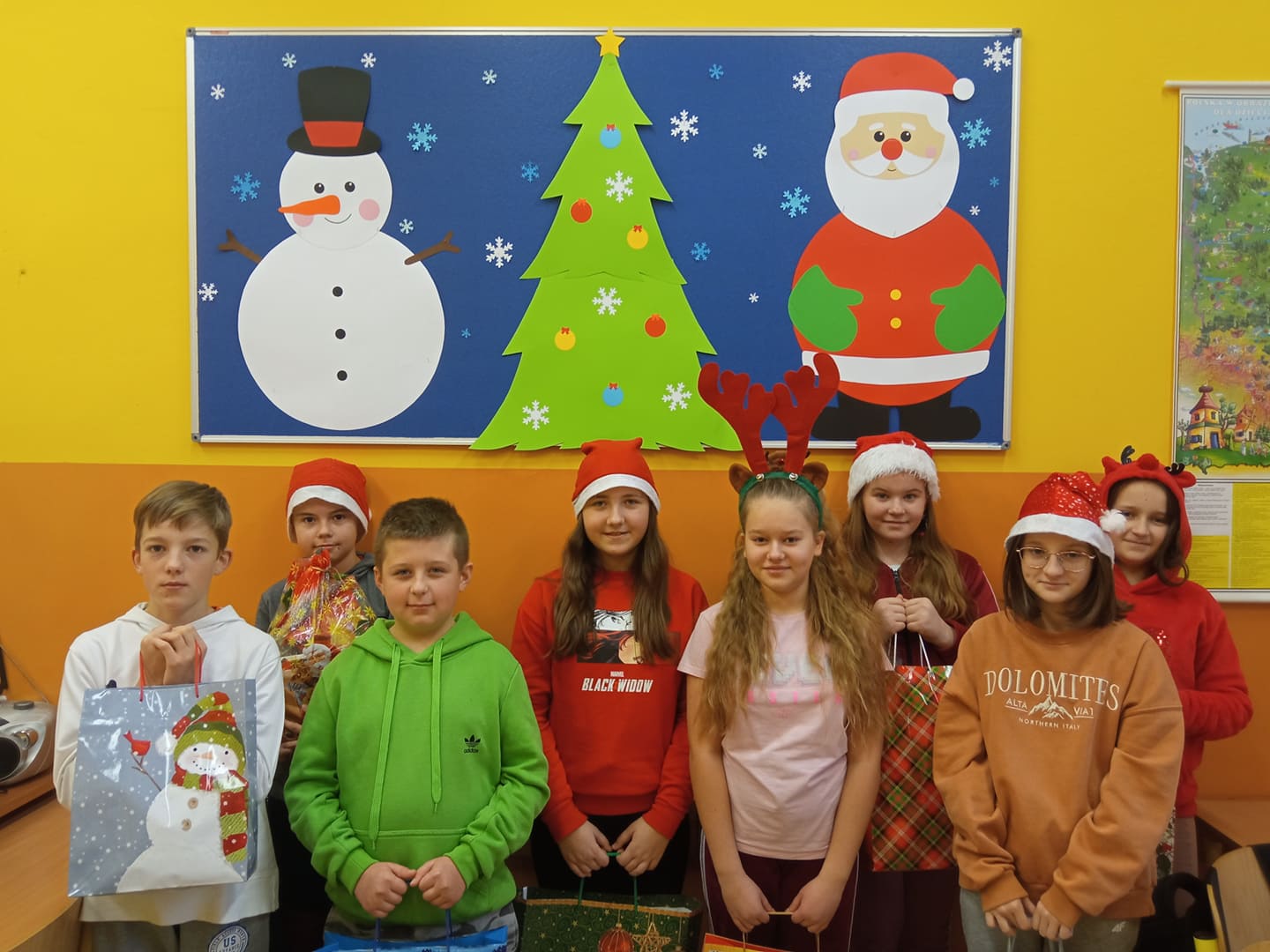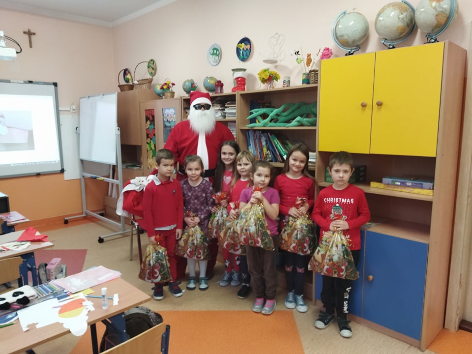 6 grudnia dzieci z klas 1-3 oraz starsi uczniowie ubrani na czerwono i w pięknych mikołajkowych czapkach z niecierpliwością oczekiwali na przybycie Świętego Mikołaja. Powitali go z wielką radością. Mikołaj wręczył uczniom prezenty. Było dużo radości i uśmiechów. Na pożegnanie dzieci złożyły Świętemu Mikołajowi obietnicę, że będą grzeczne przez następnych dwanaście miesięcy. Mikołaj na pewno odwiedzi naszą szkołę w następnym roku szkolnym. Dziękujemy święty Mikołaju za prezenty i zapraszamy za rok.