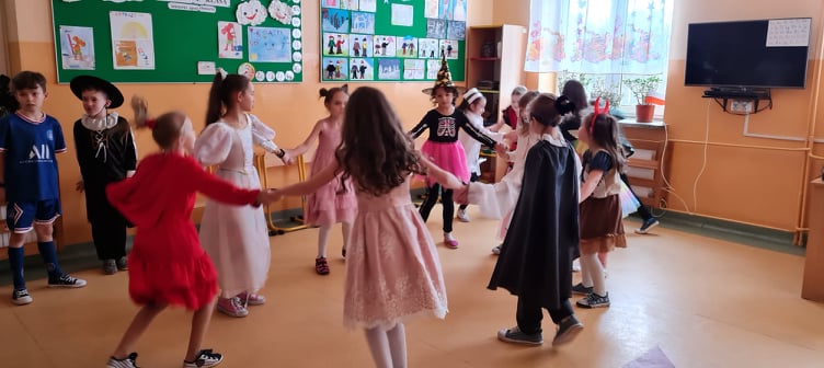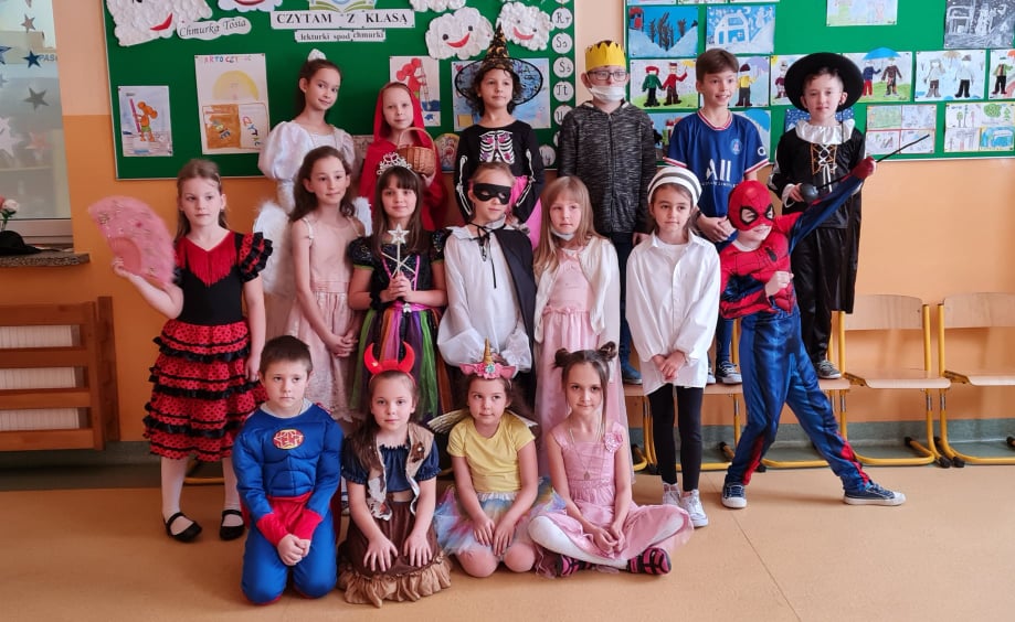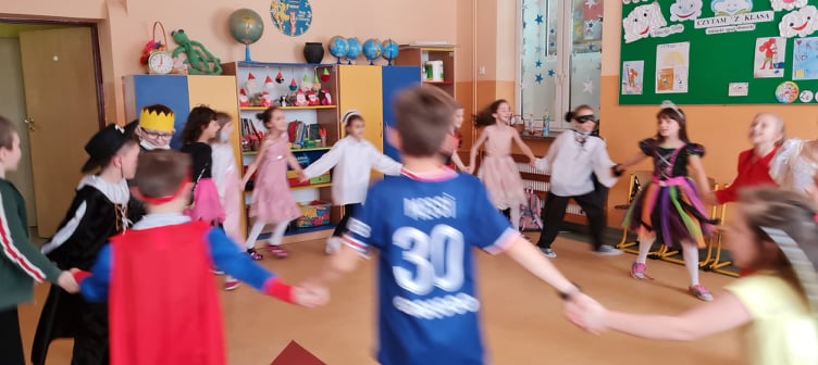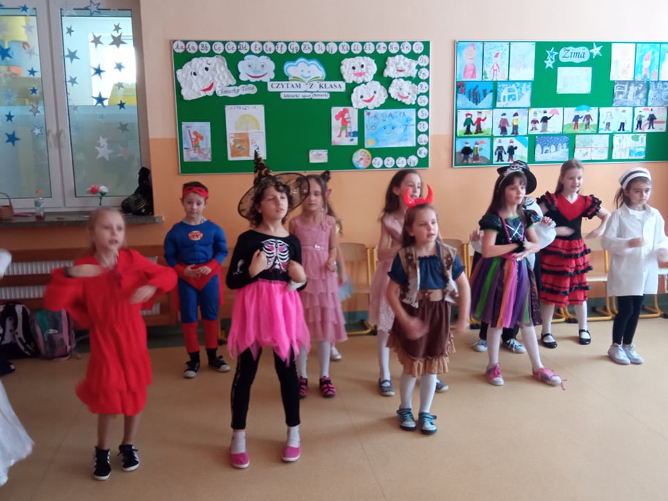 Karnawałowy bal przebierańców to dla dzieci z klas I-III dzień niezwykły, często wyczekiwany przez wiele tygodni. Jest atrakcją bardzo lubianą przez uczniów, dostarczającą im wielu przeżyć i radości. Podczas takiego wydarzenia dzieci mogą wcielić się w kogoś innego, przebrać się za znaną i lubianą postać bajkową i wyglądać inaczej niż zwykle. Tak też było w dniu 3 lutego 2022 r. Dzieci przebrane były za bohaterów znanych bajek, można było zobaczyć: wróżki, królewny, motylki, Spidermanów, Zorro, Czerwonego Kapturka. Swoją obecnością zaszczycił nas nawet Messi. Na sali podczas pląsów robiło się kolorowo, wszyscy bawili się wesoło, uśmiech nie znikał z twarzy mimo chwilowego zmęczenia. Bal umożliwił dzieciom i wychowawcom spędzenie czasu w miłej atmosferze. Wspólna zabawa przyniosła wiele radości naszym wychowankom. Kiedy czas zabawy dobiegł końca dzieci z żalem opuszczały salę balową. Dziękujemy uczniom i rodzicom za zaangażowanie w przygotowanie pięknych balowych strojów.