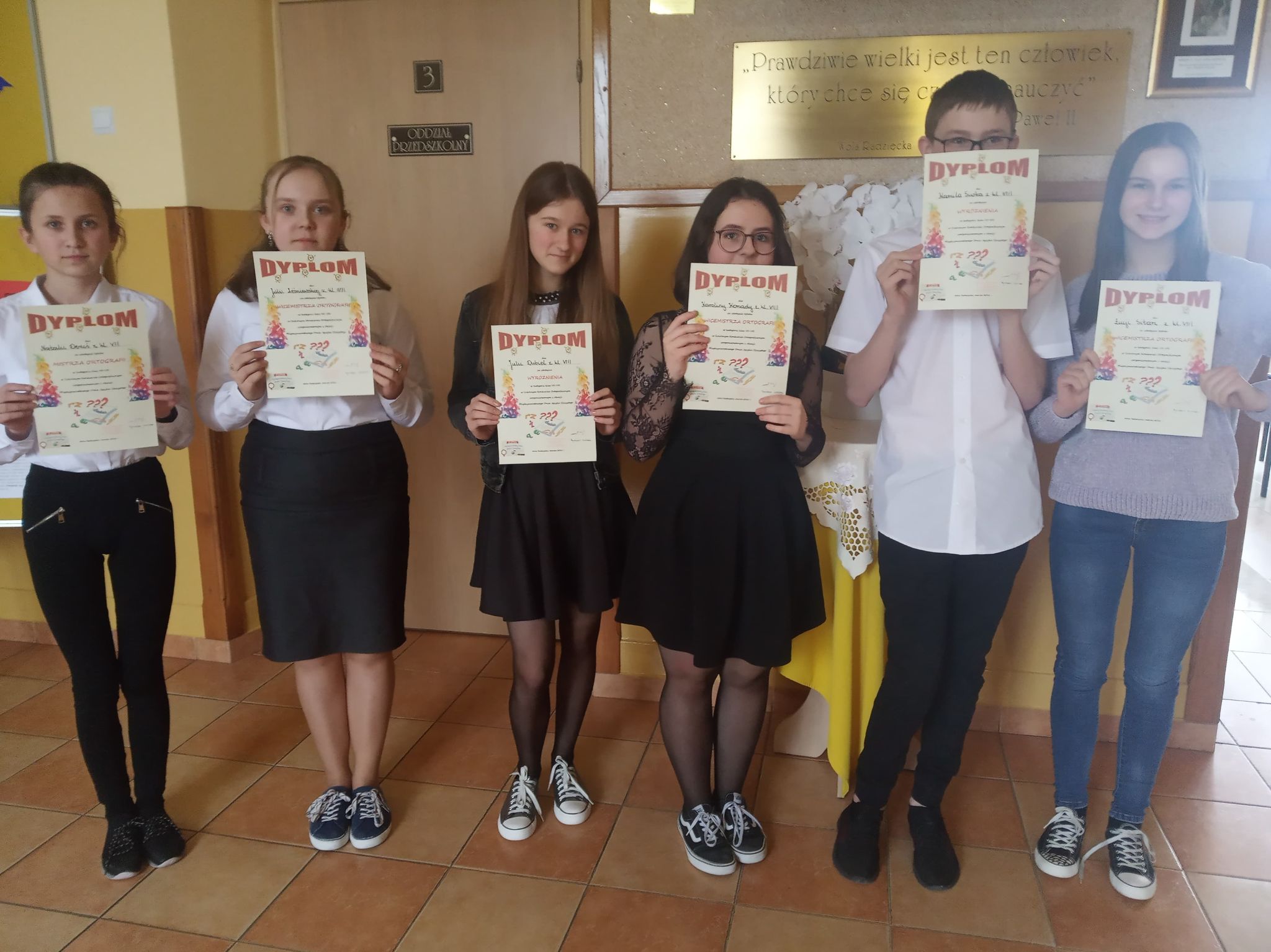 Wicemistrzowie ortografii: Julia Leśniewska (kl. VII), Karolina Komada (kl. VIII), Łucja Sitarz (kl. VIII)