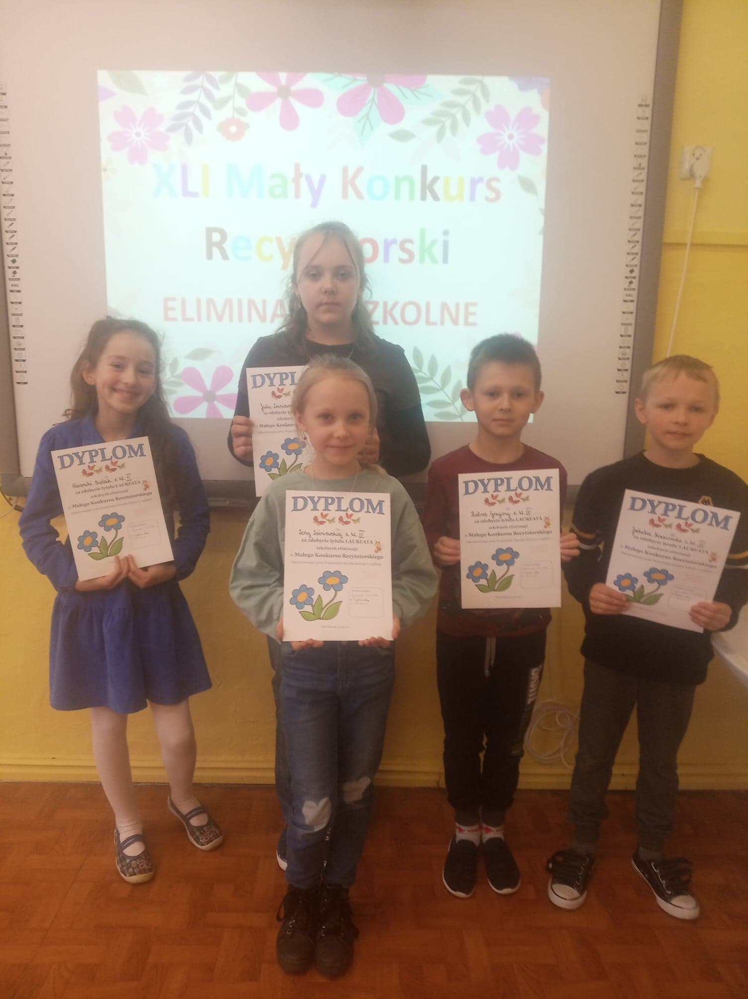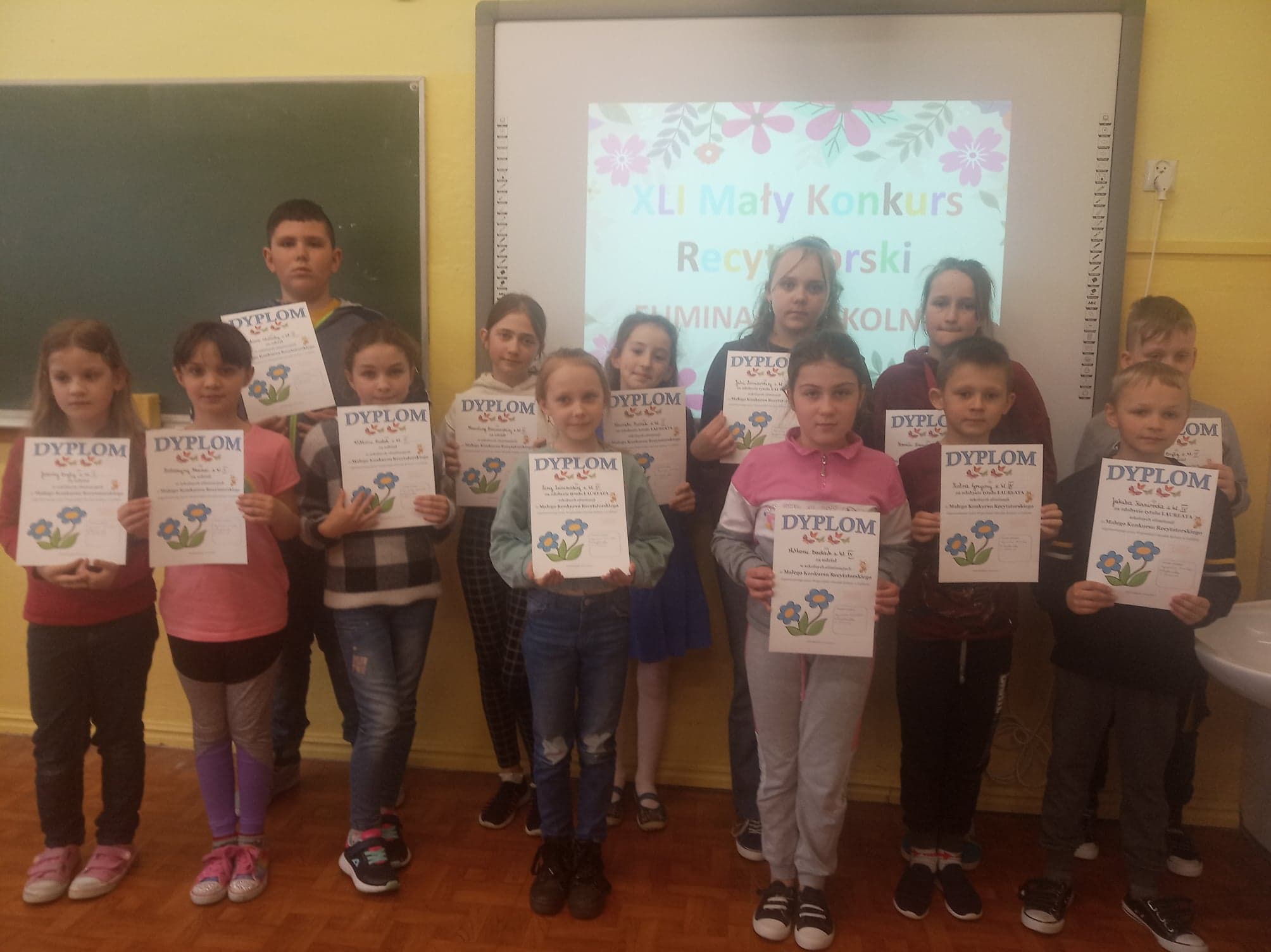 20 kwietnia w naszej szkole odbyły się eliminacje do Małego Konkursu Recytatorskiego organizowanego przez Wojewódzki Ośrodek Kultury w Lublinie. W zmaganiach wzięło udział czternastu uczniów z klas II-VII. Wszyscy pięknie zaprezentowali przygotowane wiersze oraz fragmenty prozy. Komisja konkursowa nie miała łatwego zadania, by wyłonić zwycięzców, tym bardziej, że do kolejnego etapu można było zakwalifikować jedynie pięć osób. Ostatecznie laureatami zostali:
