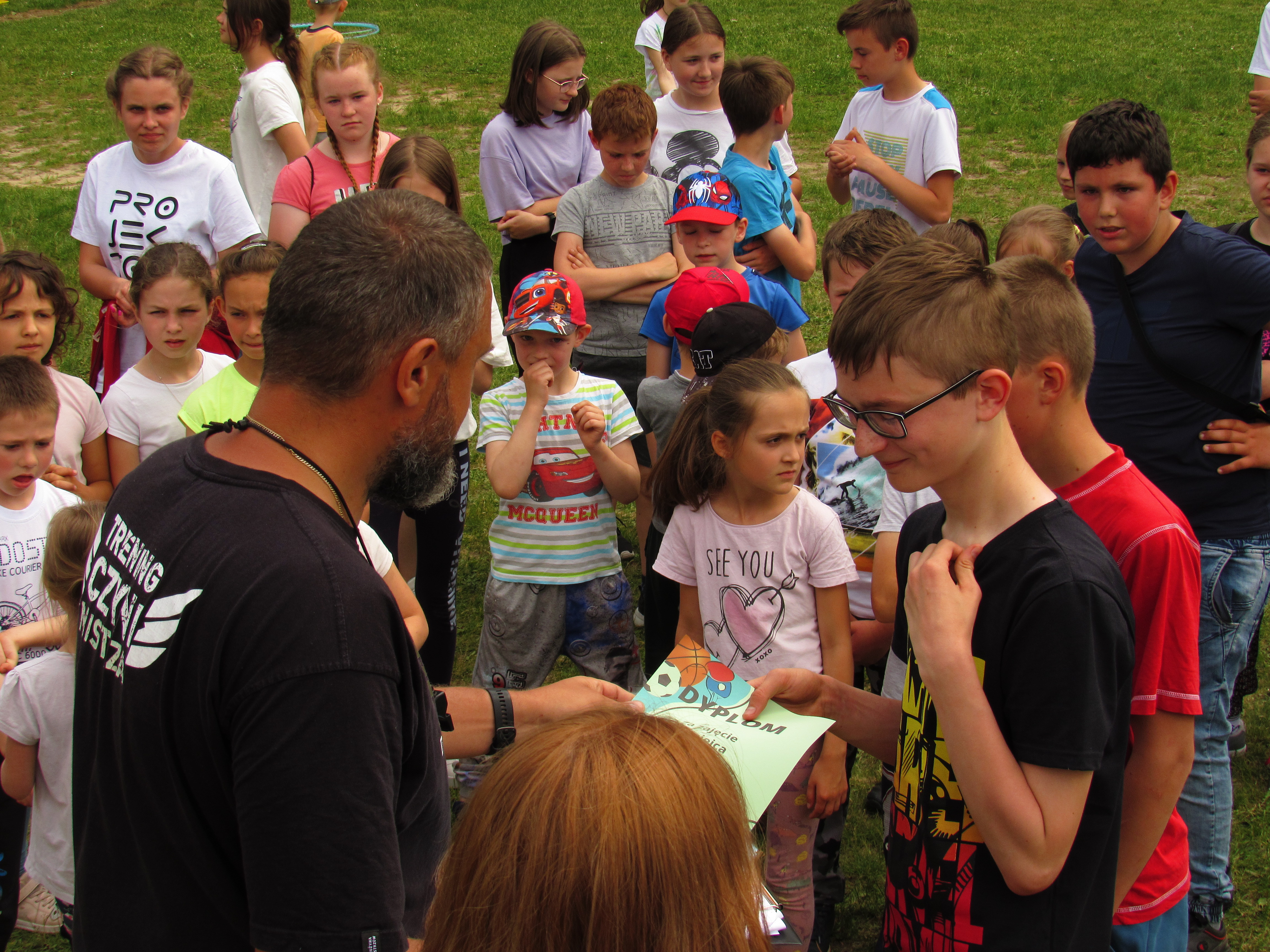 Na koniec został jeszcze rozegrany mecz w siatkówkę. Jedną drużynę stanowili uczniowie klasy VIII, a drugą – nauczyciele. Warto zaznaczyć, że tego typu mistrzostwa organizowane z okazji Dnia Dziecka stały się w naszej szkole już niemal tradycją. Jak zwykle na boisku nie brakowało emocji. Ostatnim punktem uroczystości było podsumowanie konkursów i rozgrywek. Wszyscy uczestnicy otrzymali słodkie upominki oraz dyplomy. Tak zakończył się ten niezapomniany dzień pełen wrażeń.