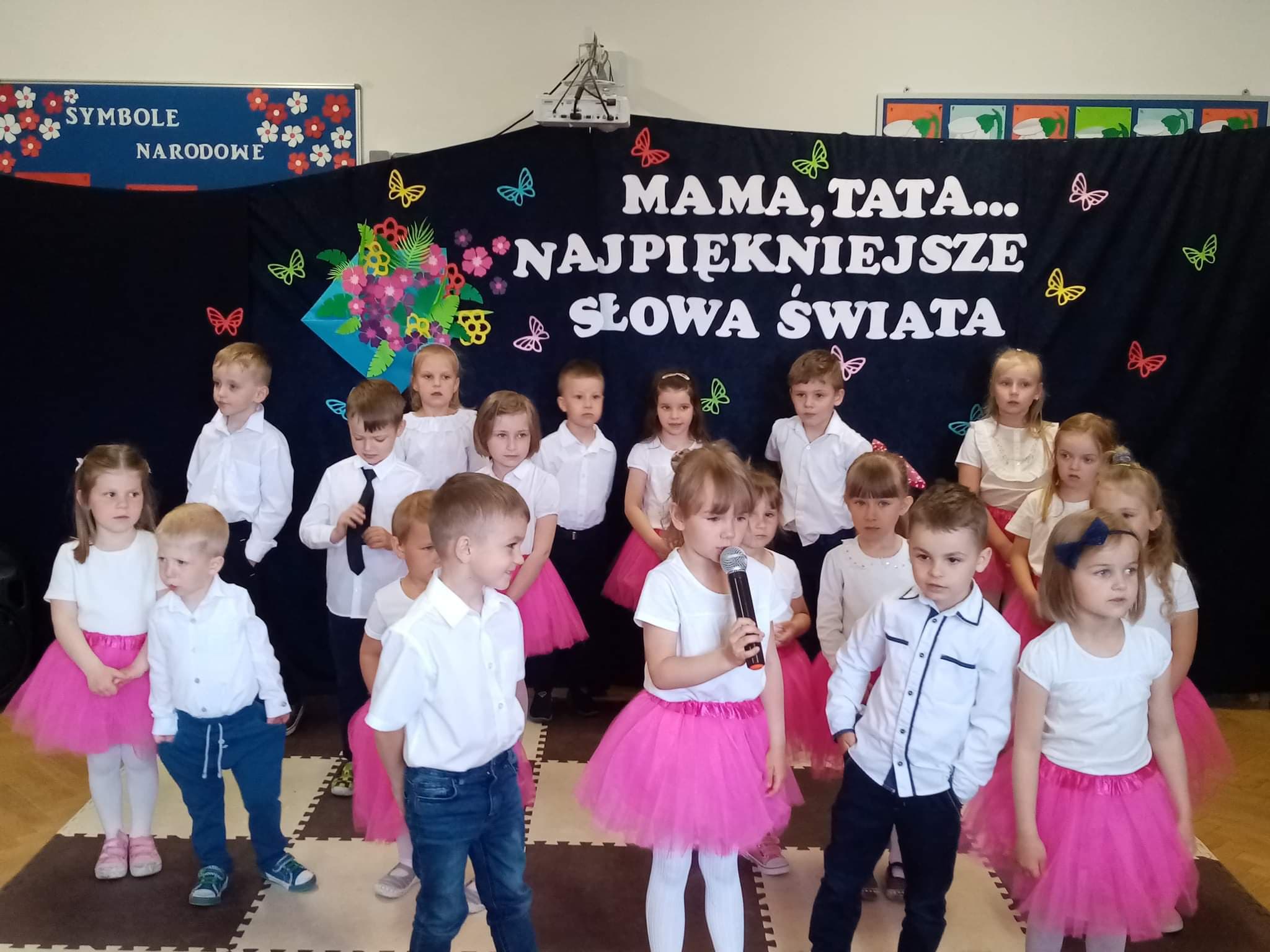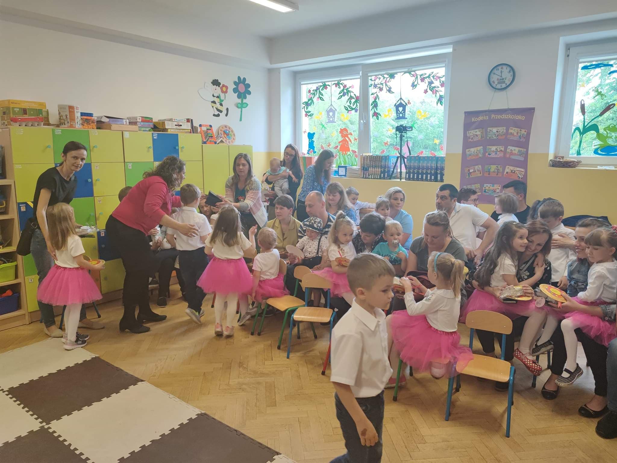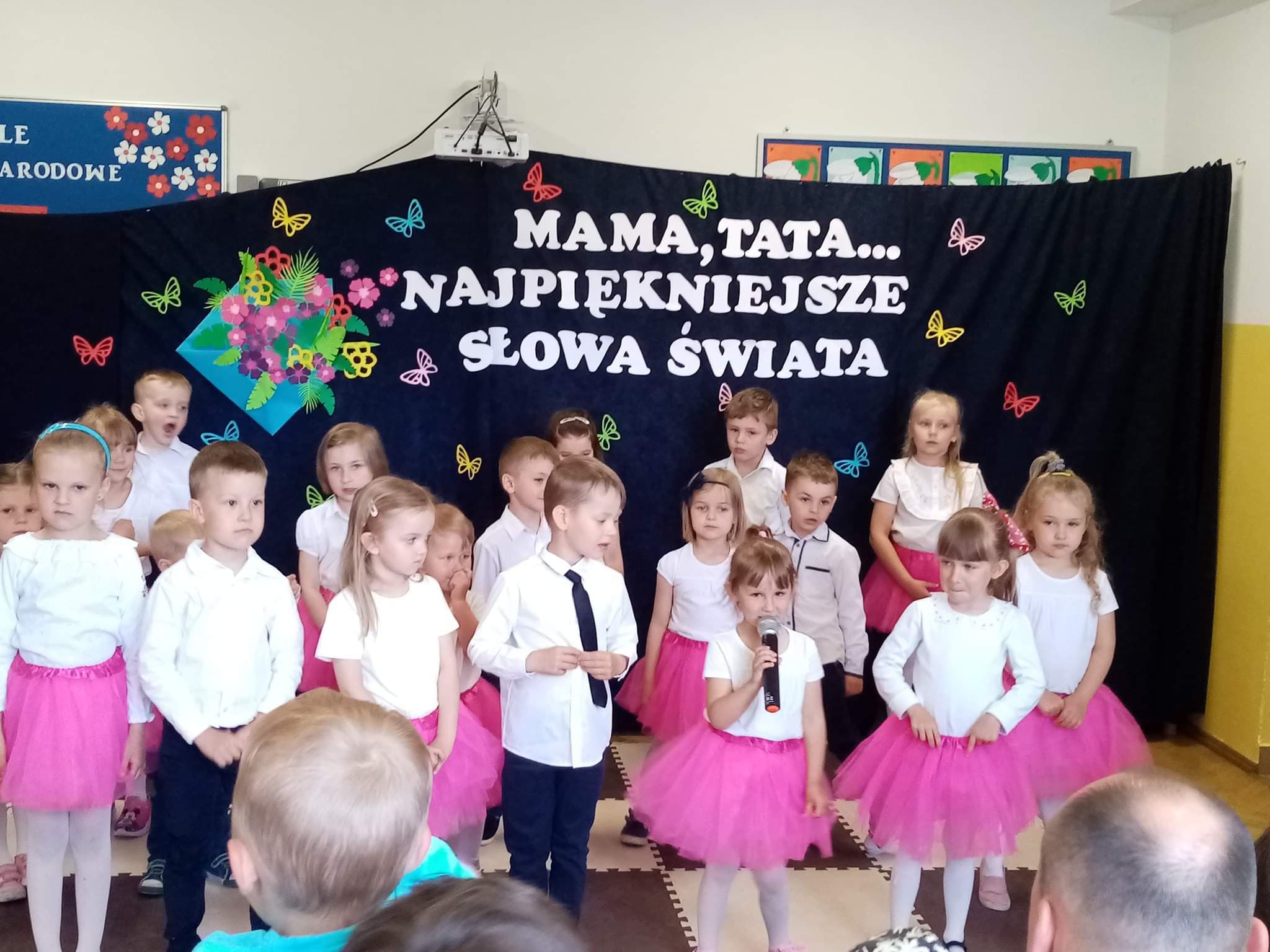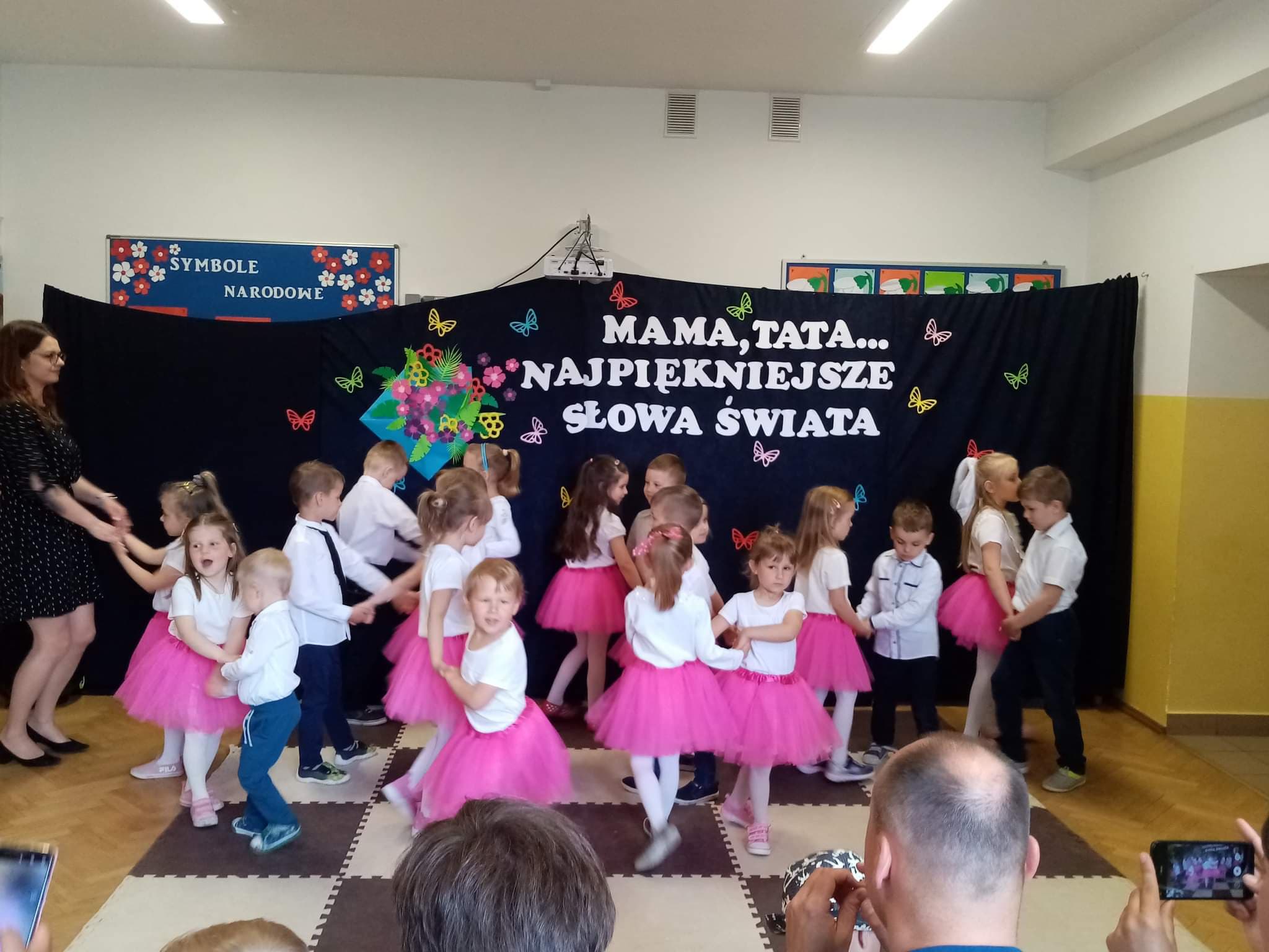 31 maja w naszym przedszkolu obchodziliśmy Dzień Mamy i Taty. Z tej okazji dzieci prezentowały swoje umiejętności wokalne, taneczne oraz recytatorskie przed swoimi rodzicami licznie zgromadzonymi w sali przedszkolnej. Po części artystycznej przedszkolaki wręczyły swoim kochanym rodzicom upominki. Nie brakowało też życzeń, całusów oraz słodkiego poczęstunku.
