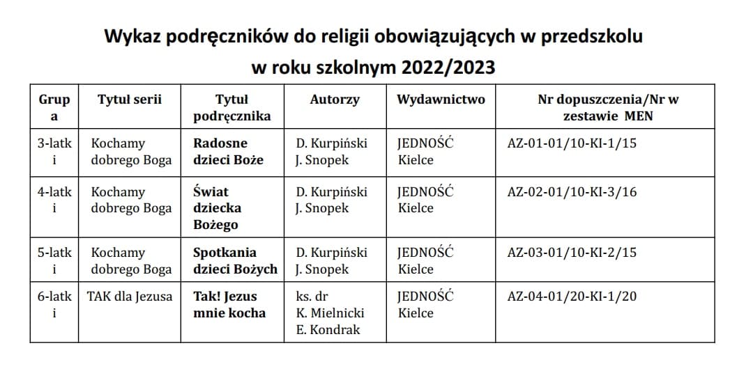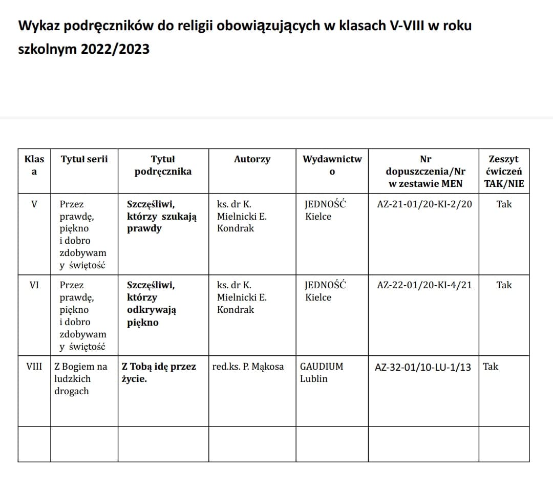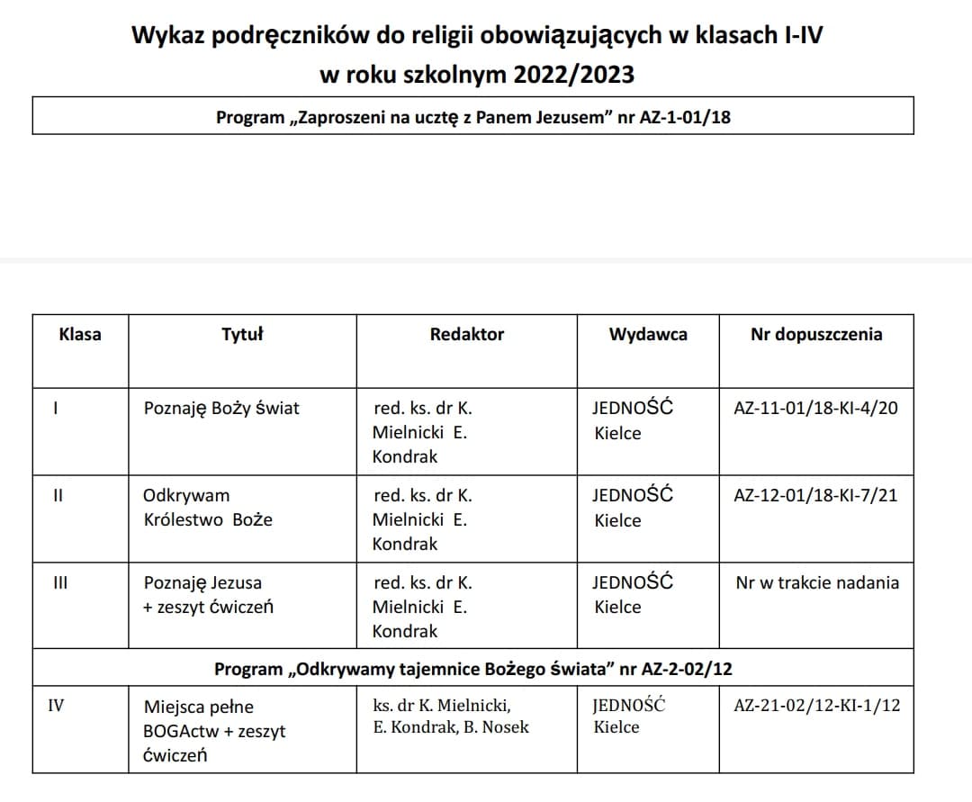 Wykaz podręczników do religii na rok szkolny 2022/2023