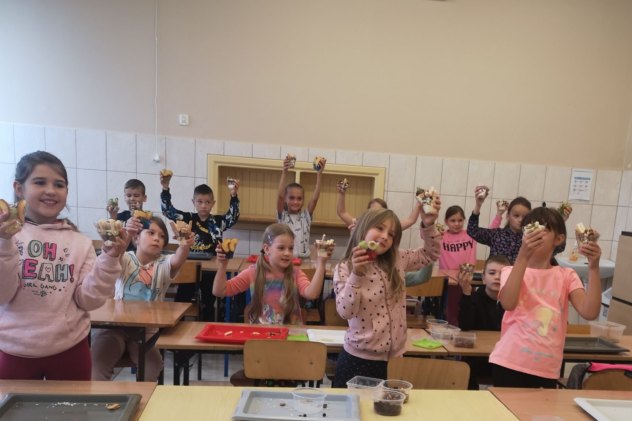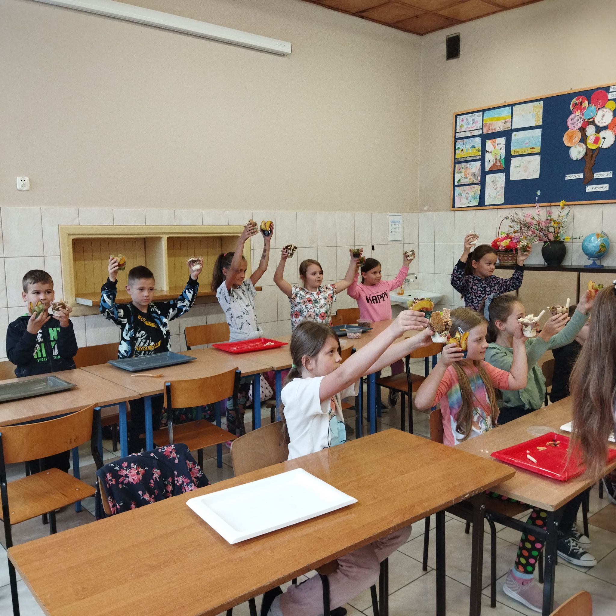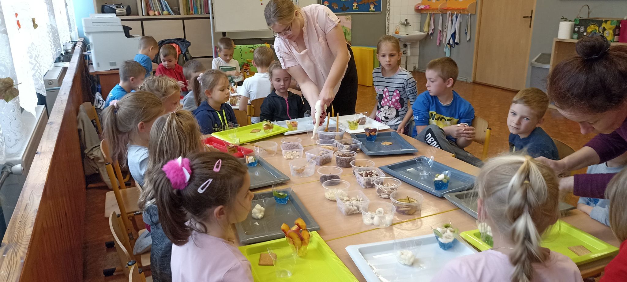 20 września odbyły się warsztaty kulinarne dla dzieci z oddziałów przedszkolnych oraz dzieci z klas I-III. Warsztaty prowadziły animatorki z Krainy Marzeń. Celem tych warsztatów było wykonanie dwóch rodzajów deserków przez każde dziecko, zapoznanie z ich składnikami i smakami. Deserki spakowane zostały przez dzieci w prezentowe pudełka, a ich konsumpcja miała odbyć się w domu. Przy komponowaniu deserków dzieci miały dużo frajdy i zapewne jeszcze kiedyś wykonają podobne w domu.