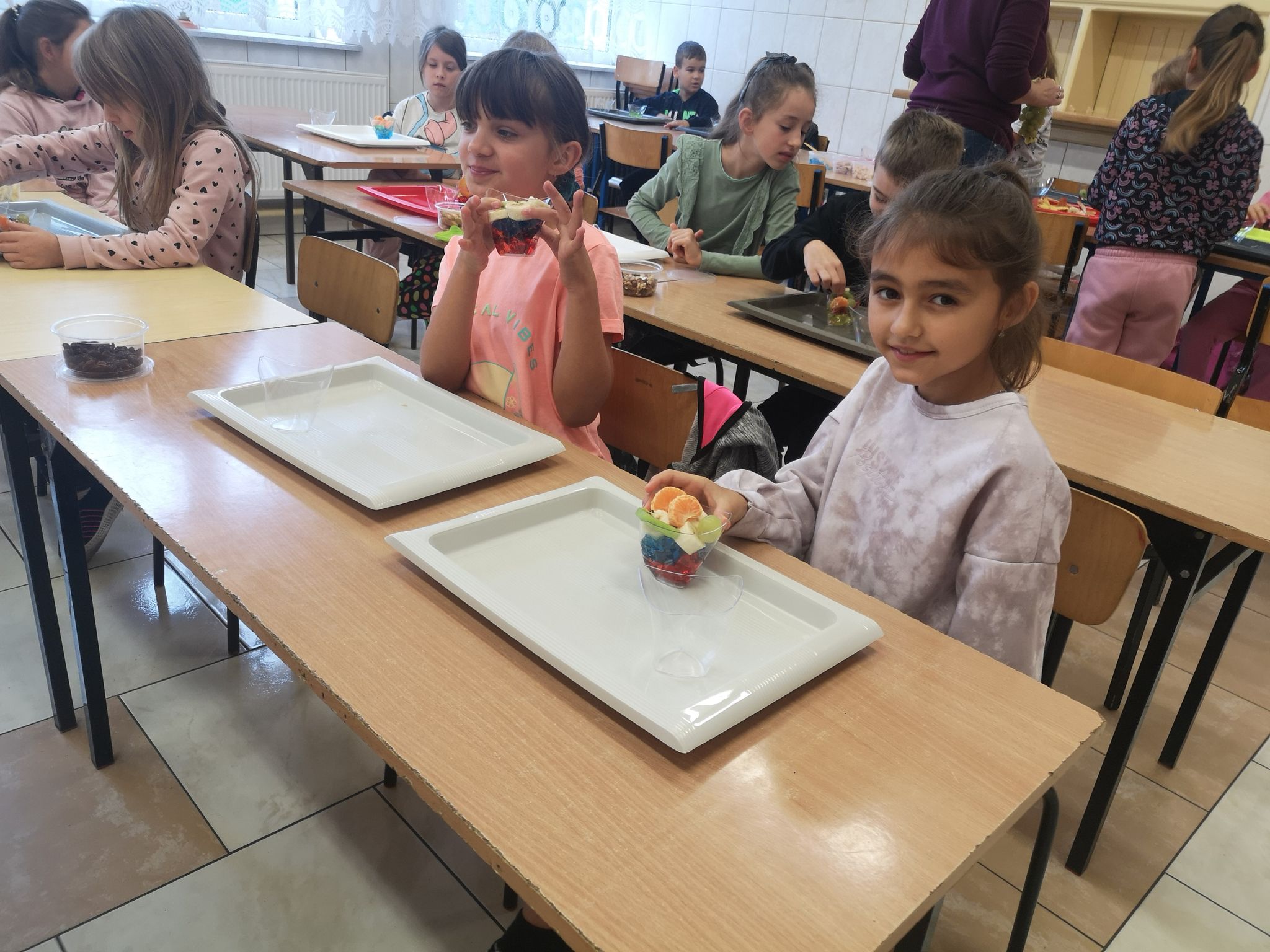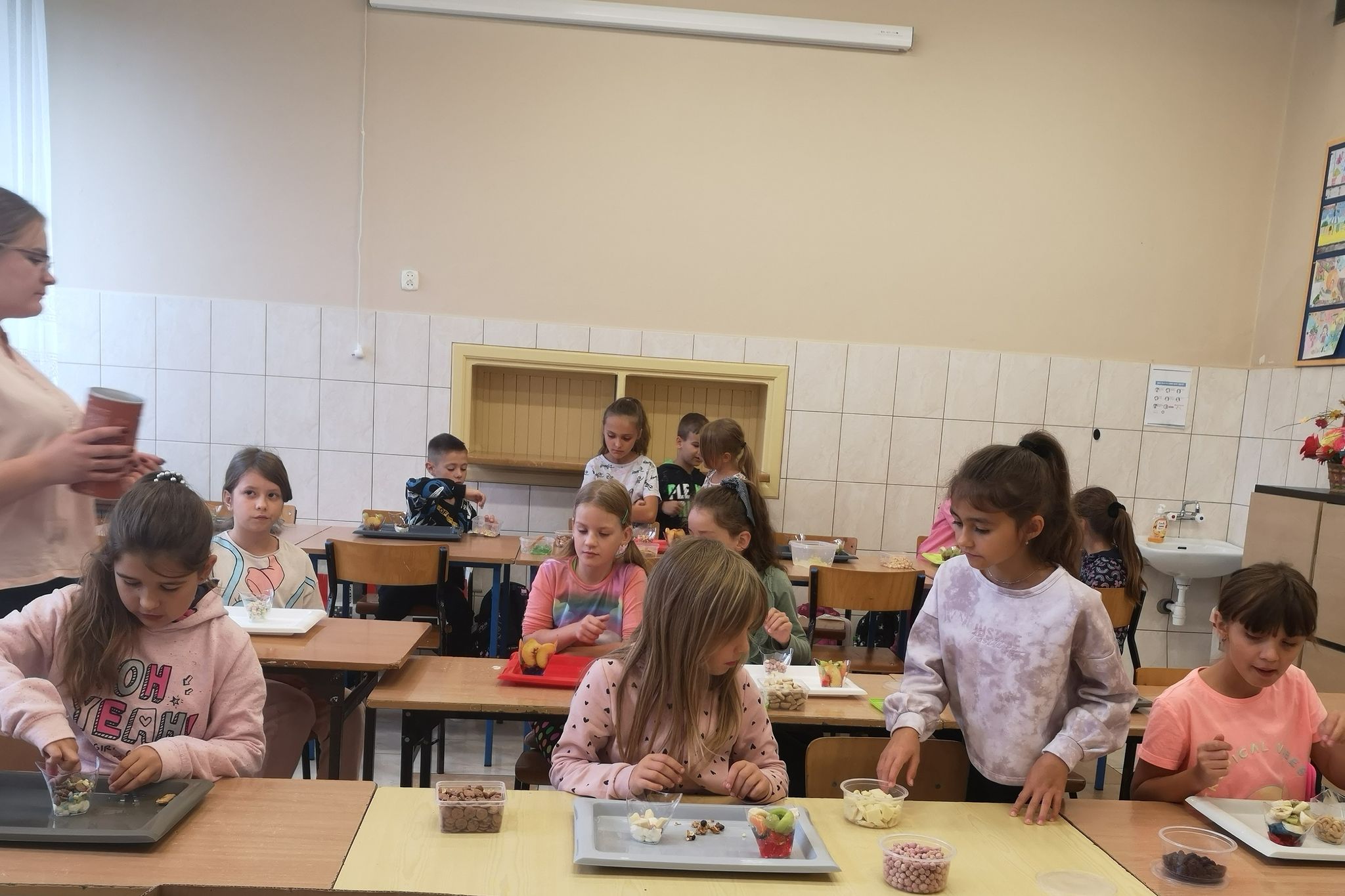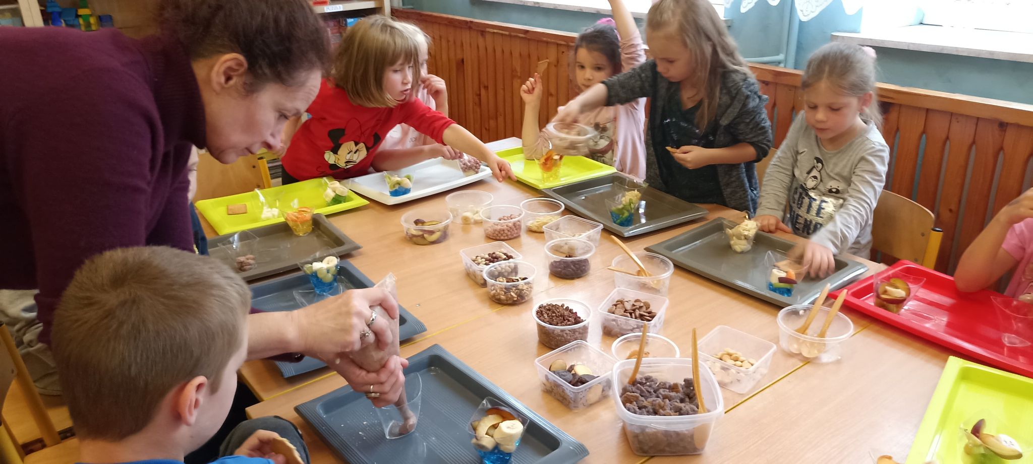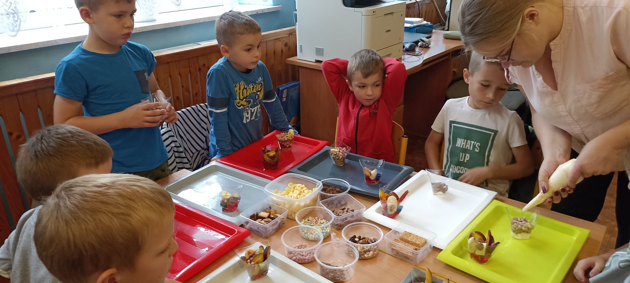 20 września odbyły się warsztaty kulinarne dla dzieci z oddziałów przedszkolnych oraz dzieci z klas I-III. Warsztaty prowadziły animatorki z Krainy Marzeń. Celem tych warsztatów było wykonanie dwóch rodzajów deserków przez każde dziecko, zapoznanie z ich składnikami i smakami. Deserki spakowane zostały przez dzieci w prezentowe pudełka, a ich konsumpcja miała odbyć się w domu. Przy komponowaniu deserków dzieci miały dużo frajdy i zapewne jeszcze kiedyś wykonają podobne w domu.