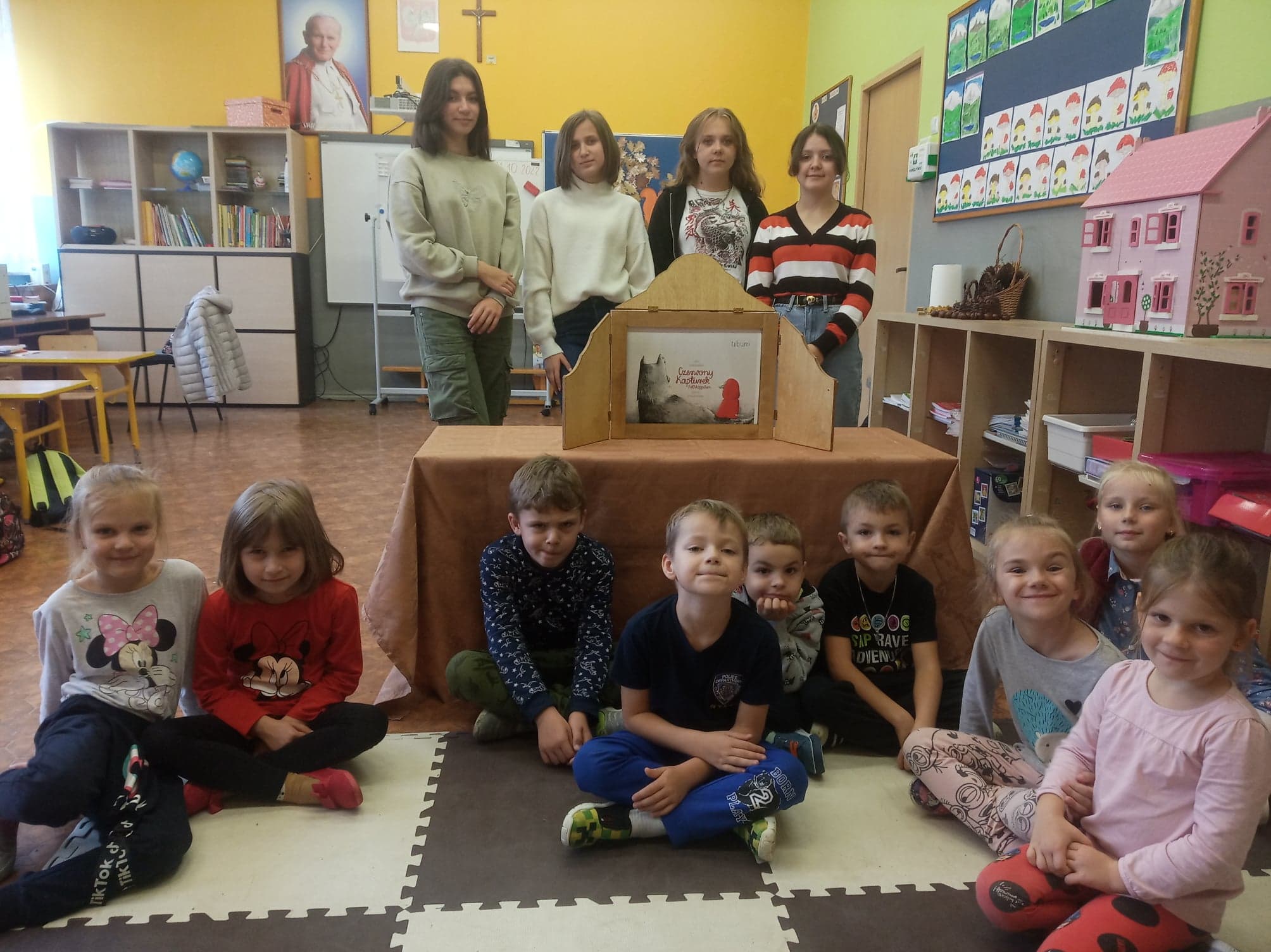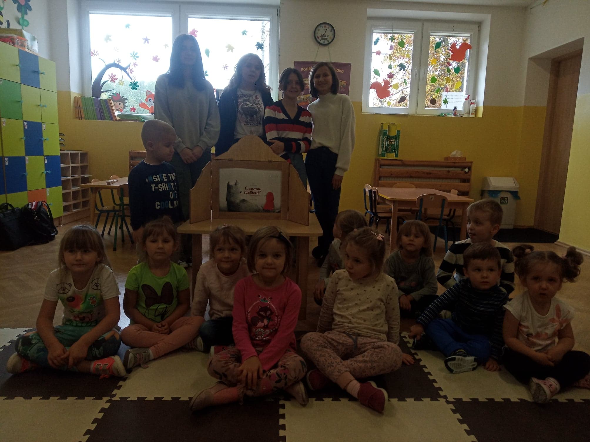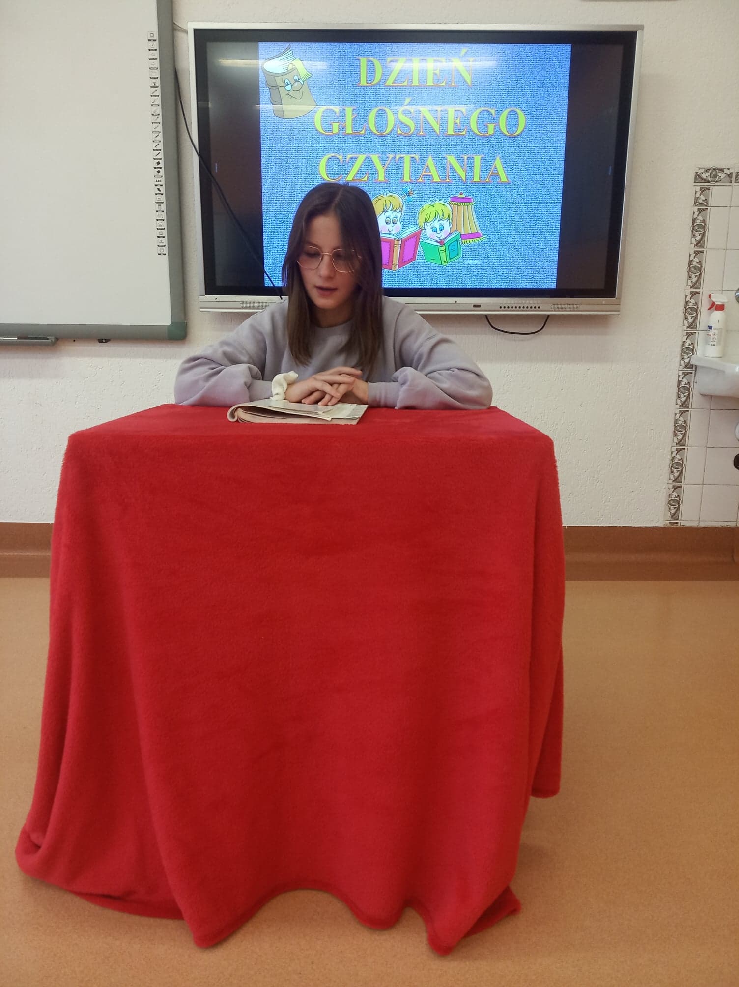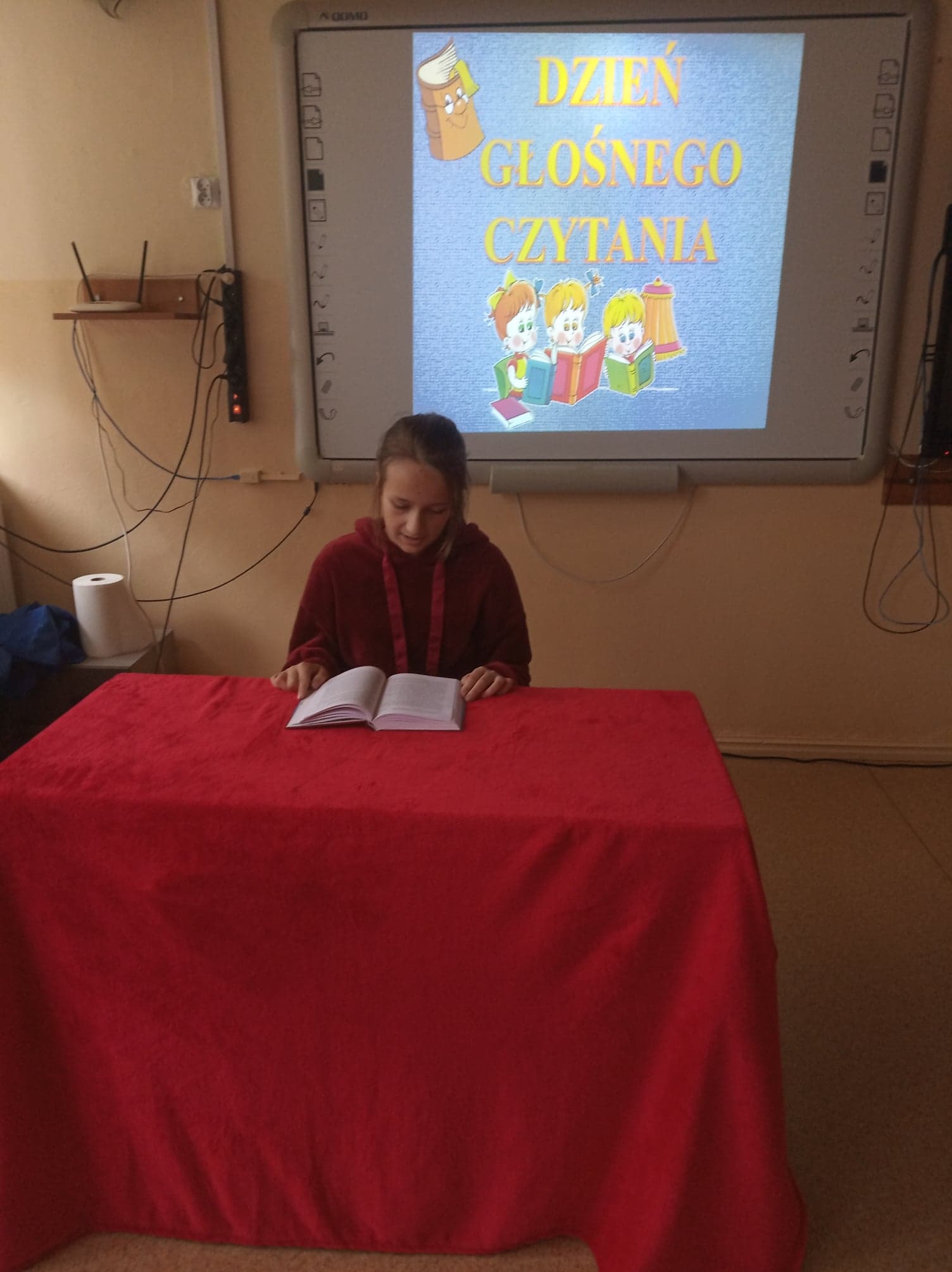 Dzień Głośnego Czytania stał się też okazją do przeprowadzenia szkolnej akcji pod hasłem: „Starsi czytają młodszym”. Dziewczęta z klasy VIII – Julia Leśniewska, Natalia Deruś, Julia Kaproń oraz Wiktora Bryła odwiedziły dzieci z oddziałów przedszkolnych i przeczytały im głośno baśń o Czerwonym Kapturku. Wykorzystały do tego Teatrzyk Kamishibai – papierowy teatr obrazkowy. Taka forma przyswajania tekstu okazała się dla najmłodszych bardzo atrakcyjna i z pewnością dostarczyła im wielu niezapomnianych wrażeń.