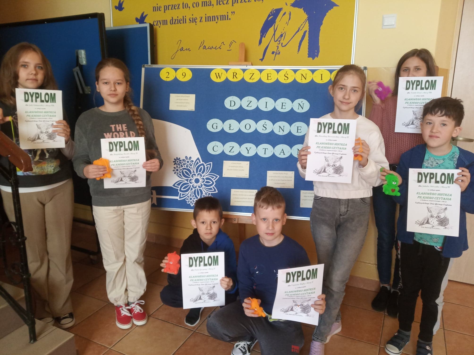 W naszej szkole również przyłączono się do obchodów wspomnianego święta. Uczniowie klas IV-VIII podczas lekcji języka polskiego czytali na głos fragmenty powieści dla dzieci i młodzieży. Trudność stanowił fakt, że nie mieli oni możliwości wcześniejszego przygotowania się do wystąpienia. Podczas prezentacji należało wykazać się przede wszystkim umiejętnością głosowej interpretacji tekstu. Zwracano uwagę na odpowiednią intonację, dykcję, tempo czytania, jak również na kontakt z publicznością czy radzenie sobie z tremą. Na zakończenie zajęć w każdej klasie została przeprowadzona anonimowa ankieta. Uczniowie mieli wytypować jedną osobę, która – ich zdaniem – zasługuje na miano Klasowego Mistrza Pięknego Czytania. Ze względu na porównywalną liczbę głosów, w niektórych klasach wyłoniono po dwóch zwycięzców. Zostali nimi: