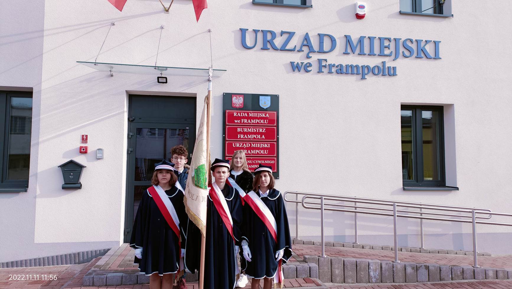 Społeczność naszej szkoły (poczet sztandarowy oraz delegacja nauczycieli) uczestniczyła w gminnych obchodach Święta Niepodległości. Rozpoczęły się one 11 listopada podniesieniem Flagi Państwowej na nowo zamontowanym maszcie na Rynku we Frampolu. Kolejnym punktem uroczystości było złożenie wieńców pod Pomnikiem Odzyskania Niepodległości. Następnie zebrani udali się na Mszę Świętą w intencji Ojczyzny. Po jej zakończeniu w Miejsko-Gminnym Ośrodku Kultury odbyła się część artystyczna, na którą złożyły się prezentacje taneczne oraz wokalne. Uczniowie naszej szkoły, w ramach gminnych obchodów Święta Niepodległości, wzięli również udział w III Biegu dla Niepodległej, który odbył się 10 listopada we Frampolu.