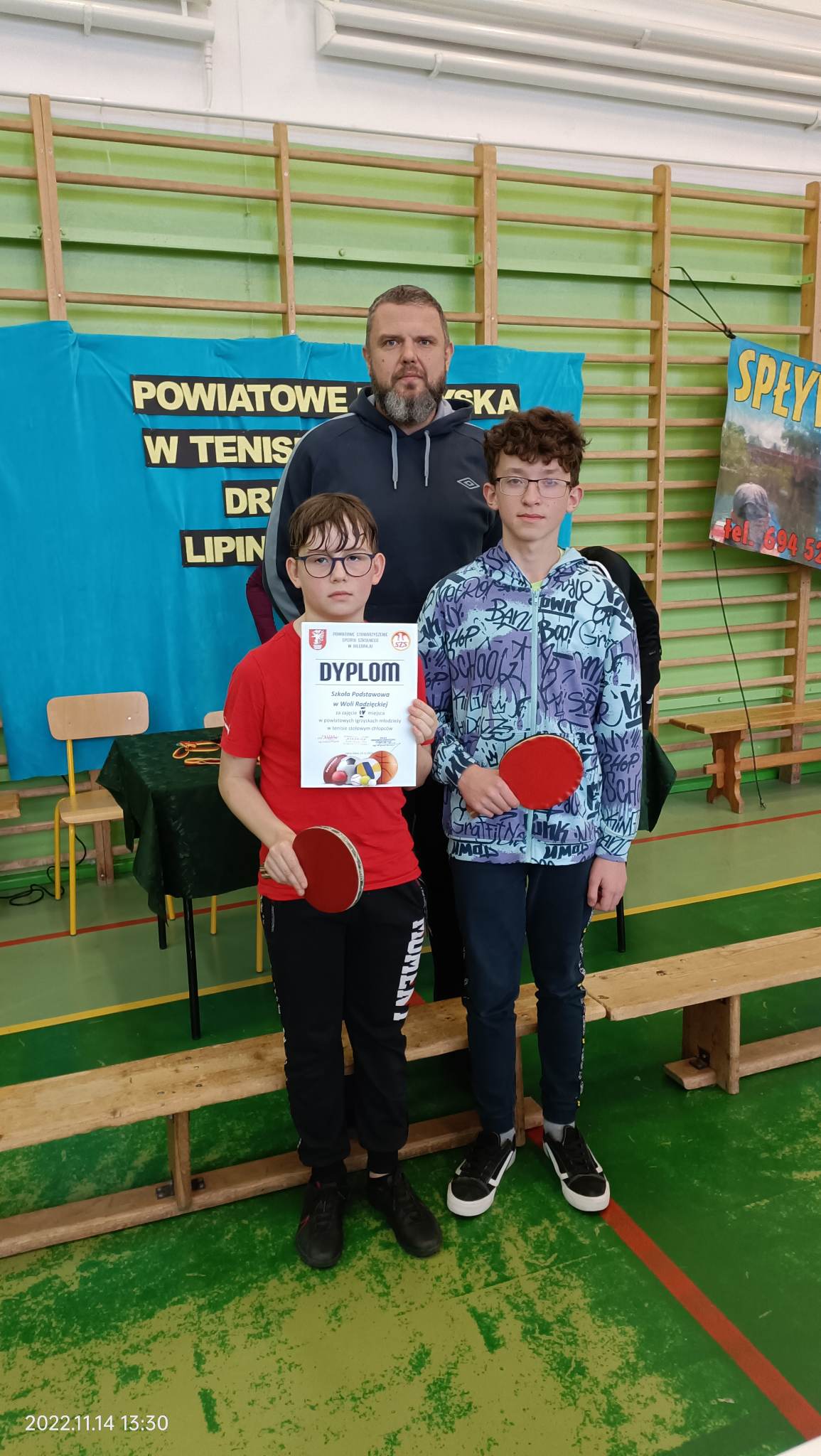 W Lipinach Dolnych dnia 14 listopada odbyły się powiatowe zawody w drużynowym tenisie stołowym chłopców z rocznika 2008-2009. Reprezentanci naszej szkoły Jakub Komada i Bartłomiej Skórzak ostatecznie zajęli IV miejsce. Gratulujemy!