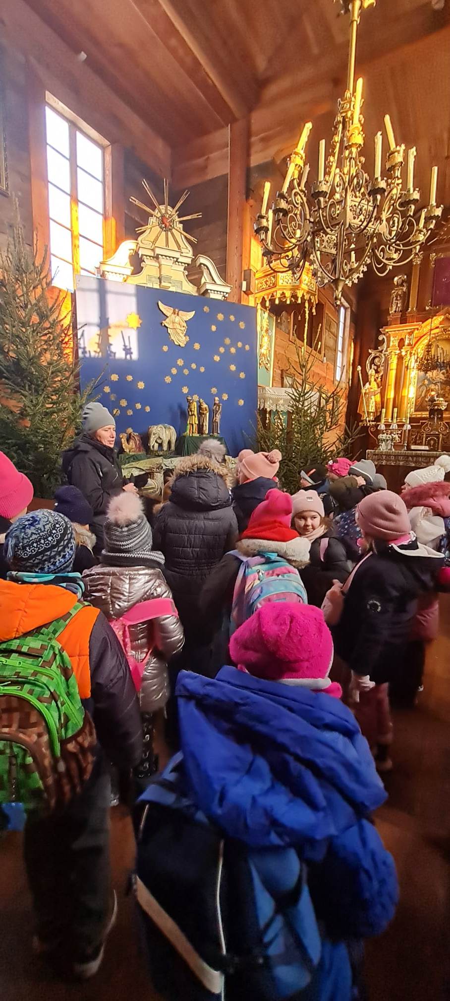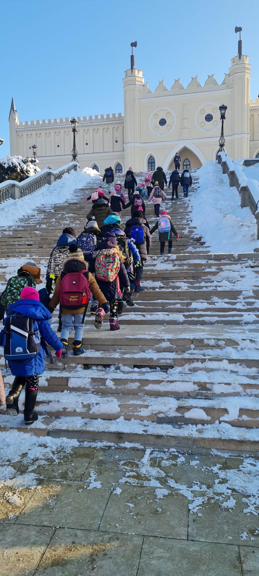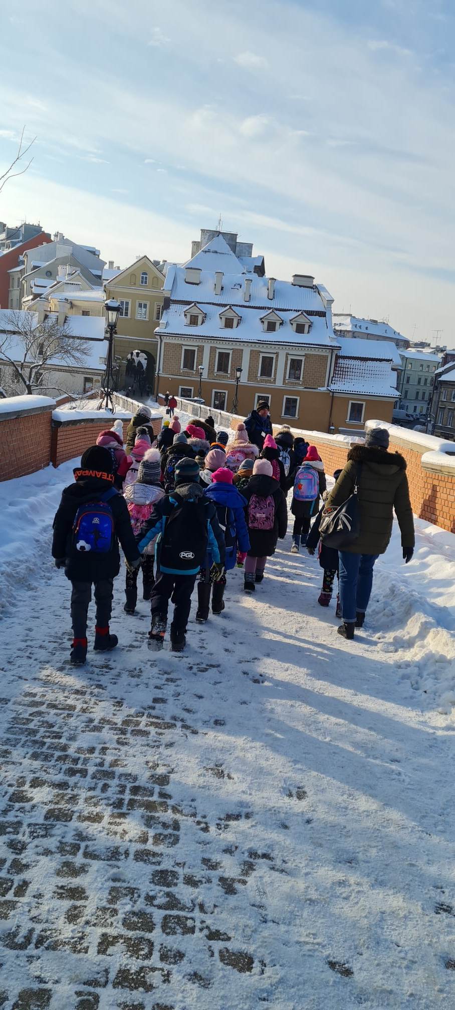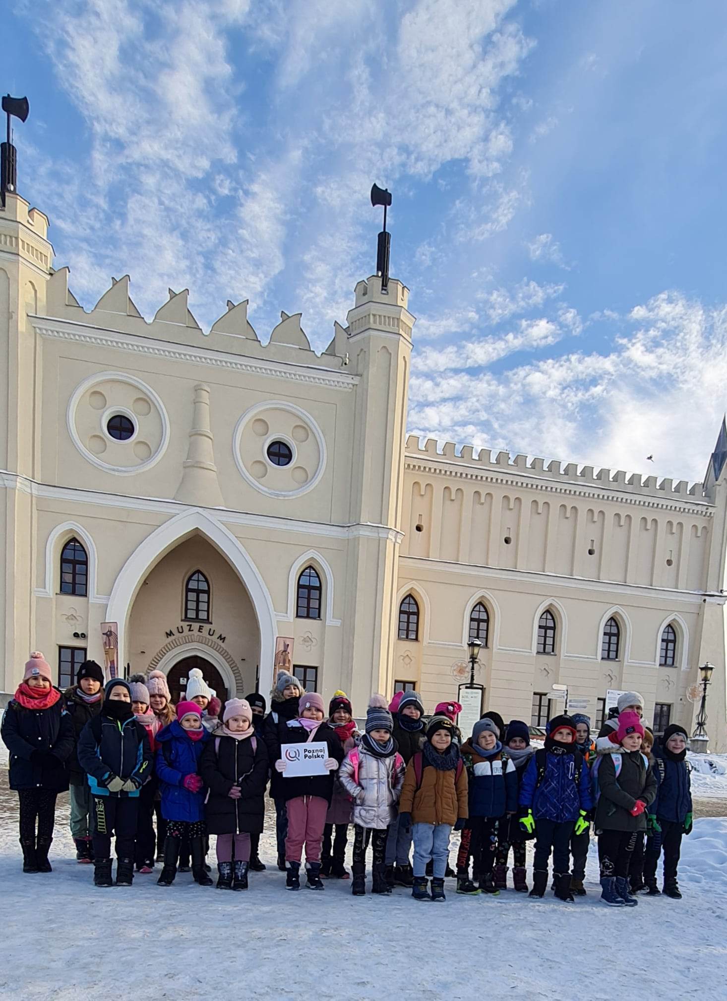 Poranek 14 grudnia przywitał nas siarczystym mrozem. Nie zrażeni tym faktem, uczniowie klas I–III stawili się na długo wyczekiwaną wycieczkę do Lublina. Pierwszym punktem naszego wyjazdu było Muzeum Narodowe w Lublinie. Dla większości dzieci była to pierwsza w życiu wizyta w muzeum i okazja do poznania najważniejszych pojęć związanych z muzealnictwem, takich jak: eksponat, wystawa,czy kolekcja. Pod opieką pani przewodnik dzieci zastanawiały się, po co istnieją muzea i o czym mogą nam powiedzieć gromadzone w nich przedmioty. Następnie pod opieką przewodnika miejskiego ruszyliśmy na krótki spacer „Szlakiem lubelskich legend”, podczas którego uczniowie poznawali historię miasta poprzez najciekawsze opowieści i podania, w tym najsłynniejszą „Legendę o Czarciej Łapie’. Kolejnym punktem naszej wycieczki była wizyta w Muzeum wsi Lubelskiej, które o tej porze roku prezentuje bożonarodzeniowy świąteczny wystrój. Pani przewodnik opowiedziała nam o tradycjach związanych z ozdobą domostw i z wieczerzą wigilijną. W izbie nad stołem wisiał ręcznie wykonany kolorowy pająk. W salonie dworu obejrzeliśmy drzewko bożonarodzeniowe ubrane w tradycyjne ozdoby: gwiazdy z pazłotka po cukierkach, długi biały łańcuch składający się z drobnych ogniw słomkowo-bibułowych oraz barwne ozdoby z naturalnych surowców takich, jak wydmuszki jajek, szyszki czy orzechy włoskie malowane farbką na złoto. W zabytkowym kościele obejrzeliśmy piękną szopkę z zabytkowymi figurami. Wszyscy wrócili z wycieczki szczęśliwi, pełni entuzjazmu, ale też bogatsi o nowe doświadczenia i zasoby wiedzy. Z pewnością wspomnienia z tej wycieczki pozostaną z nami na długo.