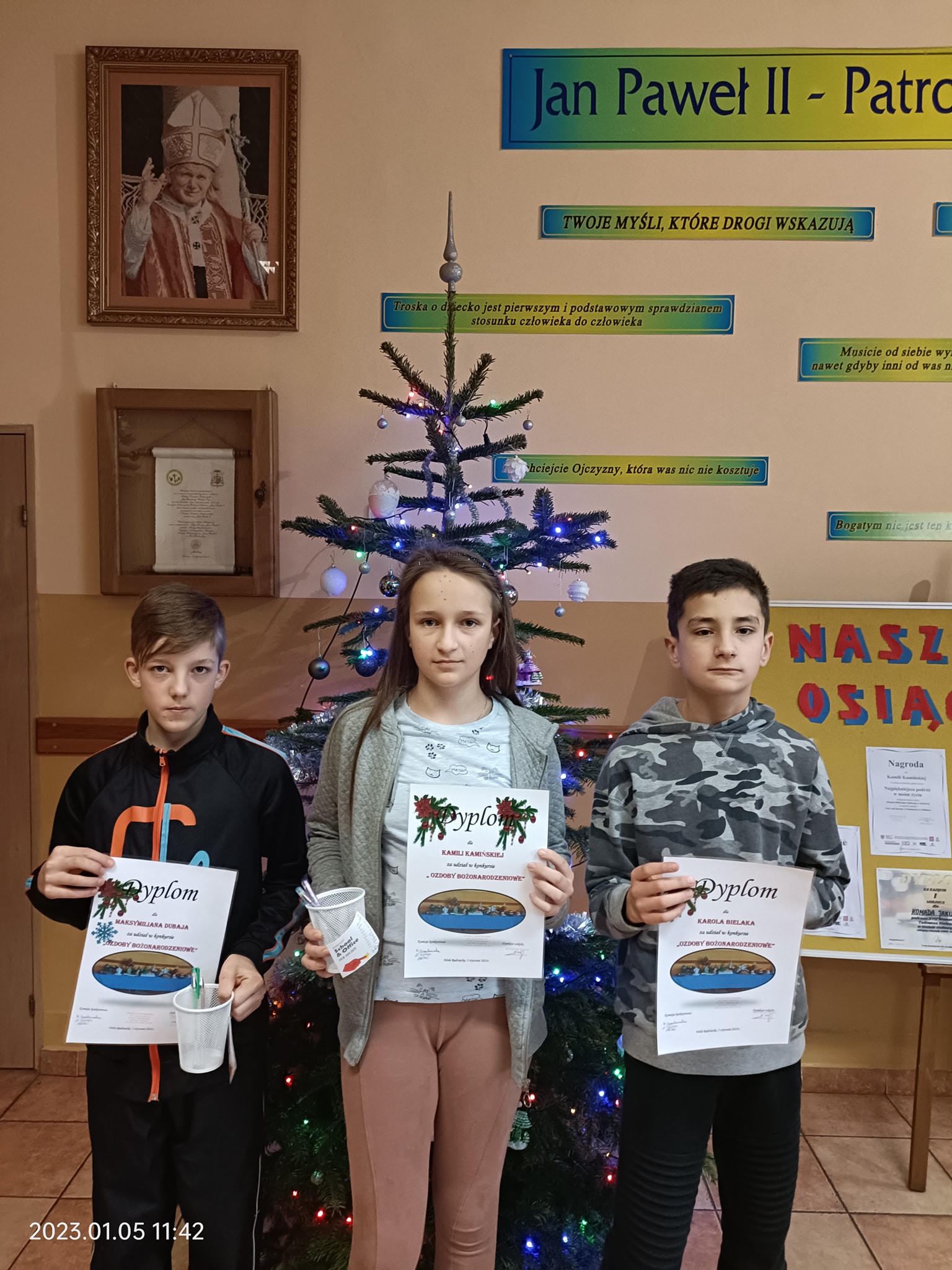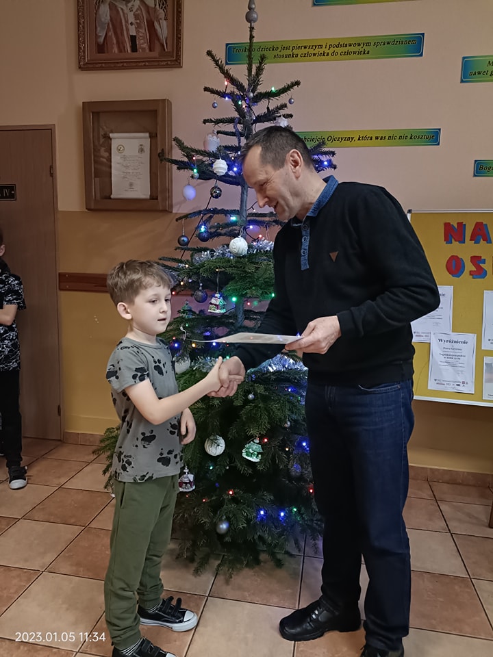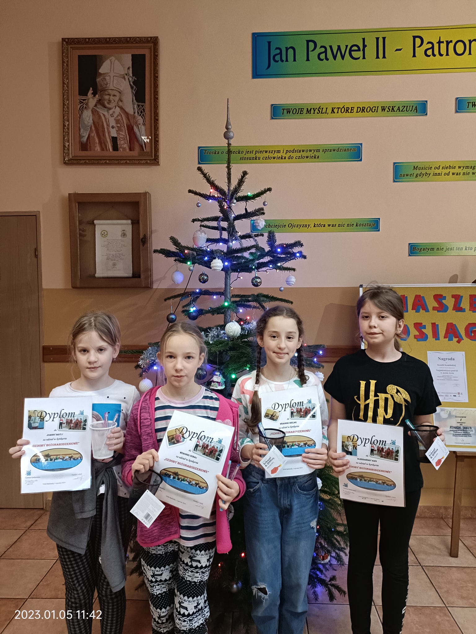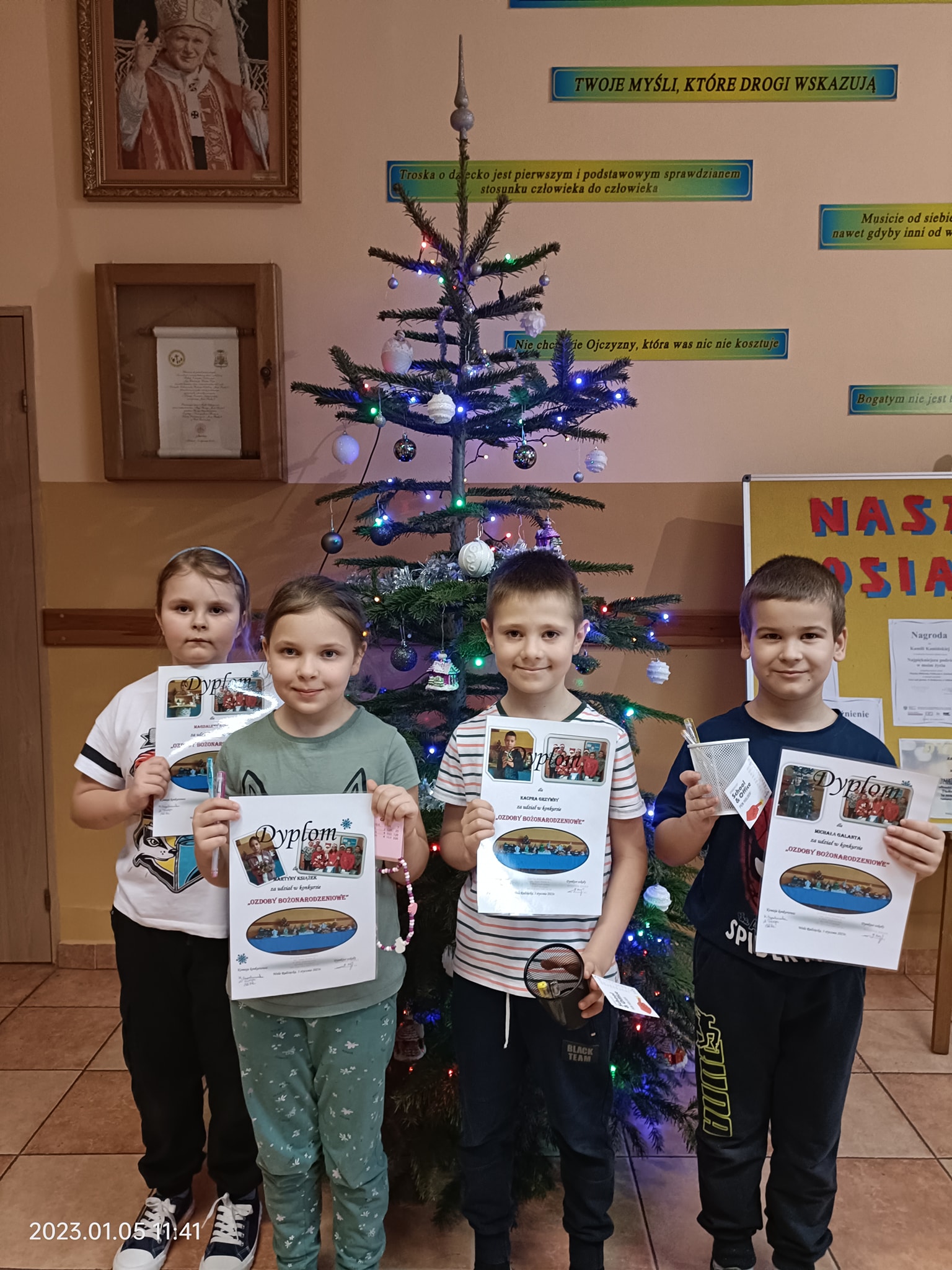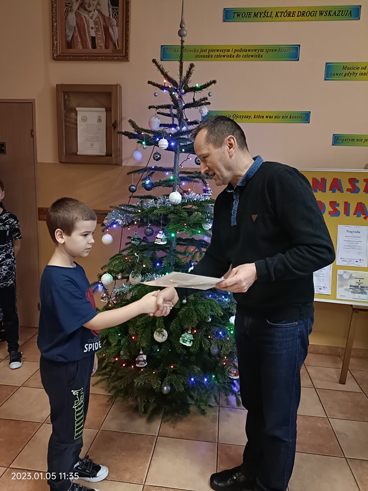 Z okazji Świąt Bożego Narodzenia w naszej szkole został zorganizowany konkurs plastyczny pod hasłem „Ozdoby bożonarodzeniowe”. Uczestnicy czyli przedszkolaki i uczniowie klas I – VI wykonali piękne prace wśród których były stroiki, choinki, bałwanki, bombki, gwiazdy oraz szopki. Do ich wykonania dzieci wykorzystały różnorodne materiały i techniki. Wszystkie prace były piękne, ciekawe i pracochłonne. W związku z tym komisja postanowiła nagrodzić każdego uczestnika.