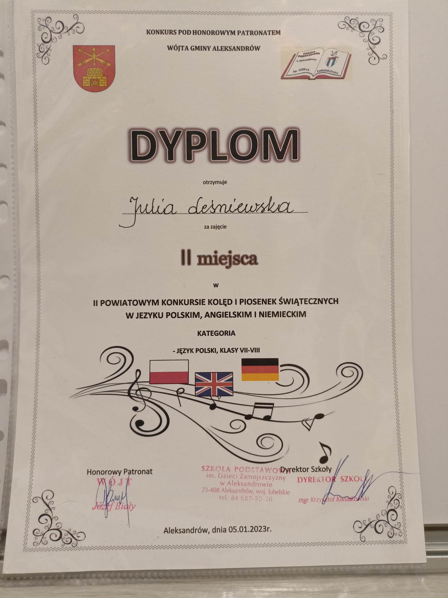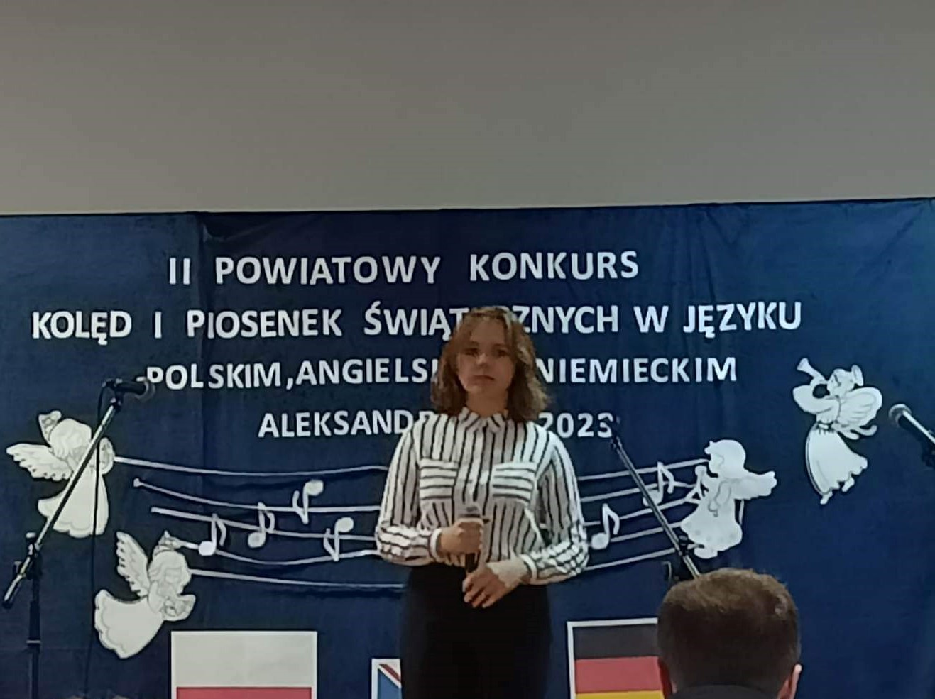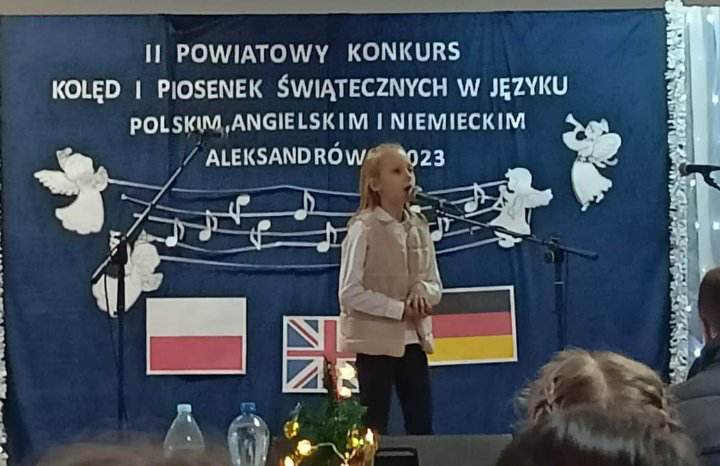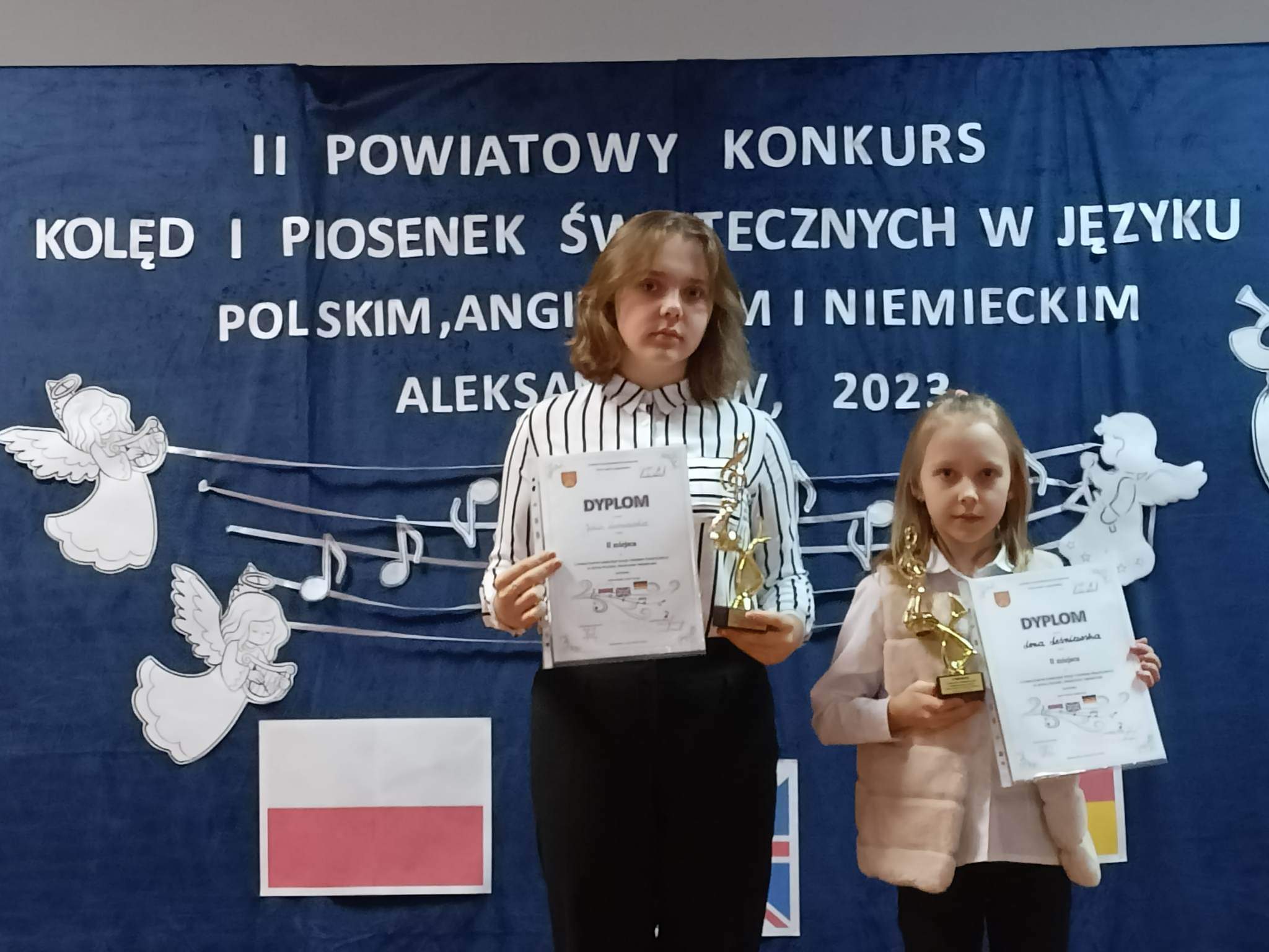5 stycznia w Aleksandrowie odbył się II POWIATOWY KONKURS KOLĘD I PIOSENEK ŚWIĄTECZNYCH W JĘZYKU POLSKIM, ANGIELSKIM I NIEMIECKIM. Przedsięwzięcie zorganizowała Szkoła Podstawowa im. Dzieci Zamojszczyzny w Aleksandrowie. Celem wydarzenia było przede wszystkim kultywowanie tradycji śpiewania kolęd i piosenek o tematyce bożonarodzeniowej oraz promowanie aktywności twórczej młodego pokolenia. W konkursie mogli wziąć udział uczniowie klas IV- VIII szkół podstawowych powiatu biłgorajskiego. Uczestników oceniano w dwóch kategoriach wiekowych: klasy IV-VI oraz klasy VII-VIII. W festiwalu wzięły udział dwie uczennice naszej szkoły – Lena Leśniewska (kl. IV) i Julia Leśniewska (kl. VIII). Jesteśmy bardzo dumni, ponieważ obydwie dziewczyny zostały laureatkami konkursu – każda zajęła II miejsce w swojej kategorii wiekowej.