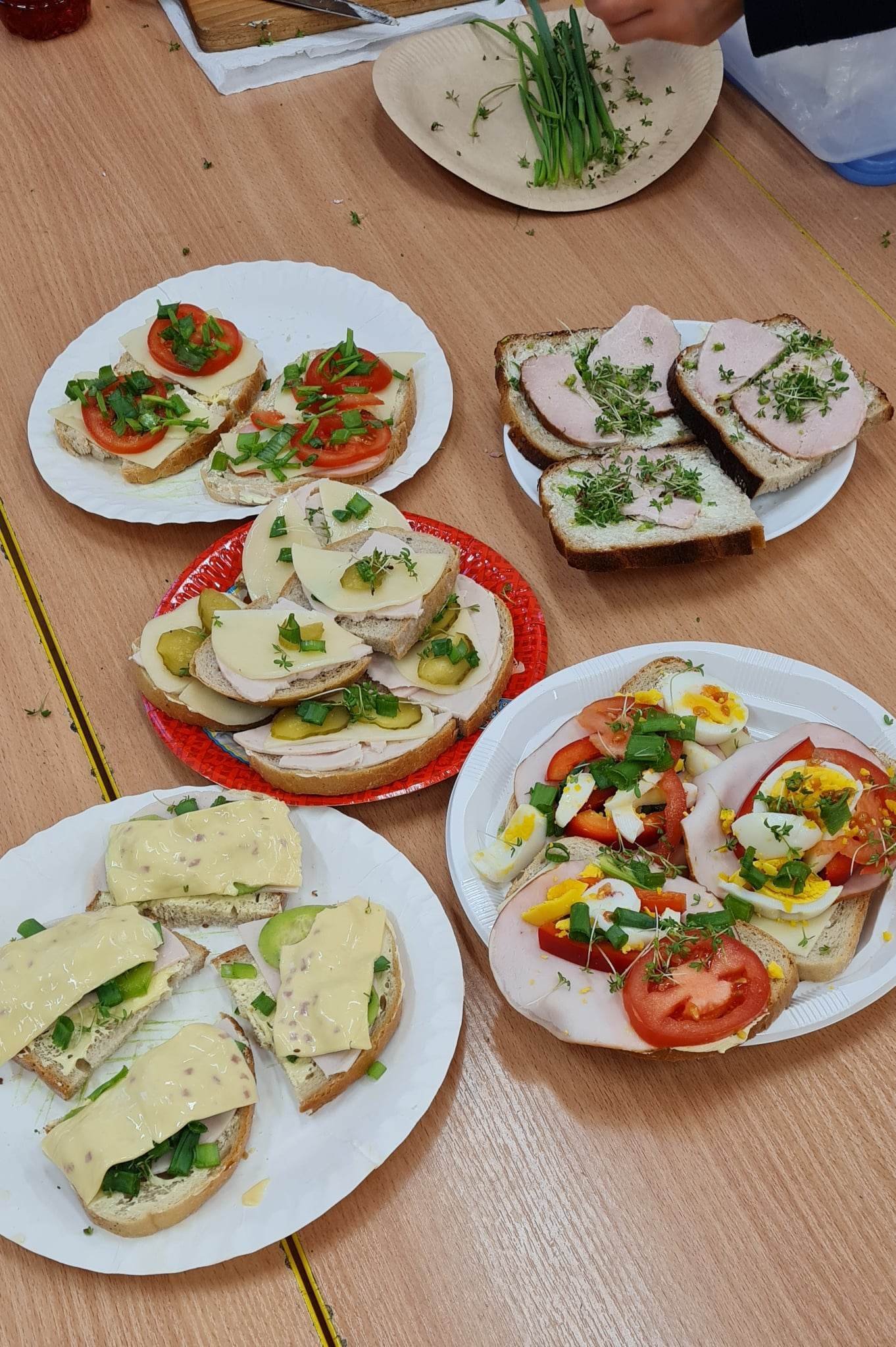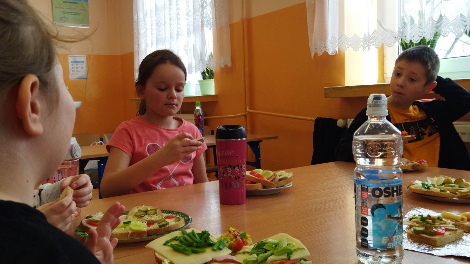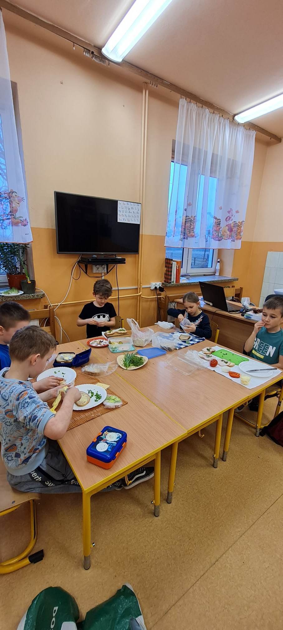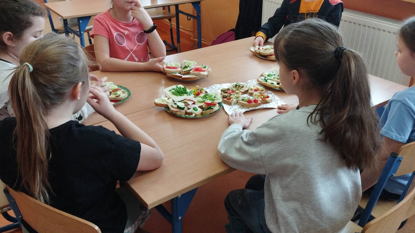 W myśl wiersza Stanisława Karaszewskiego klasy młodsze przygotowały kanapki bogate w witaminy i barwne kolory. Duży nacisk położyliśmy na właściwy dobór produktów korzystnych dla zdrowia oraz estetykę wykonania. Znalazły się na nich ogórki, pomidory, szczypiorek oraz nabiał. Kanapki wyglądały smakowicie, wszyscy zjedli je z wielkim apetytem. Były to wspaniałe zajęcia uczące nas samodzielności i zdrowego odżywiania.