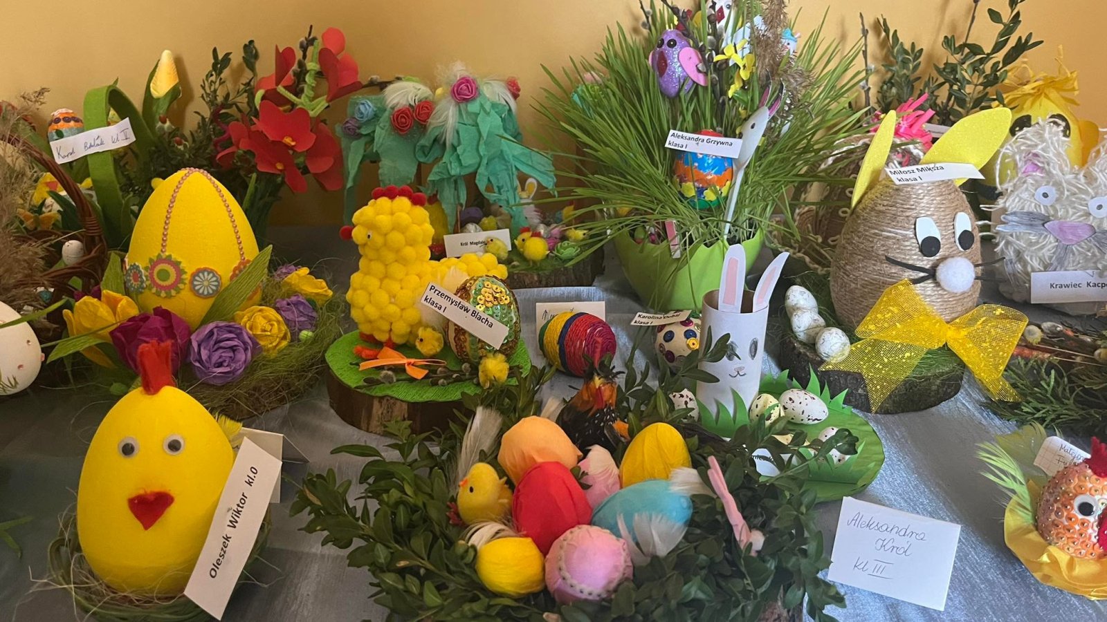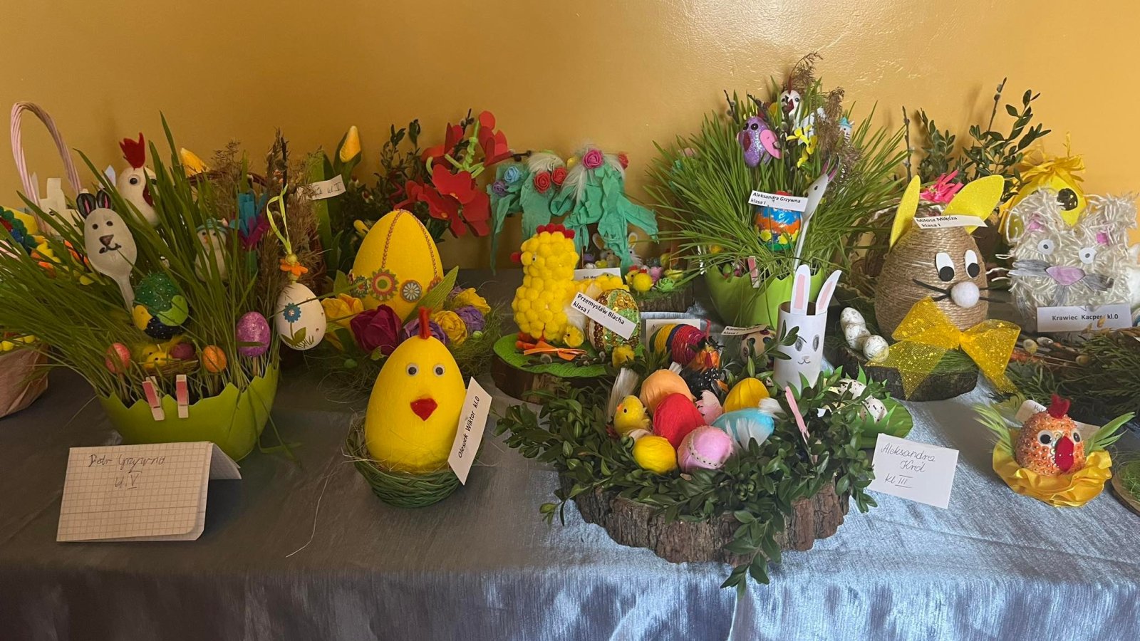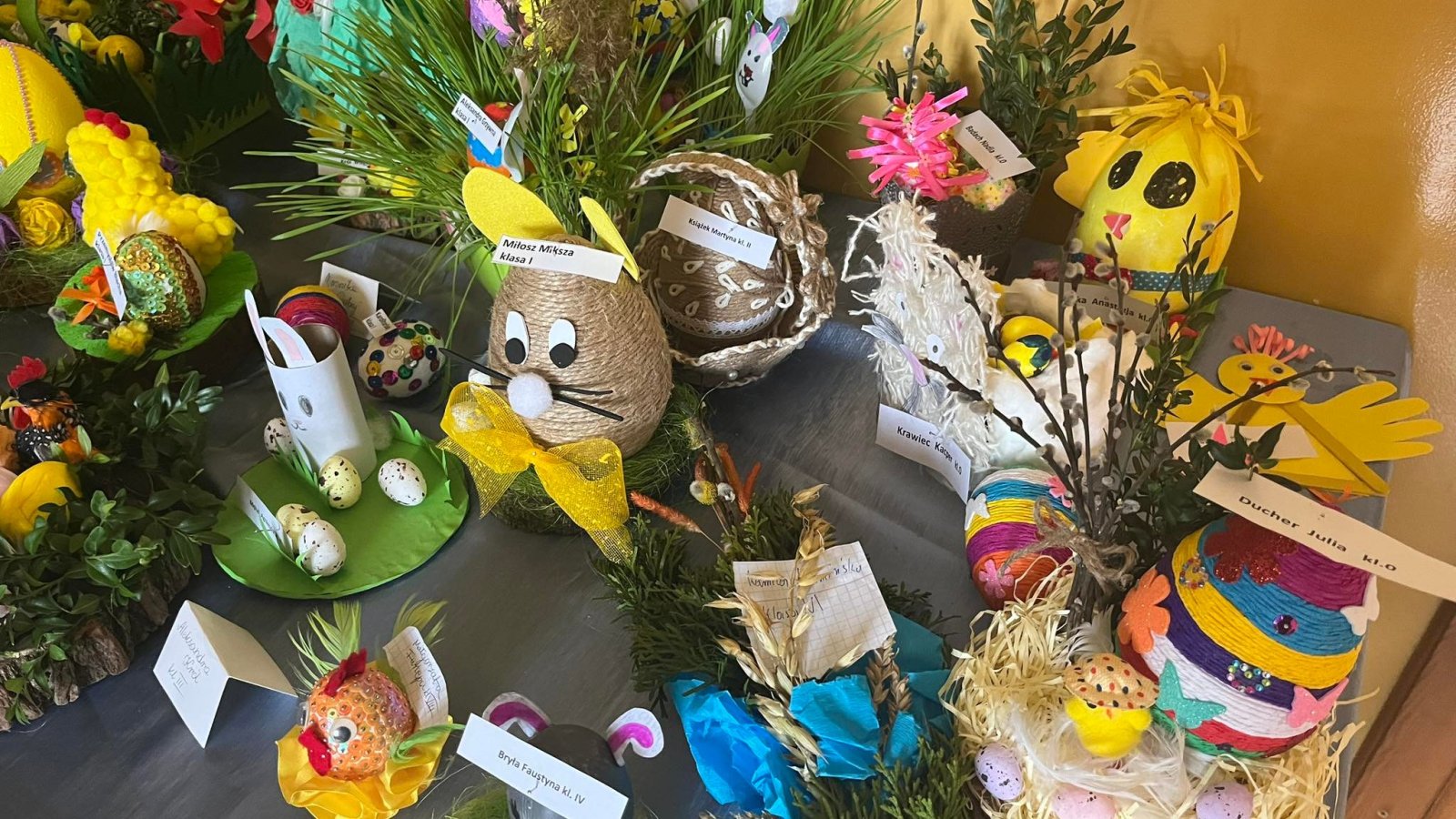 Pisanki, stroiki, baranki wielkanocne, ozdobne koszyczki, palmy i zajączki to efekty pracy uczniów naszej szkoły, przyniesione na zorganizowany również w tym roku konkurs pt: „Najpiękniejsza ozdoba wielkanocna”. Celem konkursu jest rozwijanie wrażliwości artystycznej, zainteresowań i uzdolnień manualnych i plastycznych uczniów oraz kształtowanie aktywnej i twórczej postawy wobec sztuki i tradycji kulturowej związanej z obrzędami okresu Wielkiej Nocy.