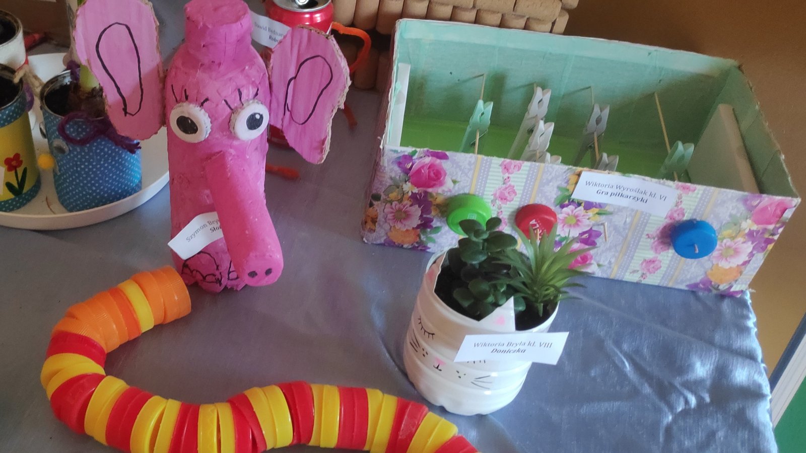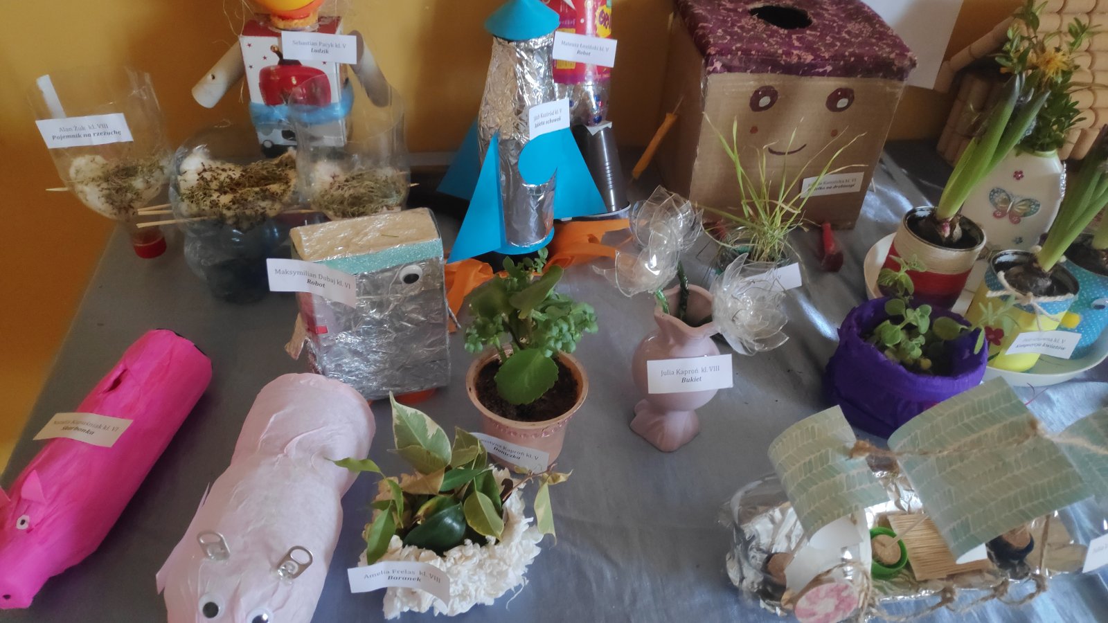W związku z corocznymi obchodami Dnia Ziemi uczniowie klas V-VIII w ramach lekcji geografii wzięli udział w projekcie ekologicznym „Jestem EKO”. Poszukiwali rozwiązań, jakie mogliby wdrożyć w swoje życie, aby chronić nasza planetę. Pomysły, jak każdy z nas może dbać o Ziemię, zostały zaprezentowane na gazetce „Zainwestuj w naszą planetę”, np. zakręcaj wodę, zrezygnuj z plastikowych opakowań, prawidłowo segreguj śmieci, itp. W celu ograniczenia ilości śmieci, można stworzyć „coś z niczego”. Okazuje się, że powtórne wykorzystanie niepotrzebnych opakowań, nakrętek, kartonów, nie jest takie trudne. Świadczą o tym piękne prace przestrzenne przygotowane przez młodzież. Zapraszamy do obejrzenia zdjęć przedstawiających ekologiczne skarbonki, pojemniki, doniczki, gry, ozdoby, kwiaty, roboty. Zachęcamy również do refleksji: „Zastanów się zanim coś wyrzucisz, wykorzystaj ponownie. Matka Ziemia i przyszłe pokolenia będą Ci wdzięczne.”