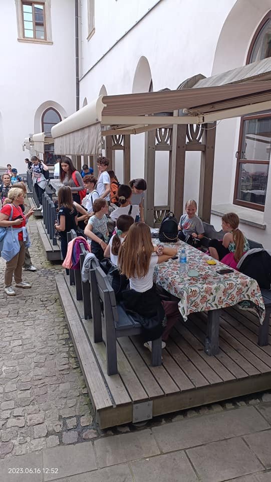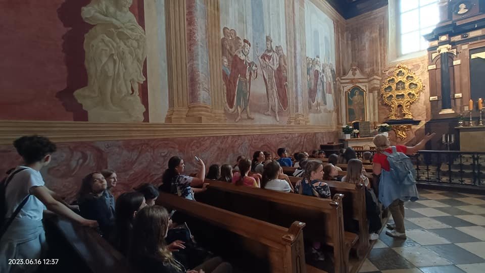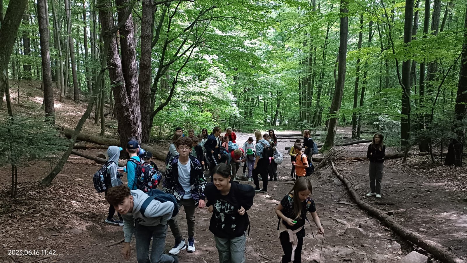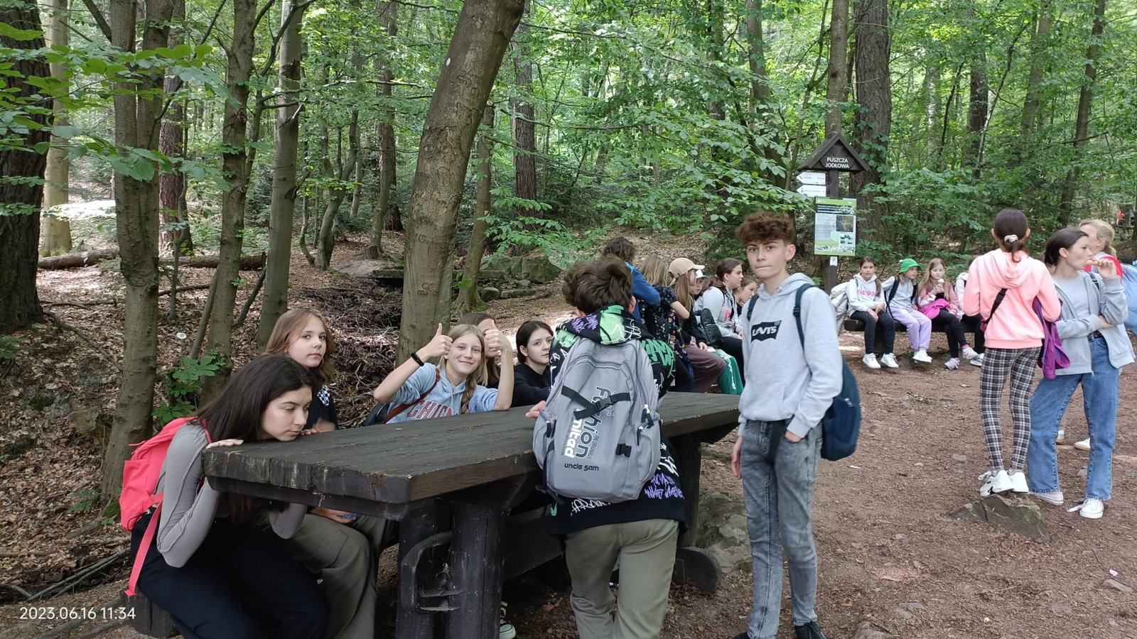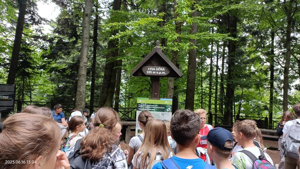Kolejny punkt naszej wycieczki był już bardziej wymagający. Po spotkaniu z panią przewodnik w Nowej Słupi traktem królewskim weszliśmy na Łysą Górę 595 m n.p.m.. Ze szczytem Łysej Góry związane jest wiele ciekawych legend. Krążą plotki że odbywały się tu niegdyś sabaty czarownic. Łysa Góra była świadkiem wielu obrzędów religijnych dawnego kultu słowiańskiego. Obecnie na Łysej Górze (Świętym Krzyżu) znajduje się klasztor Braci Oblatów, założony przez Bolesława Chrobrego dla benedyktynów, w którym przechowywane są relikwie Krzyża Świętego. Atrakcją Łysej Góry jest znajdujące się tam świętokrzyskie gołoborze. To rumowiska skalne złożone jedynie z grubej frakcji skalnej, czyli takiej, która nie zawiera żwiru ani piasku. Głównym czynnikiem powstania gołoborzy były procesy zamarzania i rozmarzania podłoża powodujące rozpad skał. Nazwa gołoborze jest terminem ludowym i określa ona obszary bezleśne (gołe od boru) znajdujące się na stokach pasm górskich. Z Łysej Góry szlakiem czerwonym ruszyliśmy w kierunku Świętej Katarzyny, właśnie ten etap naszej wycieczki był najbardziej wyczerpujący. Po pokonaniu łącznie ponad 16 km, zmęczeni ale i dumni z osiągniętego wyniku udaliśmy się na krótki odpoczynek i obiad. Droga do domu minęła szybko i przed 21.00 byliśmy już na parkingu przed szkołą.
