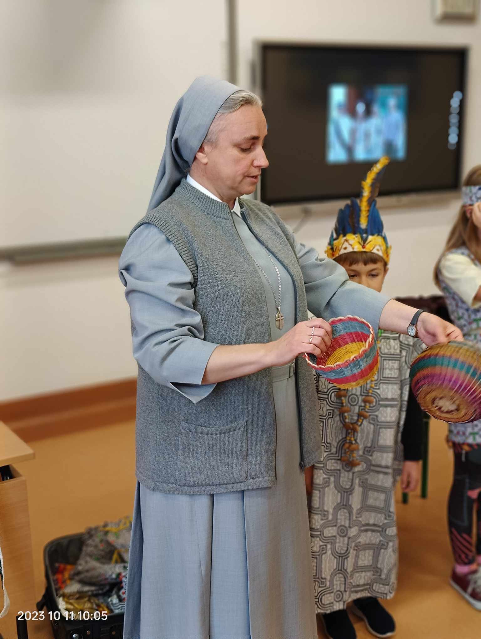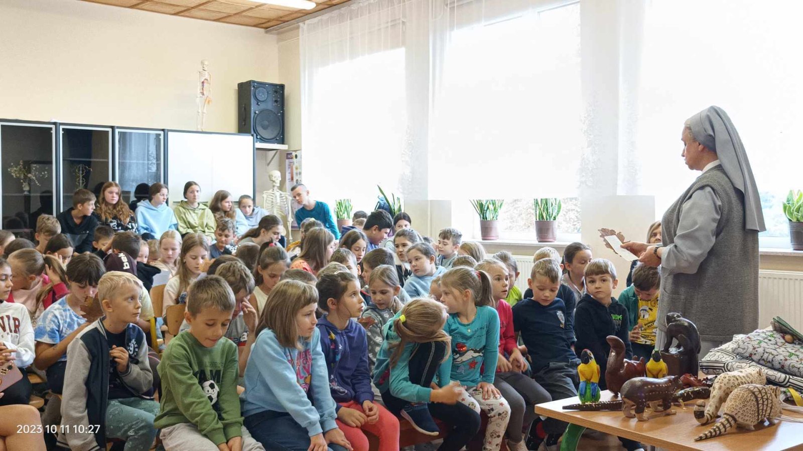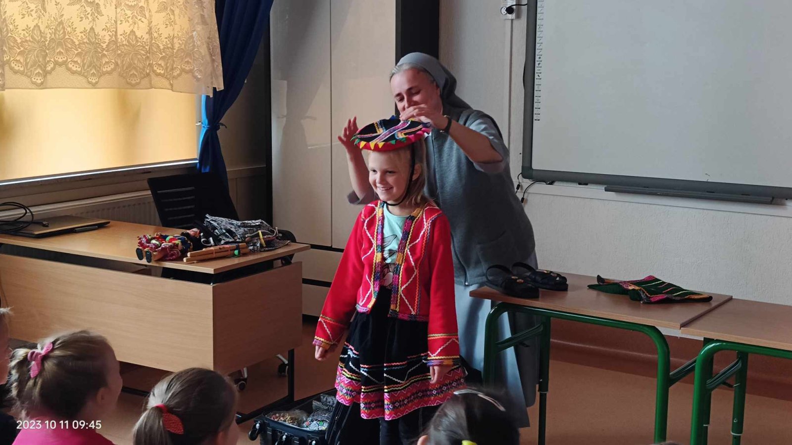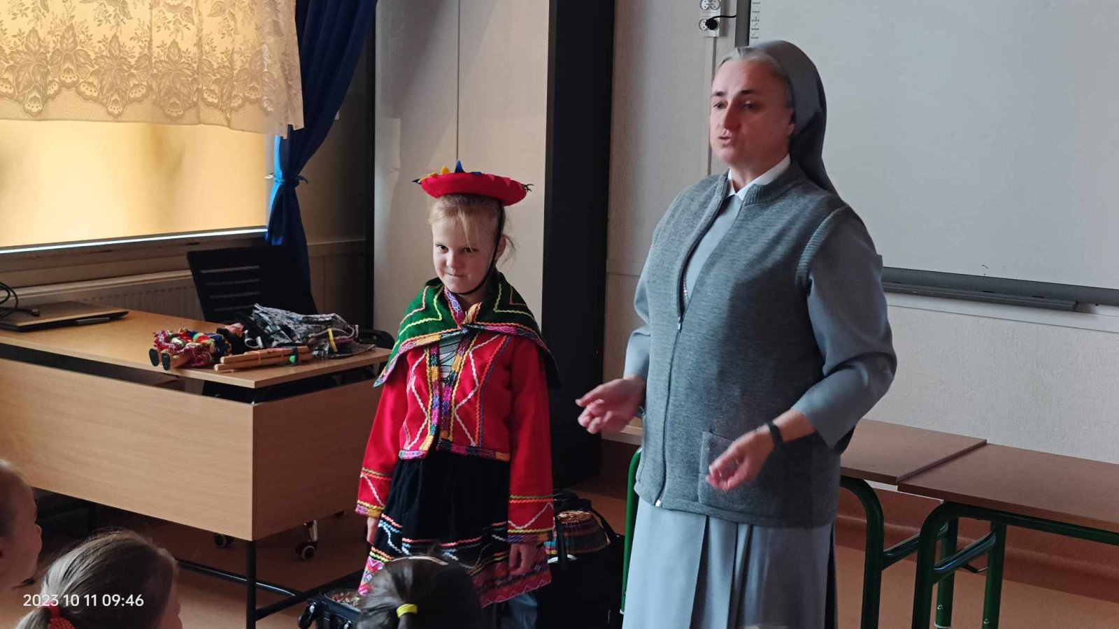 Uczniowie naszej szkoły 11 października uczestniczyli w spotkaniu z siostrą Urszulą Myszak – misjonarką, która 13 lat spędziła w Peru. Siostra podczas swojego pobytu w Peru zajmowała się pracą z dziećmi, prowadziła działalność katechetyczną i posługę pielęgniarską. Siostra Urszula jest związana z Lubelszczyzną, ponieważ pochodzi z niewielkiej miejscowości położonej w okolicach Biłgoraja. Dzięki niej przedszkolaki oraz uczniowie klas I-VII mogli wybrać się w wirtualną podróż do daleko położonego Peru. Siostra Urszula opowiadała o codziennym życiu Peruwiańczyków oraz ich radościach i troskach, pokazując bardzo ciekawe zdjęcia, a także eksponaty przywiezione z Peru. Dzieci mogły posłuchać tradycyjnej muzyki peruwiańskiej, nauczyć się kilku hiszpańskich słów, przymierzyć piękne regionalne stroje mieszkańców tego kraju, a nawet zaśpiewać piosenkę w języku hiszpańskim. Spotkanie zakończyło się wspólnym odczytaniem wiersza „Każdy może zostać misjonarzem”. Dziękujemy siostrze Urszuli za wizytę w naszej szkole oraz za wirtualną podróż do tak pięknego i ciekawego kraju, jakim jest Peru.