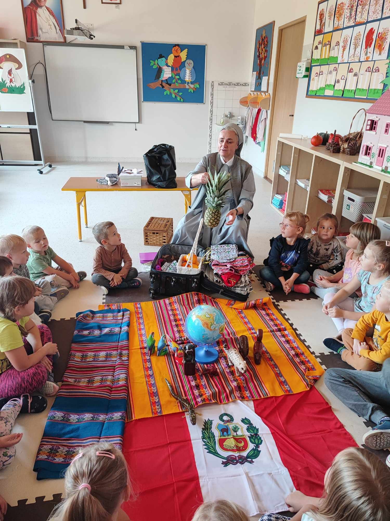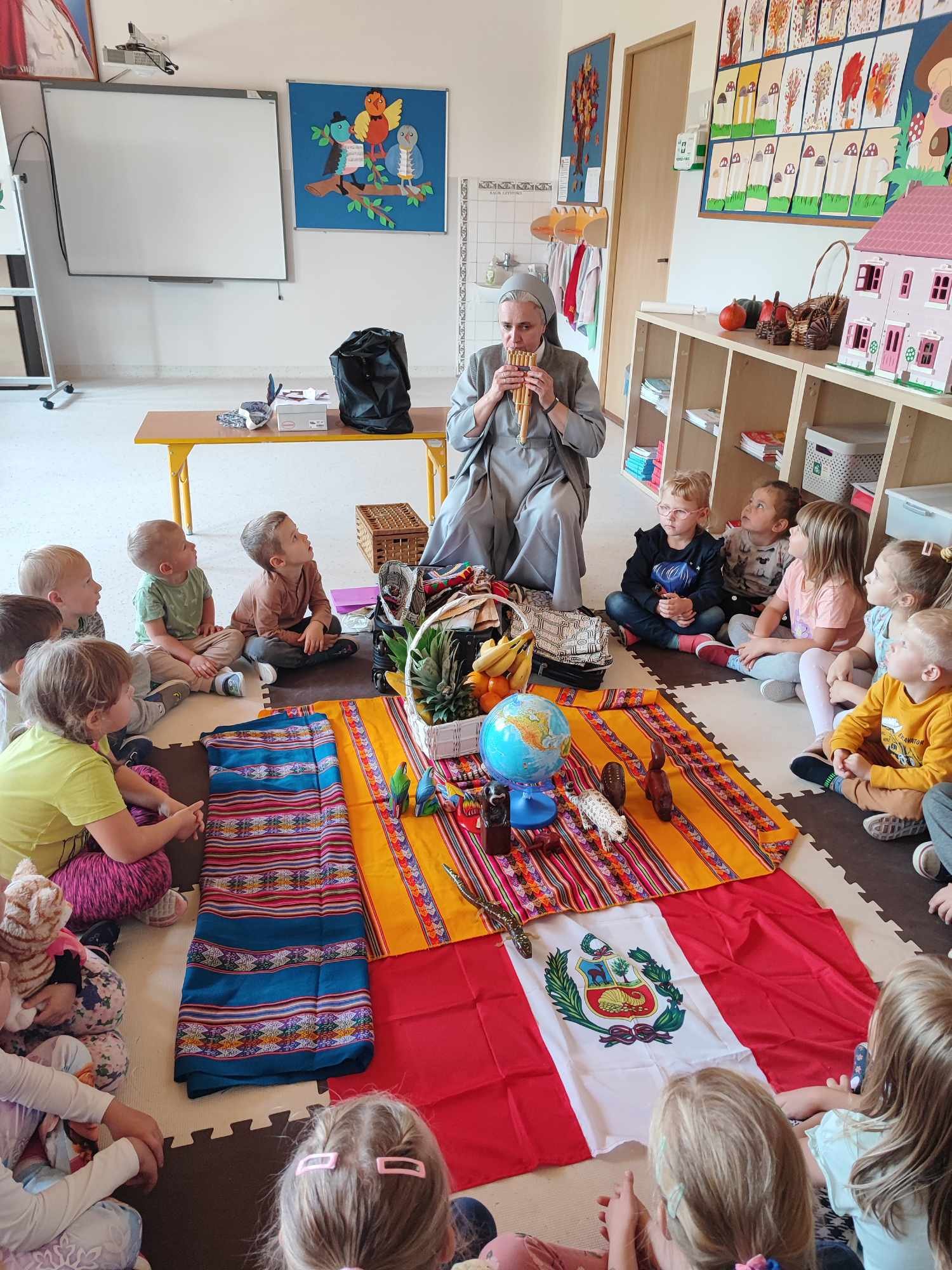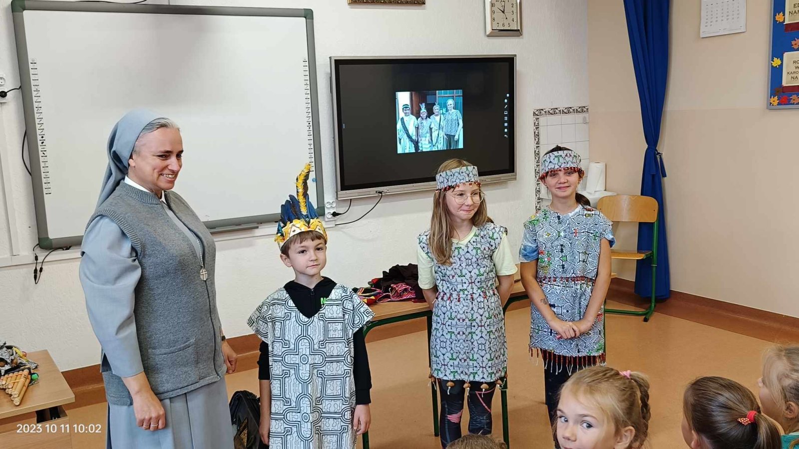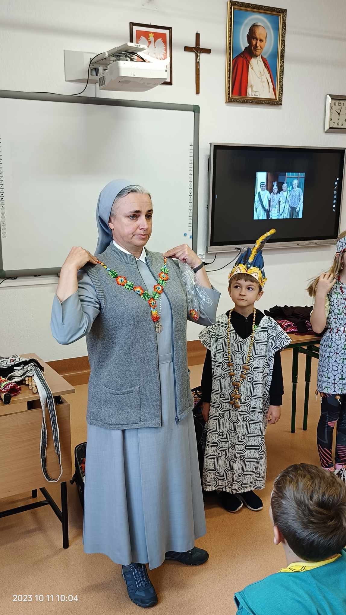 Uczniowie naszej szkoły 11 października uczestniczyli w spotkaniu z siostrą Urszulą Myszak – misjonarką, która 13 lat spędziła w Peru. Siostra podczas swojego pobytu w Peru zajmowała się pracą z dziećmi, prowadziła działalność katechetyczną i posługę pielęgniarską. Siostra Urszula jest związana z Lubelszczyzną, ponieważ pochodzi z niewielkiej miejscowości położonej w okolicach Biłgoraja. Dzięki niej przedszkolaki oraz uczniowie klas I-VII mogli wybrać się w wirtualną podróż do daleko położonego Peru. Siostra Urszula opowiadała o codziennym życiu Peruwiańczyków oraz ich radościach i troskach, pokazując bardzo ciekawe zdjęcia, a także eksponaty przywiezione z Peru. Dzieci mogły posłuchać tradycyjnej muzyki peruwiańskiej, nauczyć się kilku hiszpańskich słów, przymierzyć piękne regionalne stroje mieszkańców tego kraju, a nawet zaśpiewać piosenkę w języku hiszpańskim. Spotkanie zakończyło się wspólnym odczytaniem wiersza „Każdy może zostać misjonarzem”. Dziękujemy siostrze Urszuli za wizytę w naszej szkole oraz za wirtualną podróż do tak pięknego i ciekawego kraju, jakim jest Peru.