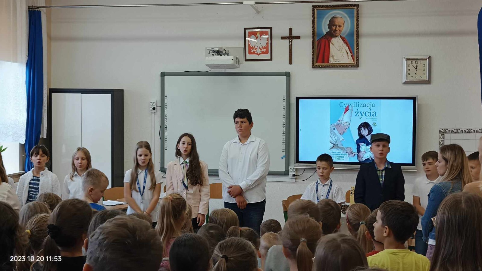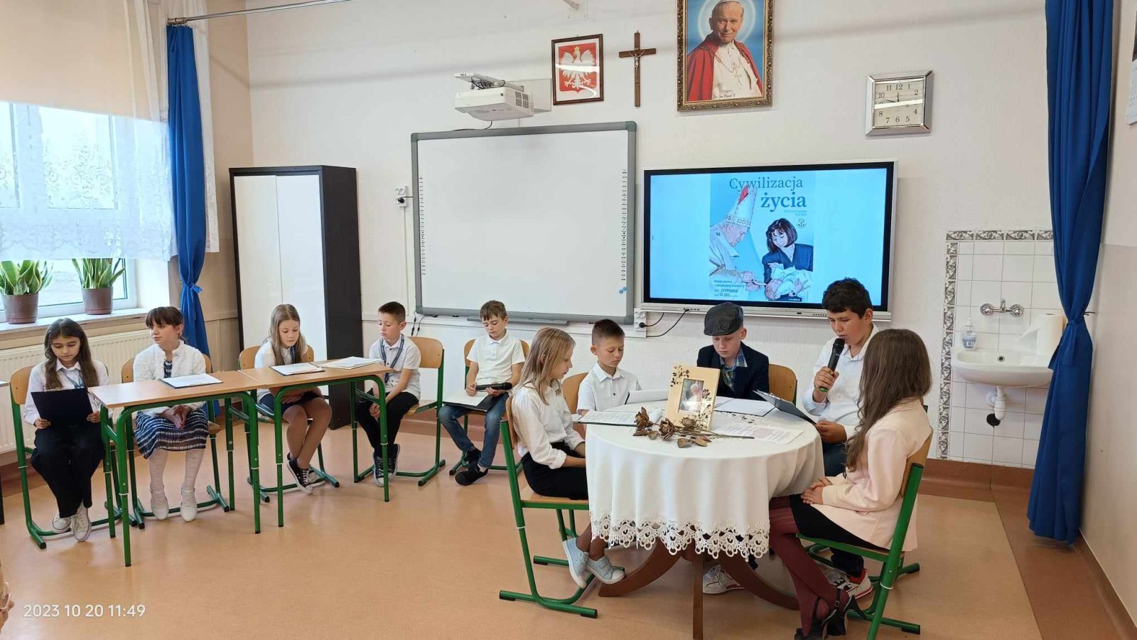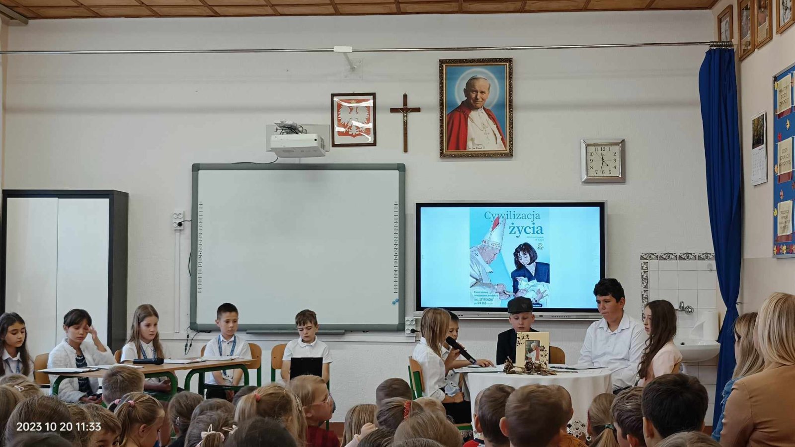 19 października w naszej szkole odbyła się akademia z okazji „Dnia Papieskiego”, w tym roku obchodzonego już po raz XXIII pod hasłem „Cywilizacja życia”. Uczniowie klas III-VI przenieśli nas do studia telewizyjnego, gdzie wcielili się w ludzi, którzy zetknęli się z Ojcem Świętym na różnych etapach jego życia, zarówno w Polsce, jak i za granicą. Były wzruszające wspomnienia, świadectwa, myśli zawarte w dokumentach kościelnych, jak również zabawne opowiadania wyciągnięte z życia Jana Pawła II. Nie zabrakło też wspólnego śpiewu „Barki", ulubionej pieśni papieża. To spotkanie przybliżyło nam osobę Ojca Świętego, jako człowieka duchowej głębi, wielkiej modlitwy, przewodnika prowadzącego kościół a także „wielkiego rodaka”, z którego wszyscy jesteśmy dumni. Obchodom „Dnia Papieskiego” w naszej szkole towarzyszyła przeprowadzona już po raz kolejny zbiórka środków na stypendia dla młodych, zdolnych osób pochodzących z małych miejscowości. W tym roku konto fundacji „Dzieło Nowego Tysiąclecia” wsparliśmy kwotą 160 zł.