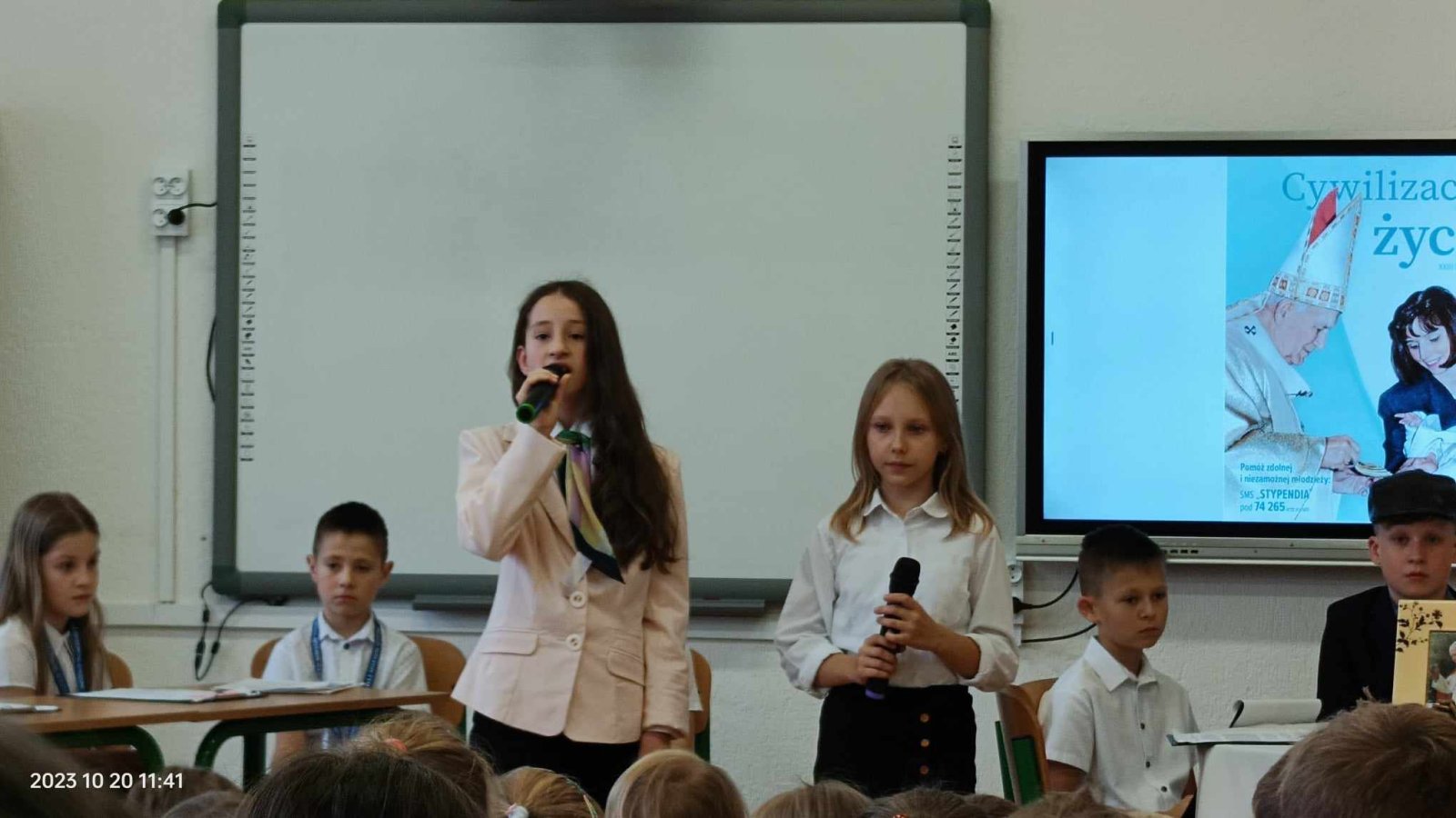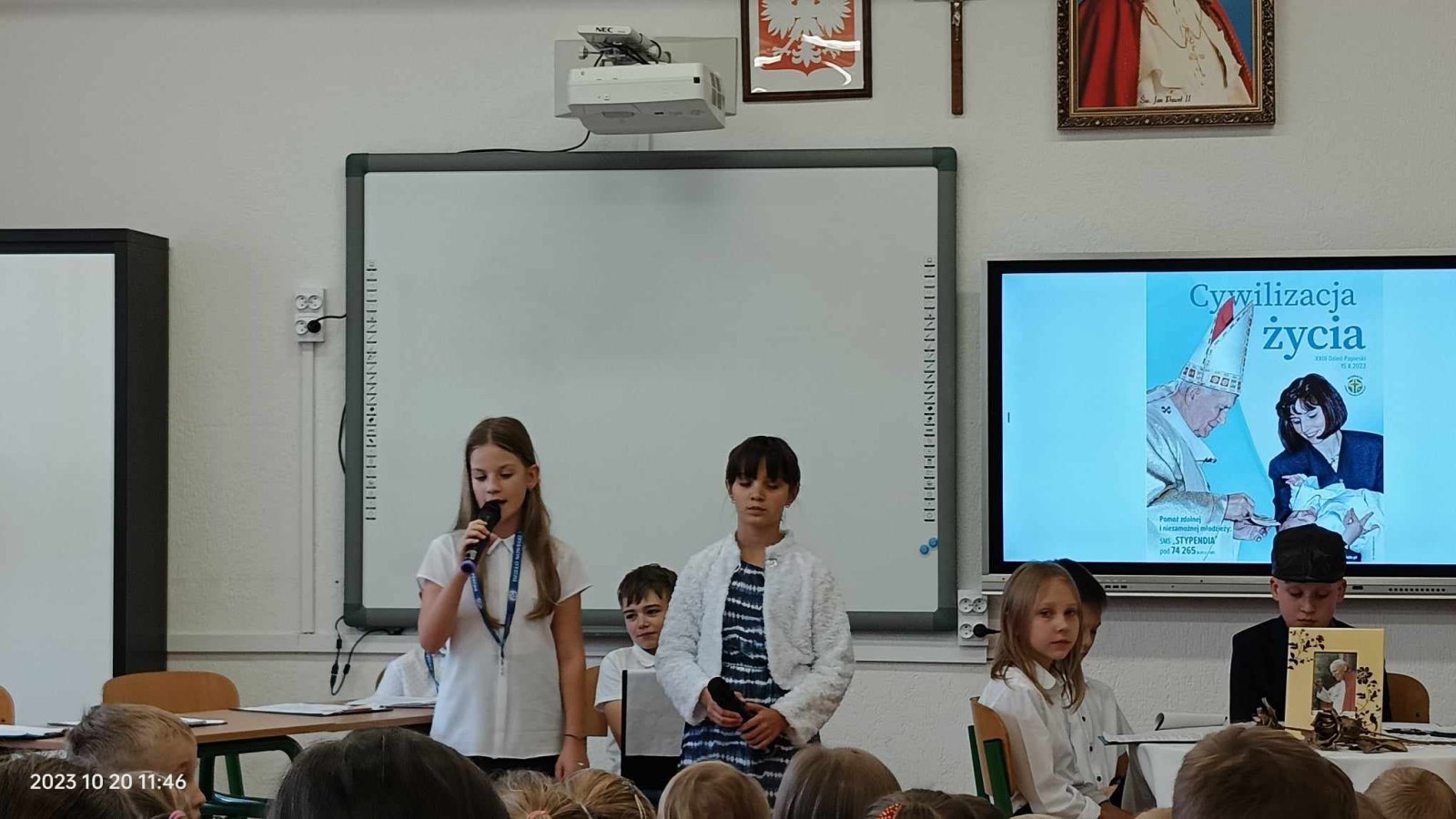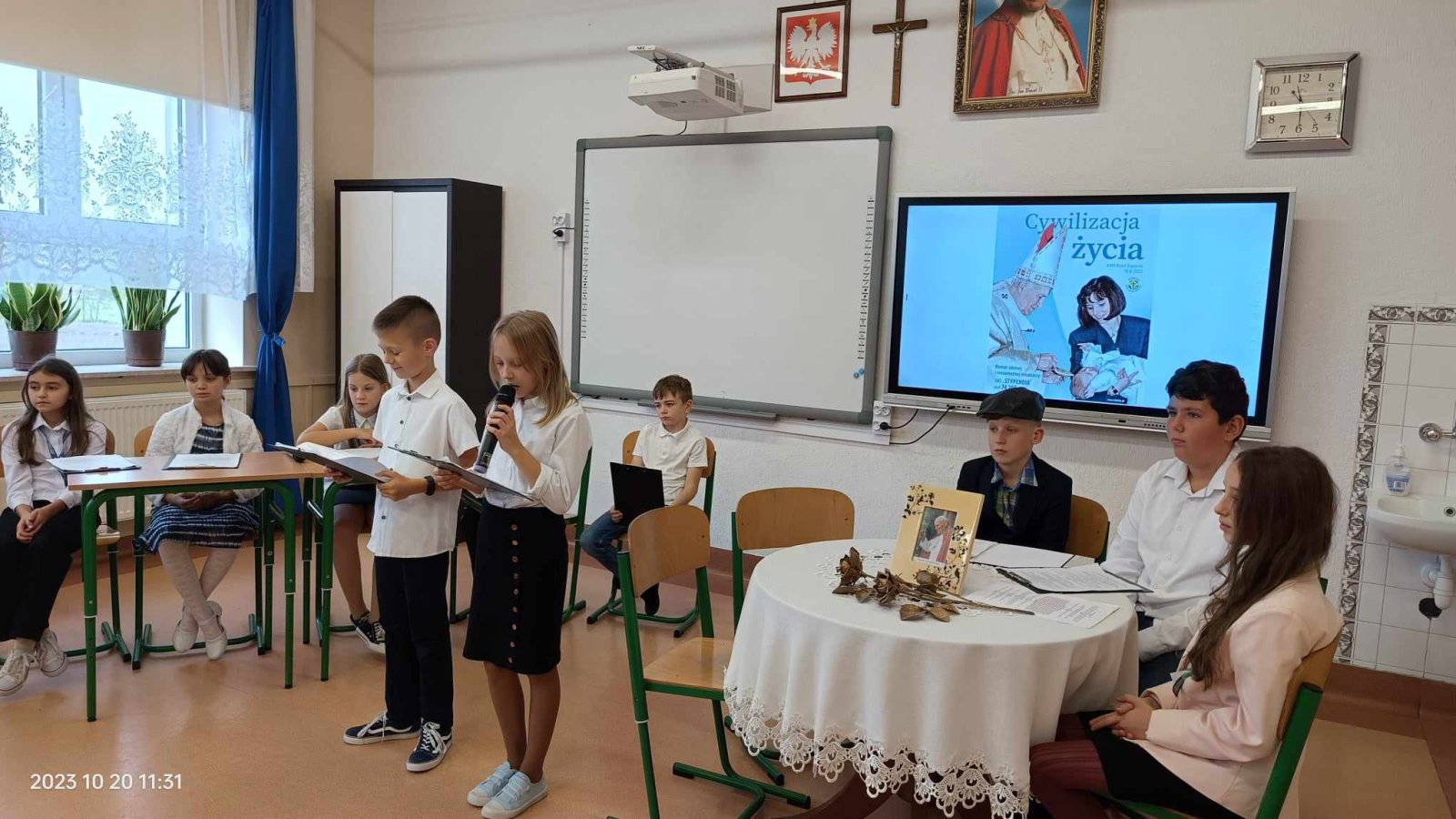 19 października w naszej szkole odbyła się akademia z okazji „Dnia Papieskiego”, w tym roku obchodzonego już po raz XXIII pod hasłem „Cywilizacja życia”. Uczniowie klas III-VI przenieśli nas do studia telewizyjnego, gdzie wcielili się w ludzi, którzy zetknęli się z Ojcem Świętym na różnych etapach jego życia, zarówno w Polsce, jak i za granicą. Były wzruszające wspomnienia, świadectwa, myśli zawarte w dokumentach kościelnych, jak również zabawne opowiadania wyciągnięte z życia Jana Pawła II. Nie zabrakło też wspólnego śpiewu „Barki", ulubionej pieśni papieża. To spotkanie przybliżyło nam osobę Ojca Świętego, jako człowieka duchowej głębi, wielkiej modlitwy, przewodnika prowadzącego kościół a także „wielkiego rodaka”, z którego wszyscy jesteśmy dumni. Obchodom „Dnia Papieskiego” w naszej szkole towarzyszyła przeprowadzona już po raz kolejny zbiórka środków na stypendia dla młodych, zdolnych osób pochodzących z małych miejscowości. W tym roku konto fundacji „Dzieło Nowego Tysiąclecia” wsparliśmy kwotą 160 zł.
