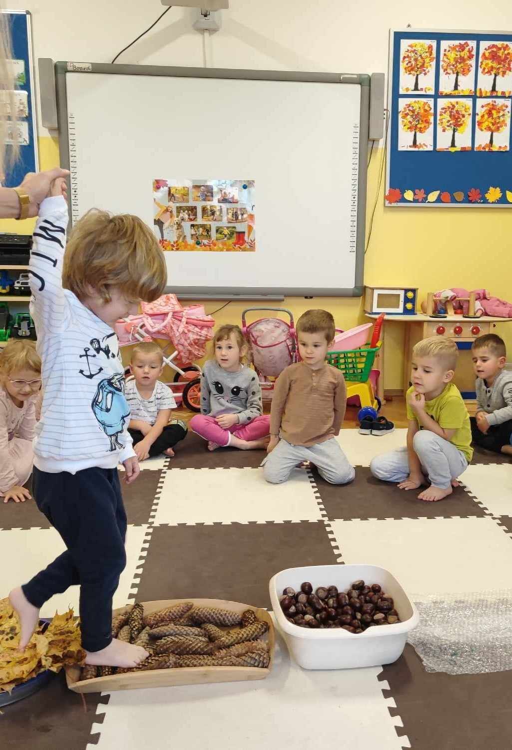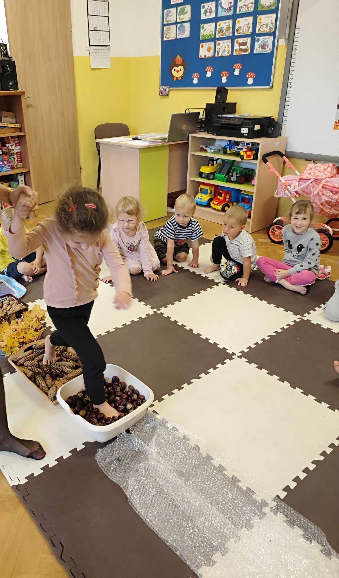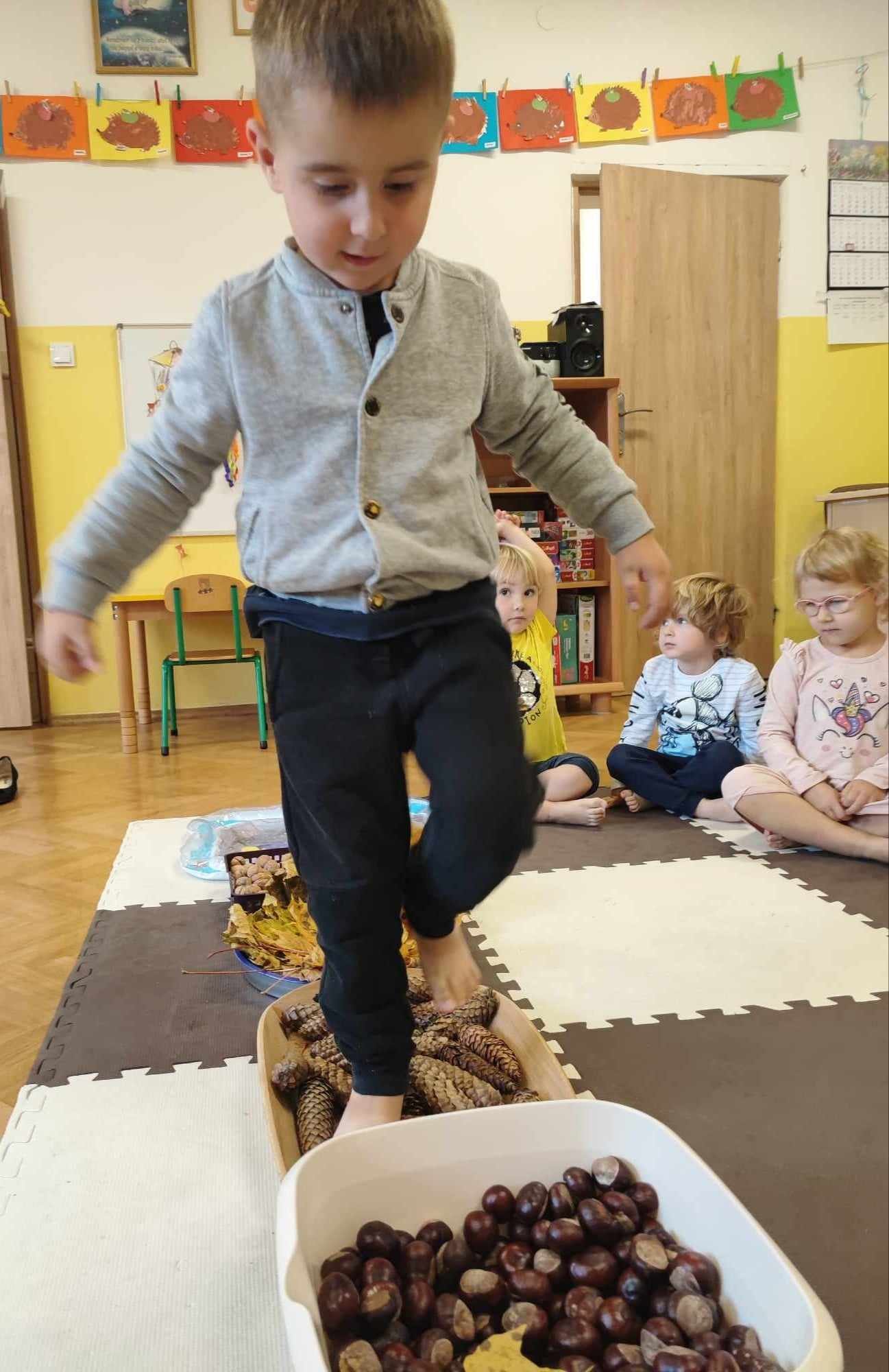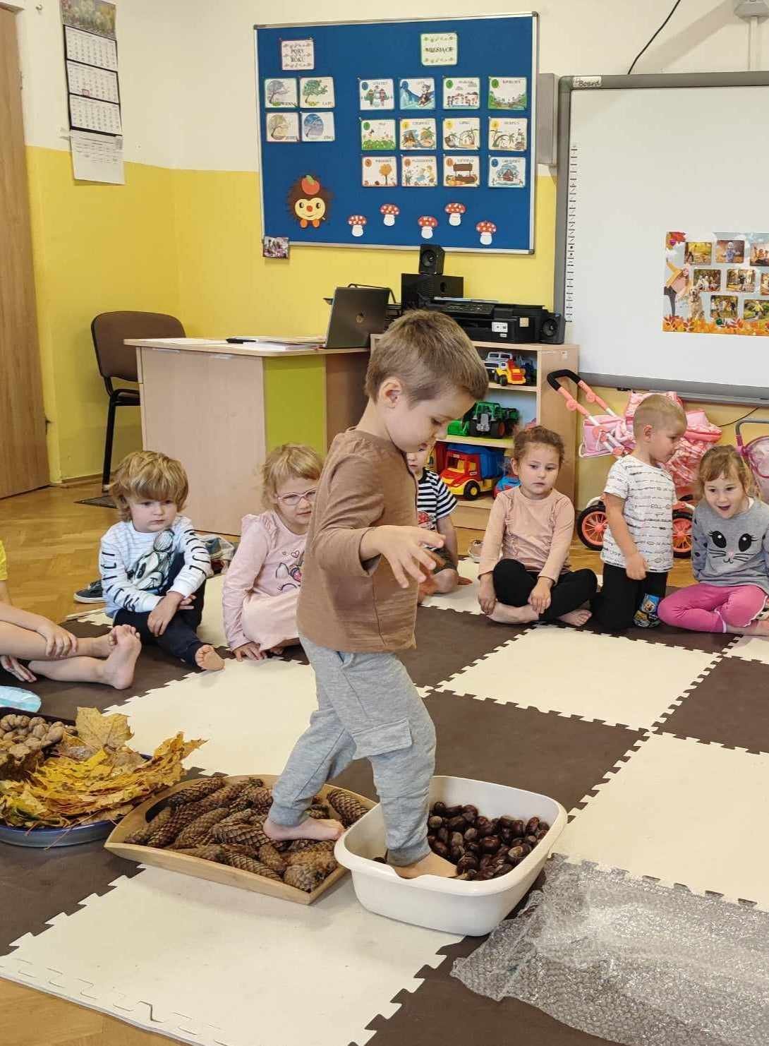 Mowa jest bardzo ważnym czynnikiem w regulacji stosunków człowieka z otoczeniem. Umiejętność sprawnego mówienia we współczesnym świecie jest niezwykle ważna. Na prawidłowy rozwój dziecka składa się nie tylko harmonijny rozwój fizyczny i psychiczny, lecz także odpowiedni rozwój mowy. W związku z nasilającym się zjawiskiem występowania wad wymowy wśród dzieci przedszkolnych powstał projekt „Słowo, dotyk i muzyka dla każdego smyka”. Jest to ogólnopolski projekt edukacyjny łączący zabawy logorytmiczne z zabawami sensorycznymi realizowany w oddziale przedszkolnym w grupie 3-4-latków. W ramach projektu przedszkolaki dostają co miesiąc zestaw zadań do zrealizowania. W październiku zadania wyglądały następująco: wykonanie jesiennej ścieżki sensorycznej, taniec z listkami do utworu „Coppelia walz”, zabawa z instrumentami do piosenki „Co przyniesie jesień”, a także ćwiczenia logopedyczne usprawniające pracę języka m.in. wylizywanie talerzyka z nutelli oraz zlizywanie nutelli z podniebienia. Zajęcia projektowe wspomagają edukację językową dzieci, usprawniają narząd mowy, ale też uwrażliwiają na estetykę muzyczną, na pojęcie rytmu i gestów muzycznych. Dzieci bardzo chętnie i aktywnie uczestniczą w zajęciach projektowych, z niecierpliwością czekamy na listopadowe zadania.