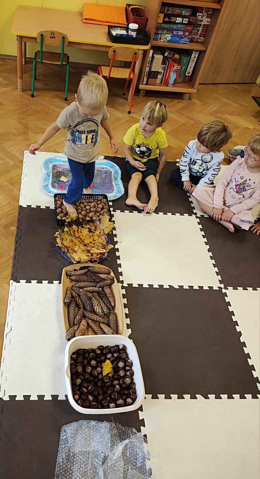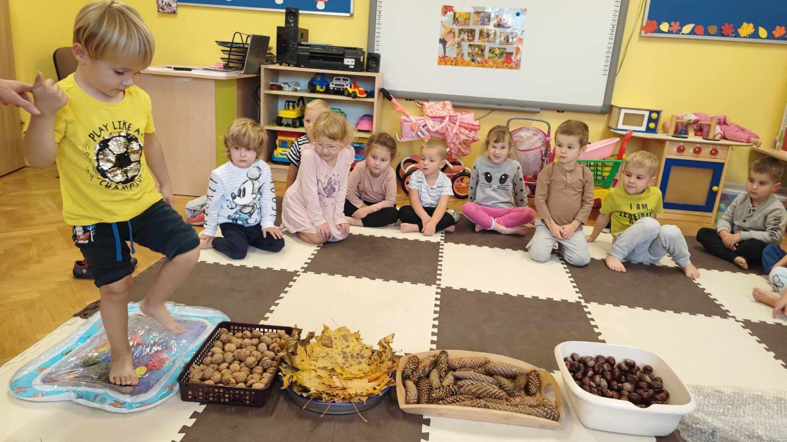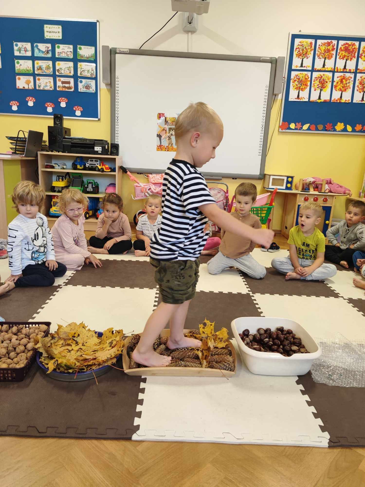 Mowa jest bardzo ważnym czynnikiem w regulacji stosunków człowieka z otoczeniem. Umiejętność sprawnego mówienia we współczesnym świecie jest niezwykle ważna. Na prawidłowy rozwój dziecka składa się nie tylko harmonijny rozwój fizyczny i psychiczny, lecz także odpowiedni rozwój mowy. W związku z nasilającym się zjawiskiem występowania wad wymowy wśród dzieci przedszkolnych powstał projekt „Słowo, dotyk i muzyka dla każdego smyka”. Jest to ogólnopolski projekt edukacyjny łączący zabawy logorytmiczne z zabawami sensorycznymi realizowany w oddziale przedszkolnym w grupie 3-4-latków. W ramach projektu przedszkolaki dostają co miesiąc zestaw zadań do zrealizowania. W październiku zadania wyglądały następująco: wykonanie jesiennej ścieżki sensorycznej, taniec z listkami do utworu „Coppelia walz”, zabawa z instrumentami do piosenki „Co przyniesie jesień”, a także ćwiczenia logopedyczne usprawniające pracę języka m.in. wylizywanie talerzyka z nutelli oraz zlizywanie nutelli z podniebienia. Zajęcia projektowe wspomagają edukację językową dzieci, usprawniają narząd mowy, ale też uwrażliwiają na estetykę muzyczną, na pojęcie rytmu i gestów muzycznych. Dzieci bardzo chętnie i aktywnie uczestniczą w zajęciach projektowych, z niecierpliwością czekamy na listopadowe zadania.