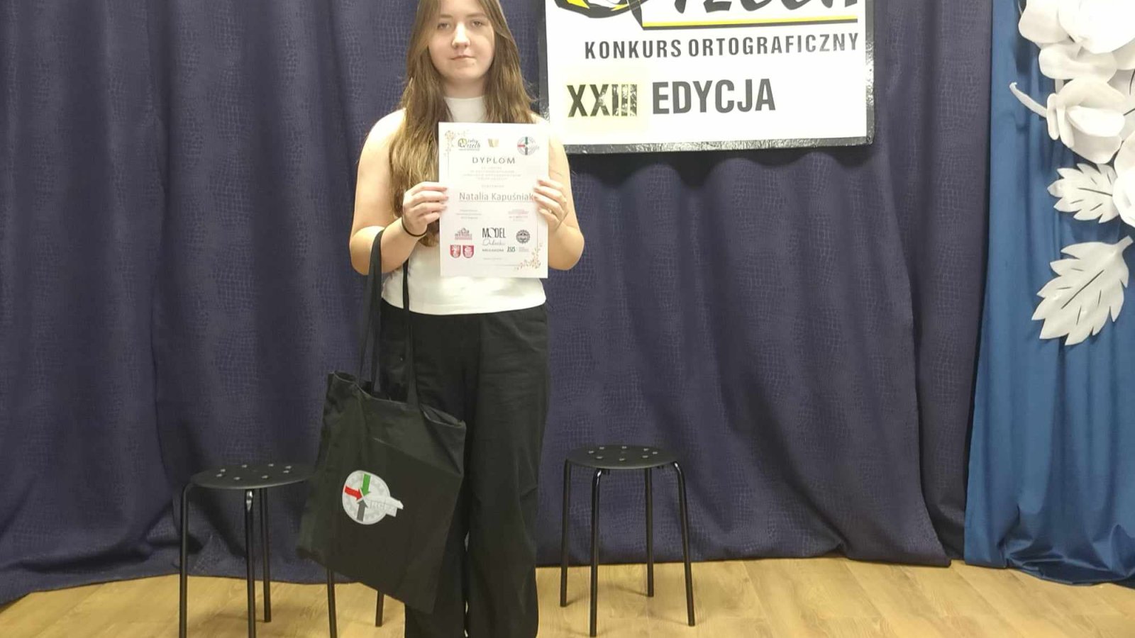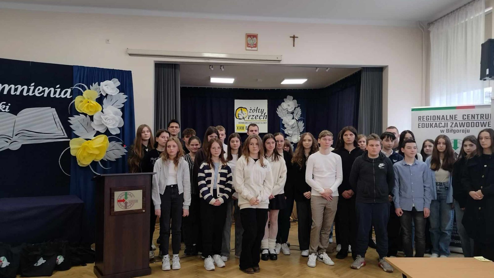 20 marca w Regionalnym Centrum Edukacji Zawodowej w Biłgoraju odbyła się XXIII edycja Powiatowego Konkursu Ortograficznego "Żółty Orzech" adresowanego do uczniów klas siódmych i ósmych szkół podstawowych oraz do uczniów szkół ponadpodstawowych. Jak do roku najpierw przeprowadzono eliminacje szkolne. Osoba, która popełniła najmniej błędów w dyktandzie, otrzymywała nominację do finału powiatowego. Do tegorocznych zmagań z ortografią przystąpiło niespełna czterdziestu uczestników. Naszą szkołę reprezentowała Natalia Kapuśniak z klasy VII. Mimo że nie udało się stanąć na podium, warto zaznaczyć, że sam udział w konkursie jest już dużym osiągnięciem. Na zakończenie wszyscy uczniowie dostali dyplomy oraz nagrody rzeczowe z rąk organizatorów.
