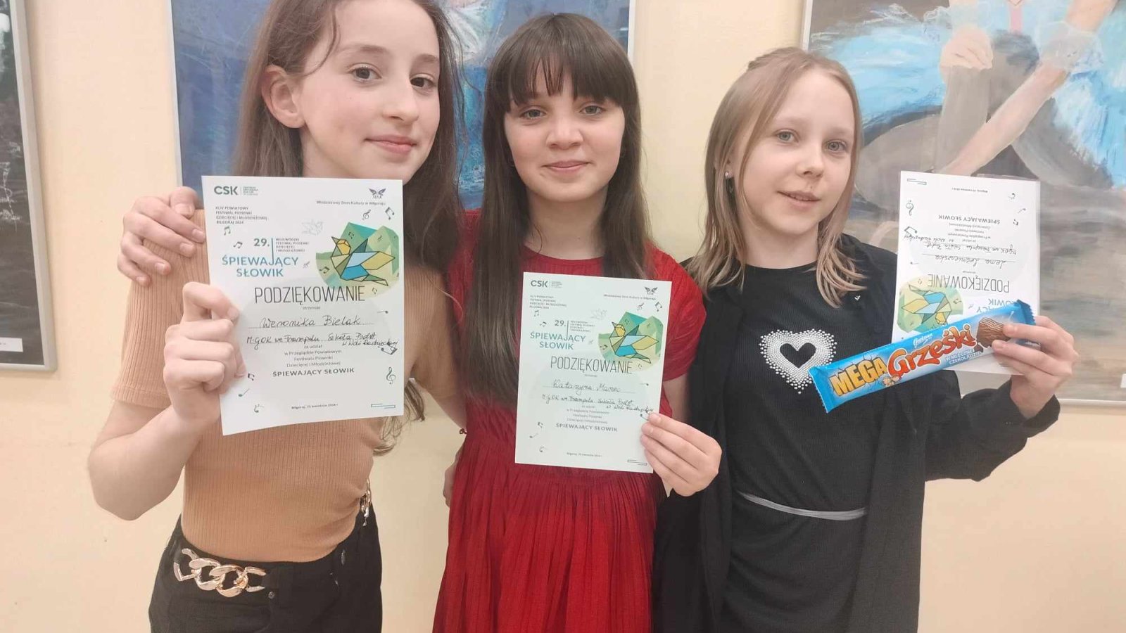 Trzy uczennice naszej szkoły - Katarzyna Marzec i Weronika Bielak z klasy IV oraz Lena Leśniewska z klasy V wzięły udział w powiatowym przeglądzie do 29. Wojewódzkiego Festiwalu Piosenki Dziecięcej i Młodzieżowej "Śpiewający Słowik". Przesłuchania odbyły się w Młodzieżowym Domu Kultury. Wydarzenie miało na celu głównie rozwijanie zainteresowań dzieci i młodzieży oraz umożliwienie wymiany doświadczeń młodych wokalistów.