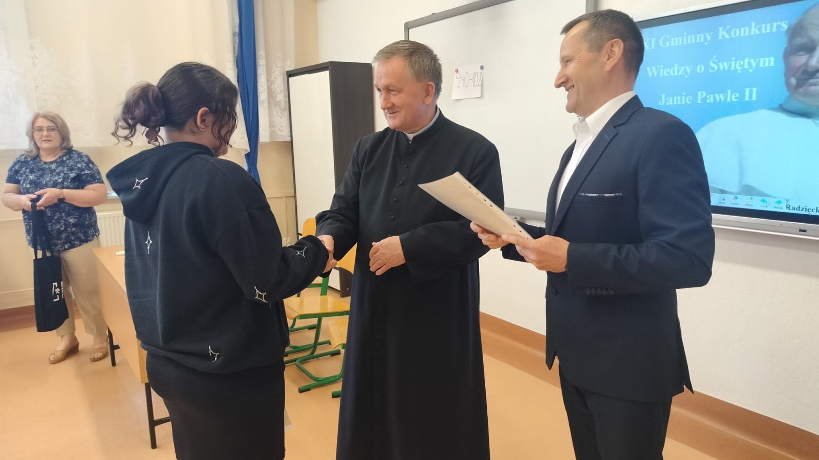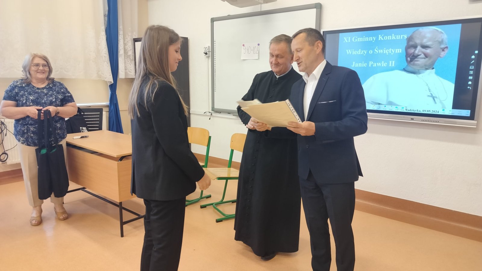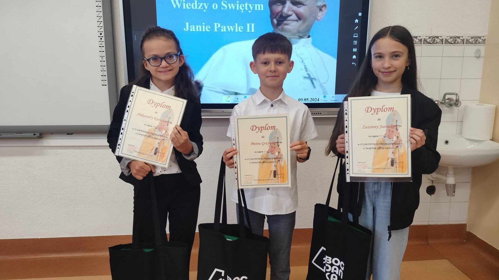 W czwartek 9 maja w naszej szkole już po raz jedenasty zorganizowano Gminny Konkurs Wiedzy o Świętym Janie Pawle II. Wzięli w nim udział reprezentanci: Szkoły Podstawowej im. Św. Stanisława Kostki w Teodorówce, Szkoły Podstawowej im. Józefa Piłsudskiego we Frampolu oraz Szkoły Podstawowej im. Jana Pawła II w Woli Radzięckiej. Uczestnicy wykazali się wnikliwą znajomością biografii Papieża Polaka.