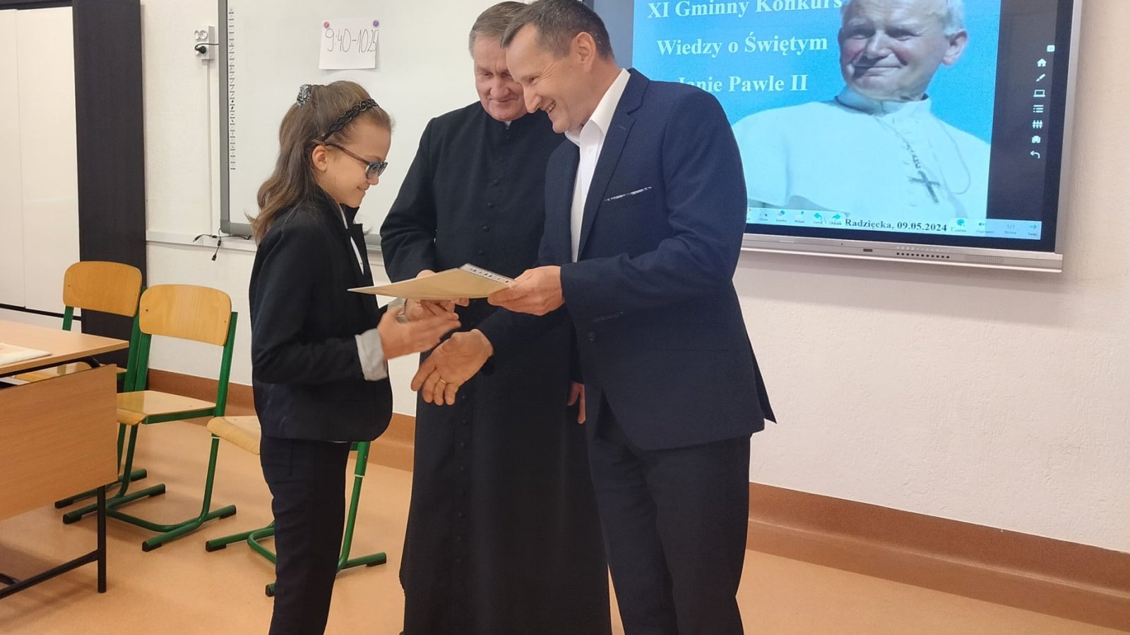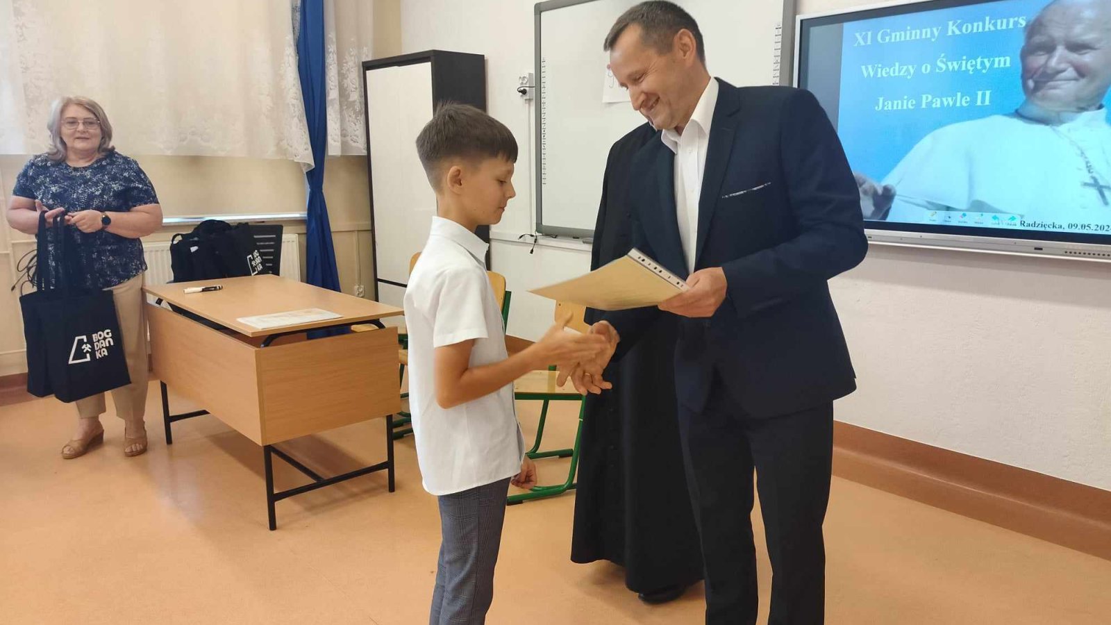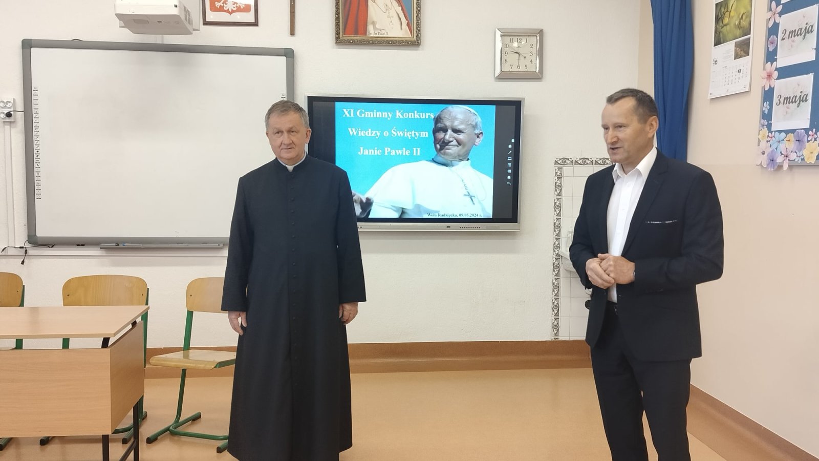 W czwartek 9 maja w naszej szkole już po raz jedenasty zorganizowano Gminny Konkurs Wiedzy o Świętym Janie Pawle II. Wzięli w nim udział reprezentanci: Szkoły Podstawowej im. Św. Stanisława Kostki w Teodorówce, Szkoły Podstawowej im. Józefa Piłsudskiego we Frampolu oraz Szkoły Podstawowej im. Jana Pawła II w Woli Radzięckiej. Uczestnicy wykazali się wnikliwą znajomością biografii Papieża Polaka.