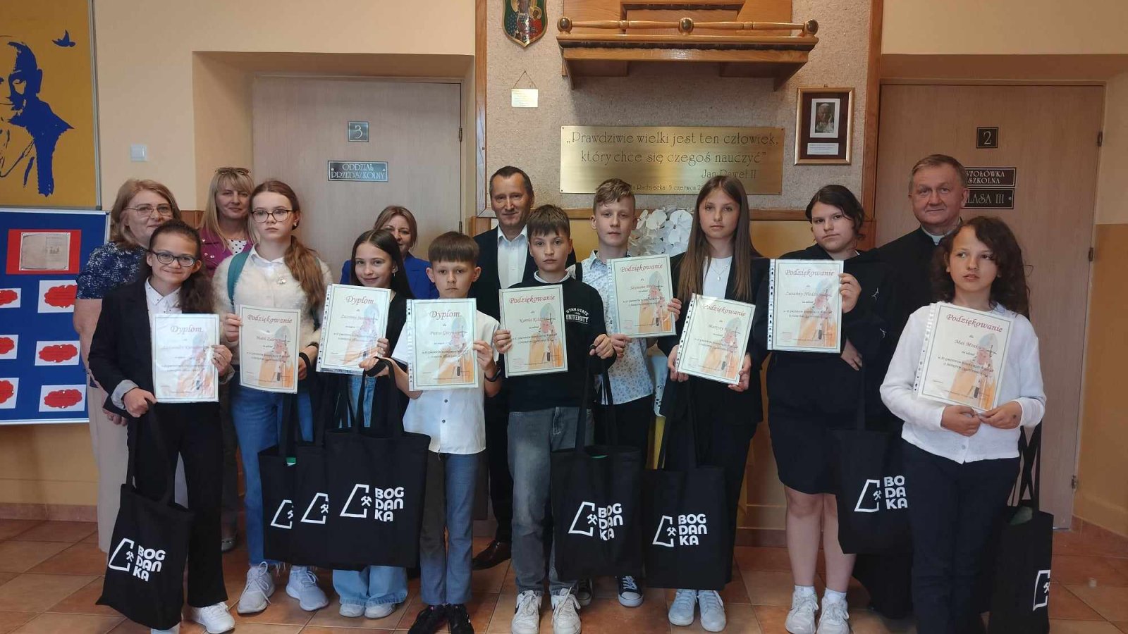 Wszyscy uczniowie biorący udział w konkursie otrzymali dyplomy, a także nagrody rzeczowe ufundowane przez Zarząd LW Bogdanka oraz przez proboszcza parafii Radzięcin - Księdza Adama Czupicha, który - jak zwykle - zaszczycił nas również swoją obecnością w tym szczególnym dla całej społeczności szkolnej dniu.