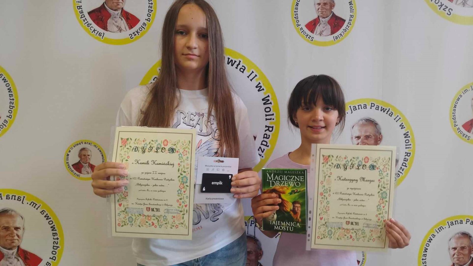 Cztery uczennice naszej szkoły (Weronika Bielak i Katarzyna Marzec z klasy IV oraz Kamila Kamińska i Natalia Kapuśniak z klasy VII) próbowały swoich sił w VII Powiatowym Konkursie Poetyckim "Biłgorajskie - jakie cudne..." zorganizowanym przez Szkołę Podstawową nr 5 im. Księdza Jana Twardowskiego w Biłgoraju. Przedsięwzięcie, jak co roku, stało się dla dzieci i młodzieży niezastąpioną szansą na pokazanie szerszemu gronu odbiorców własnej twórczości poetyckiej. W tegorocznej edycji organizatorzy zaproponowali uczestnikom hasło przewodnie: "To, co mnie zachwyca...". Jury konkursu postanowiło przyznać Kamili Kamińskiej II miejsce w kategorii klas VII-VIII, natomiast Katarzyna Marzec otrzymała wyróżnienie w kategorii klas IV-VI. Oprócz cennych nagród rzeczowych dodatkowym wyróżnieniem dla laureatów był fakt, że najlepsze utwory poetyckie zostały opublikowane w antologii pokonkursowej. Wielkie gratulacje!