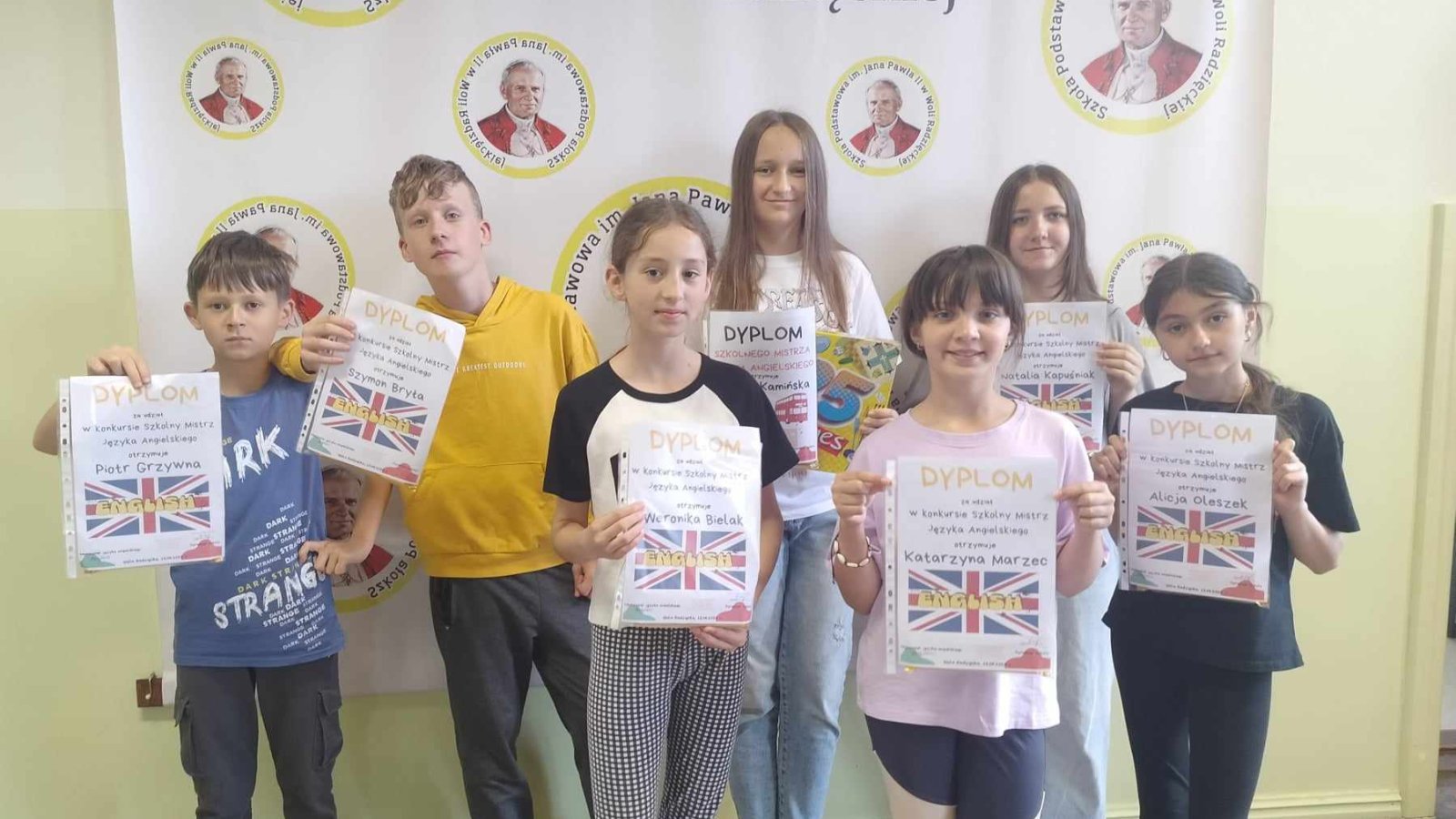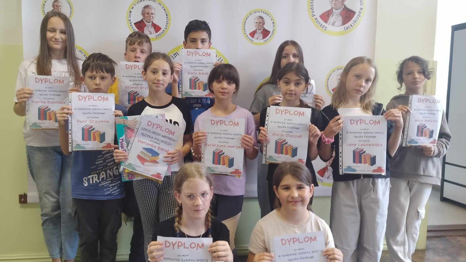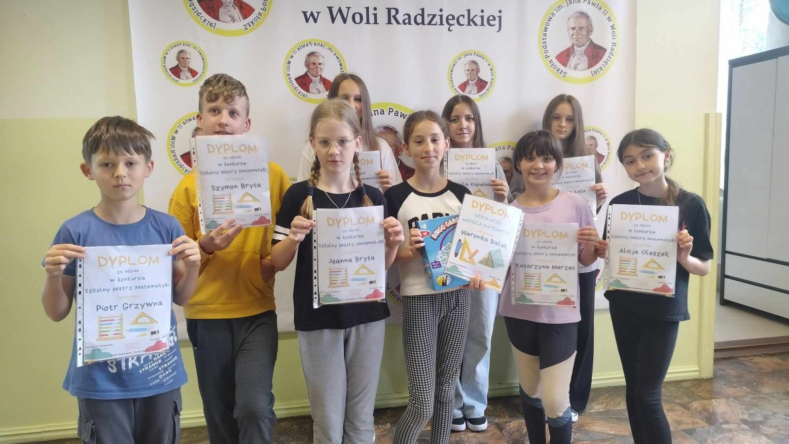 Już po raz drugi chętni uczniowie klas starszych mogli przystąpić do trwającej przez cały rok szkolny rywalizacji o tytuł Mistrza Języka Polskiego, Mistrza Matematyki oraz Mistrza Języka Angielskiego. Uczestnicy co miesiąc dostawali zestaw zadań z danego przedmiotu, które należało rozwiązać, a następnie oddać do sprawdzenia. Przystąpienie do wyzwania wymagało więc nie tylko wykazania się wiedzą z poszczególnych dziedzin, ale również systematycznej pracy. W czwartek 13 czerwca nastąpiło rozstrzygnięcie konkursu. Po przeliczeniu punktów okazało się, że Mistrzem Matematyki oraz Mistrzem Języka Polskiego została Weronika Bielak z klasy czwartej. Z kolei tytuł Mistrza Języka Angielskiego przypadł Kamili Kamińskiej z klasy siódmej. Pan dyrektor wręczył uczestnikom dyplomy, a zwycięzcy otrzymali również nagrody rzeczowe. Gratulujemy i zachęcamy wszystkich do udziału w kolejnej edycji przedsięwzięcia.