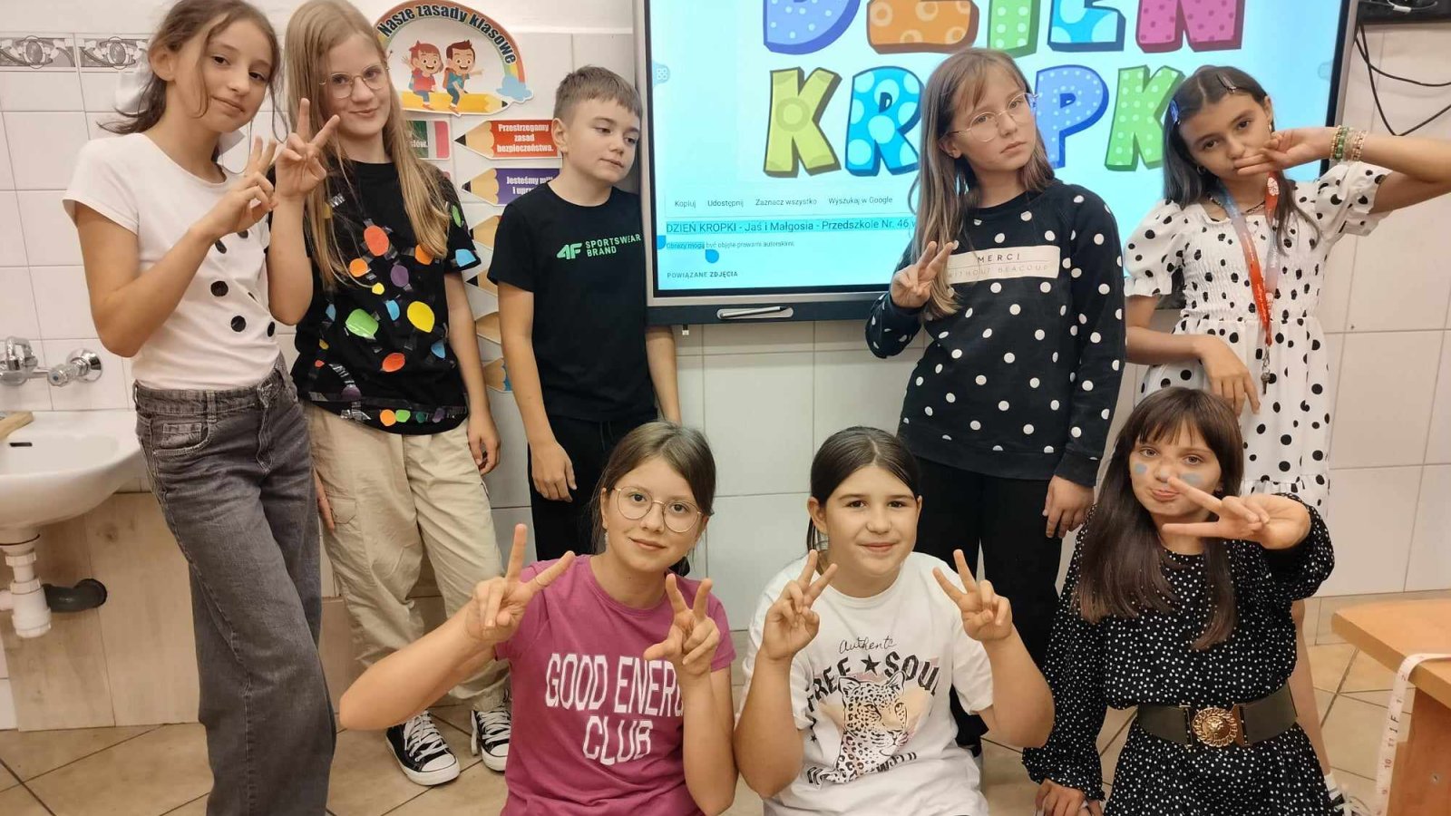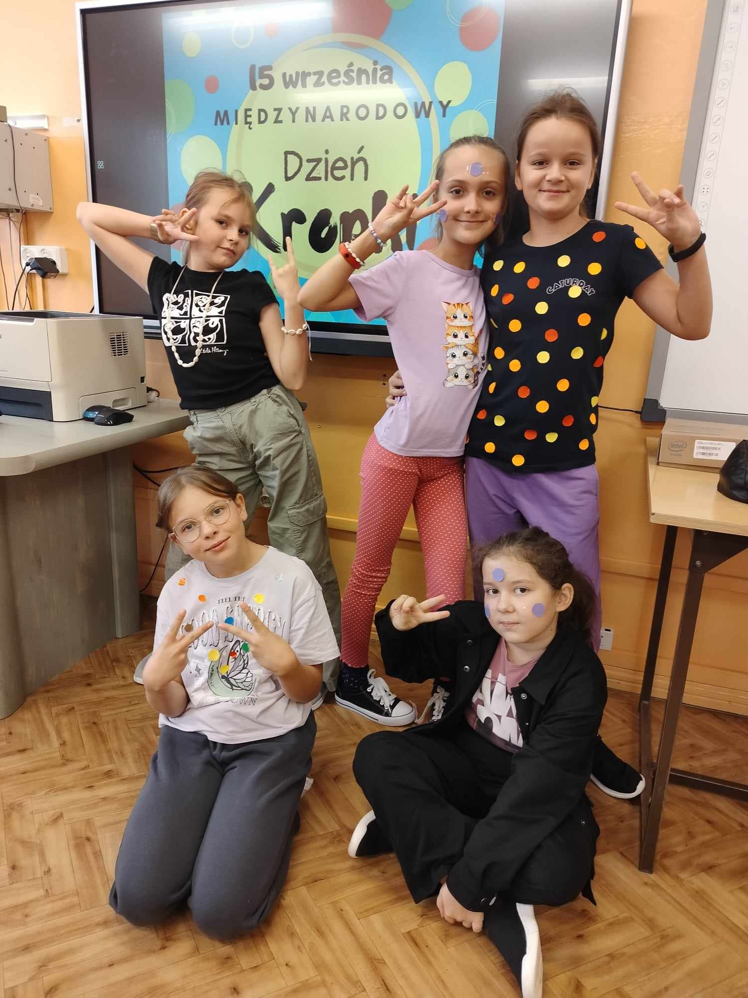 Tradycyjnie w połowie września obchodziliśmy w naszej szkole Dzień Kropki. Zarówno dzieci z klas młodszych, jak i starsi uczniowie, z pomocą nauczycieli starali się tego dnia odkrywać swoje talenty oraz mocne strony, a także wyzwalać drzemiące w nich pokłady kreatywności. Nie brakowało oczywiście dobrej zabawy - wszak taki jest zamysł tego święta. W efekcie podejmowanych podczas lekcji działań powstały chociażby oryginalne prace plastyczne na bazie kropek. Dodatkowo na zajęciach wykorzystywane były gry edukacyjne z tym motywem. Pojawił się nawet pomysł zrobienia kanapek składających się tylko z kropek.