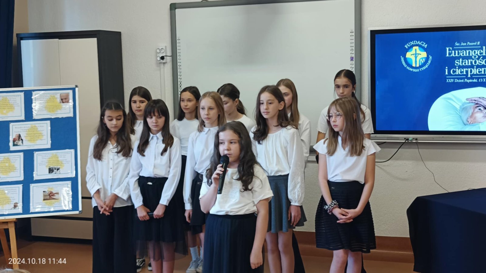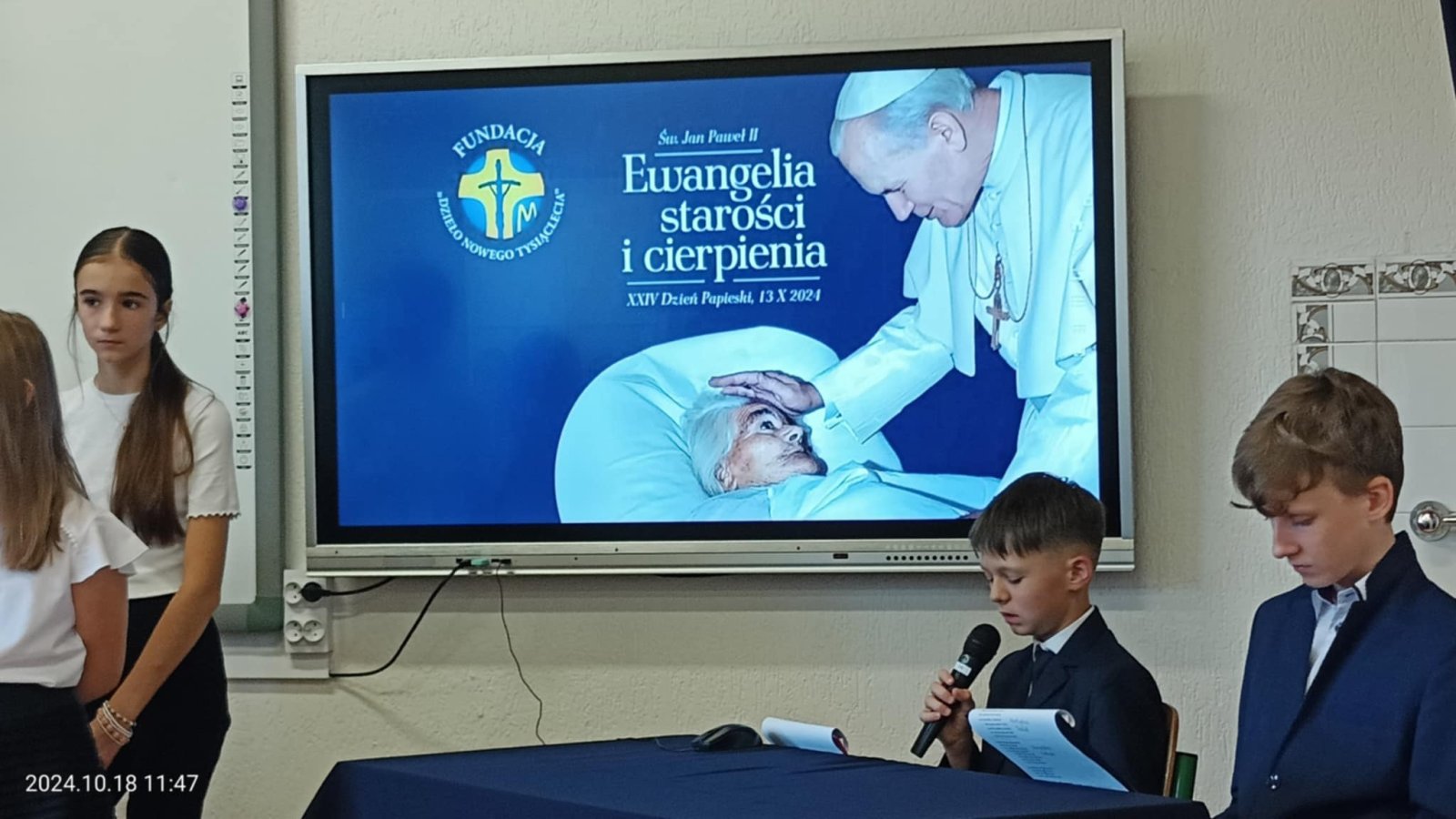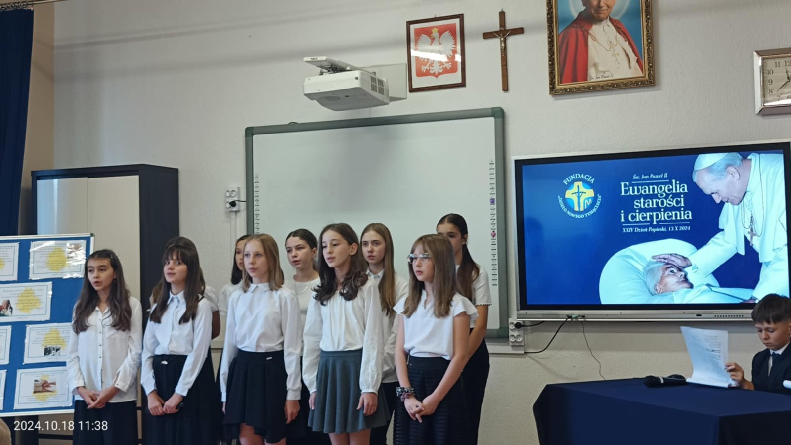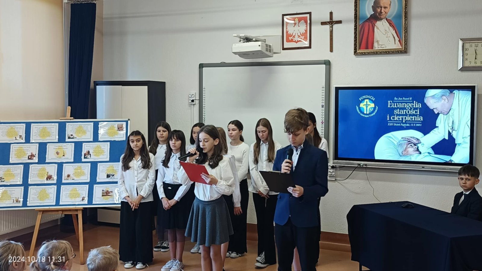 W piątek 18 października w naszej szkole odbyła się uroczysta akademia z okazji XXIV Dnia Papieskiego. W tym roku hasłem przewodnim stały się słowa "Jan Paweł II. Ewangelia starości i cierpienia". Uczniowie przypomnieli niektóre fakty z życia Karola Wojtyły, a także skupili się na Jego nauczaniu dotyczącym cierpienia oraz starości. Występ dopełniły piosenki religijne w wykonaniu szkolnego chórku.
