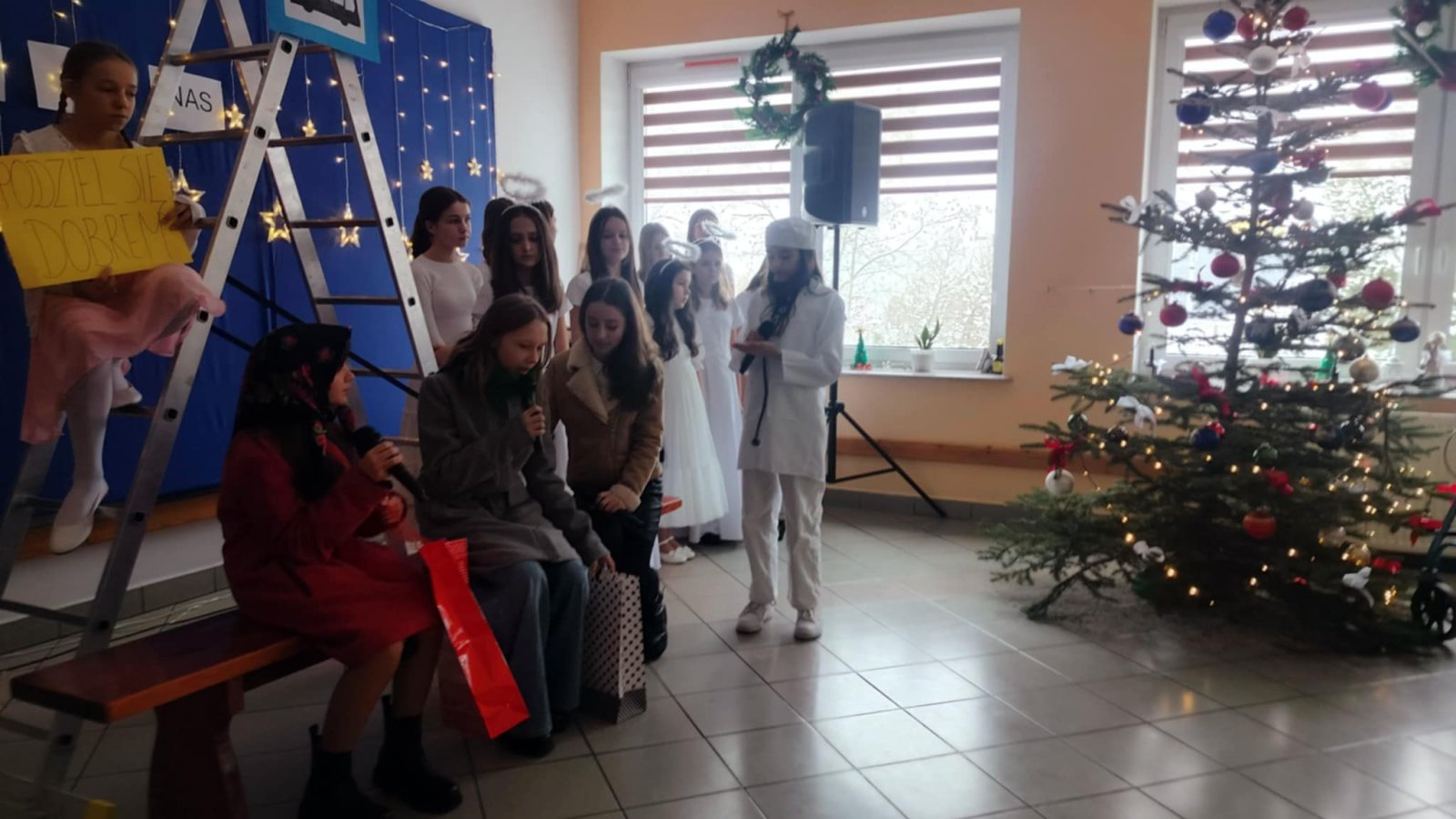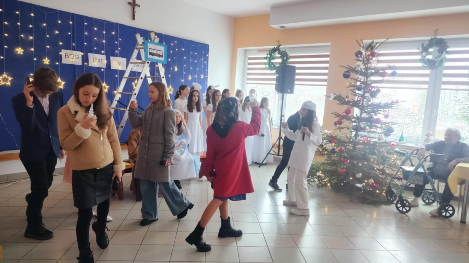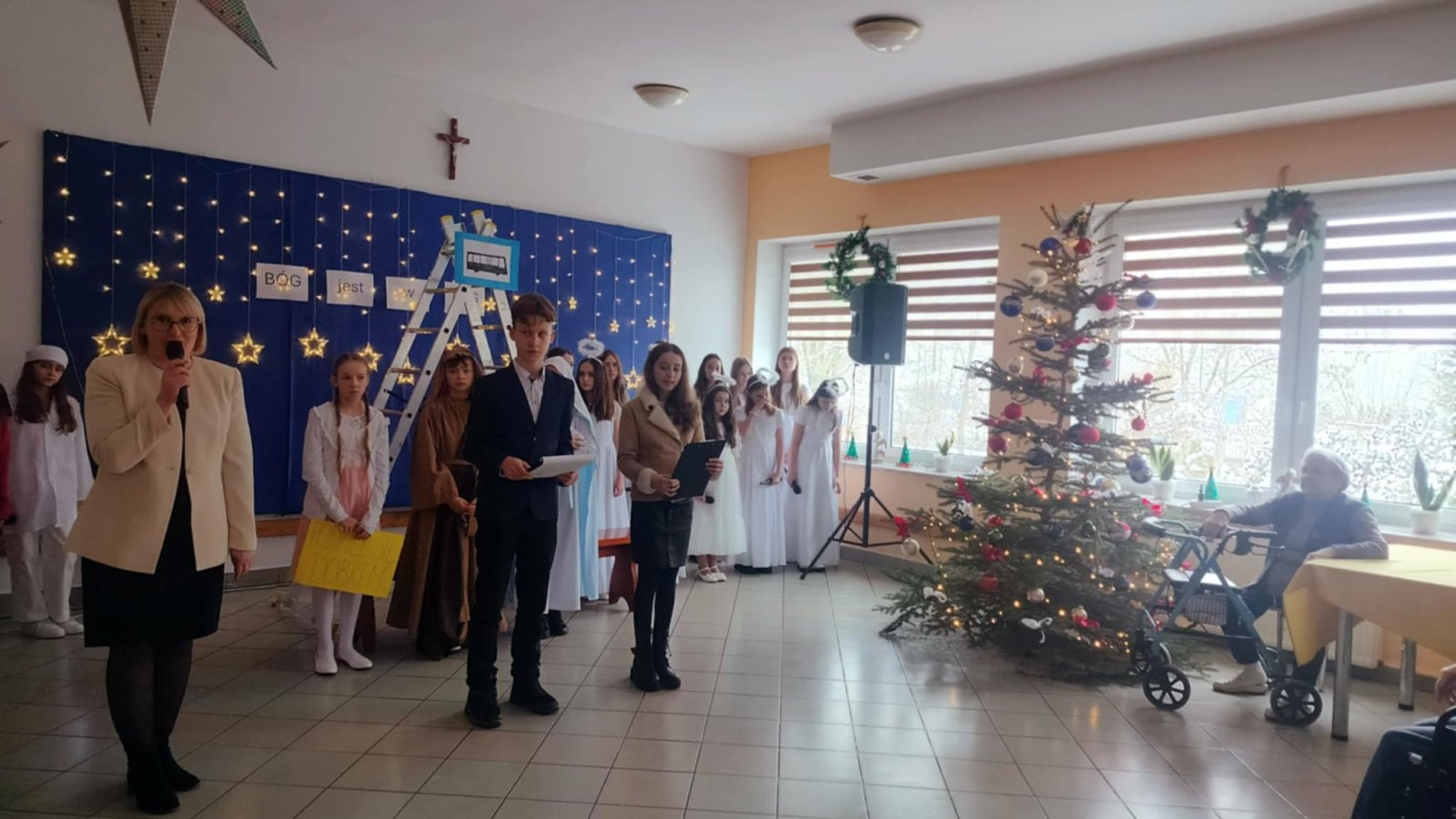 We wtorek 14 stycznia grupa naszych uczniów odwiedziła seniorów z Domu Pomocy Społecznej dla Kombatantów w Biłgoraju. By umilić im czas, młodzi artyści ponownie wystawili spektakl "Iskierka", a także zaśpiewali kolędy i pastorałki. Występ dzieci wywołał radość na twarzach oglądających oraz został nagrodzony gromkimi brawami.
