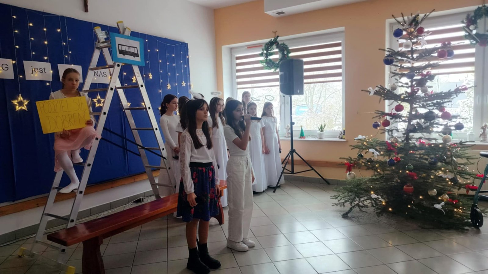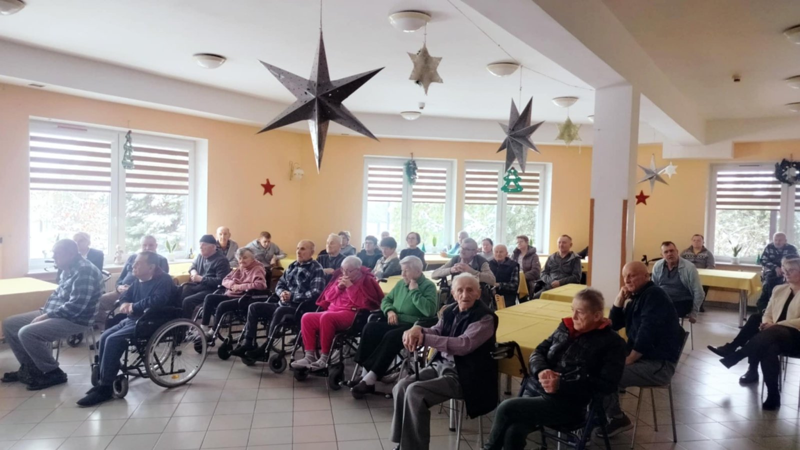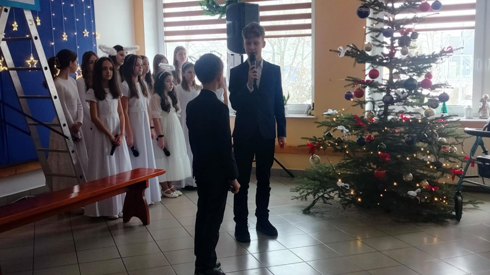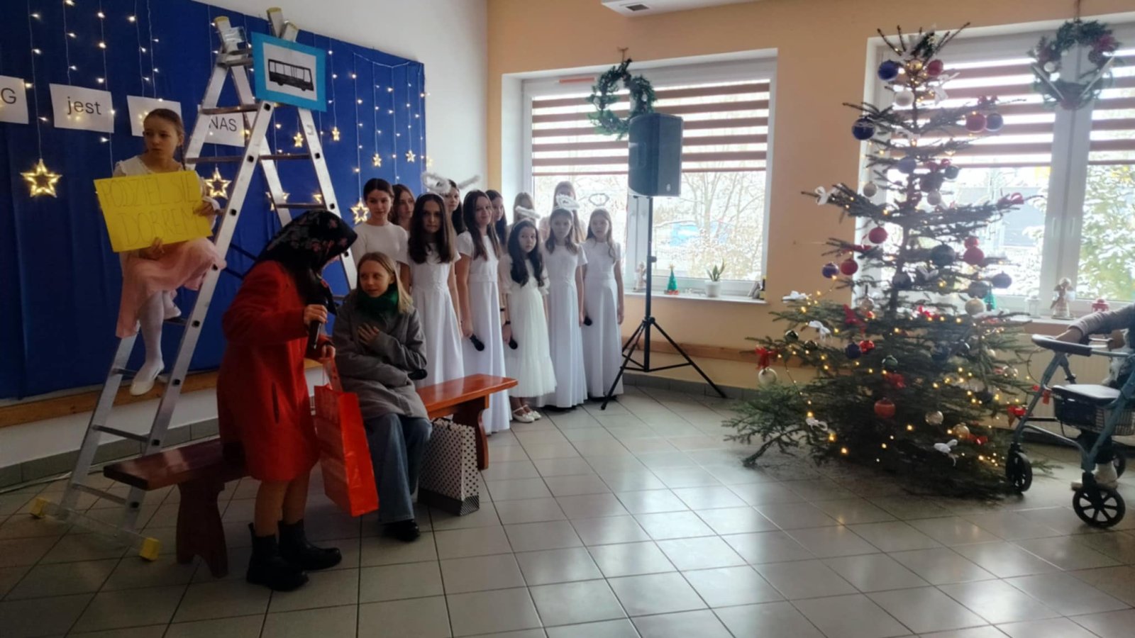 We wtorek 14 stycznia grupa naszych uczniów odwiedziła seniorów z Domu Pomocy Społecznej dla Kombatantów w Biłgoraju. By umilić im czas, młodzi artyści ponownie wystawili spektakl "Iskierka", a także zaśpiewali kolędy i pastorałki. Występ dzieci wywołał radość na twarzach oglądających oraz został nagrodzony gromkimi brawami.