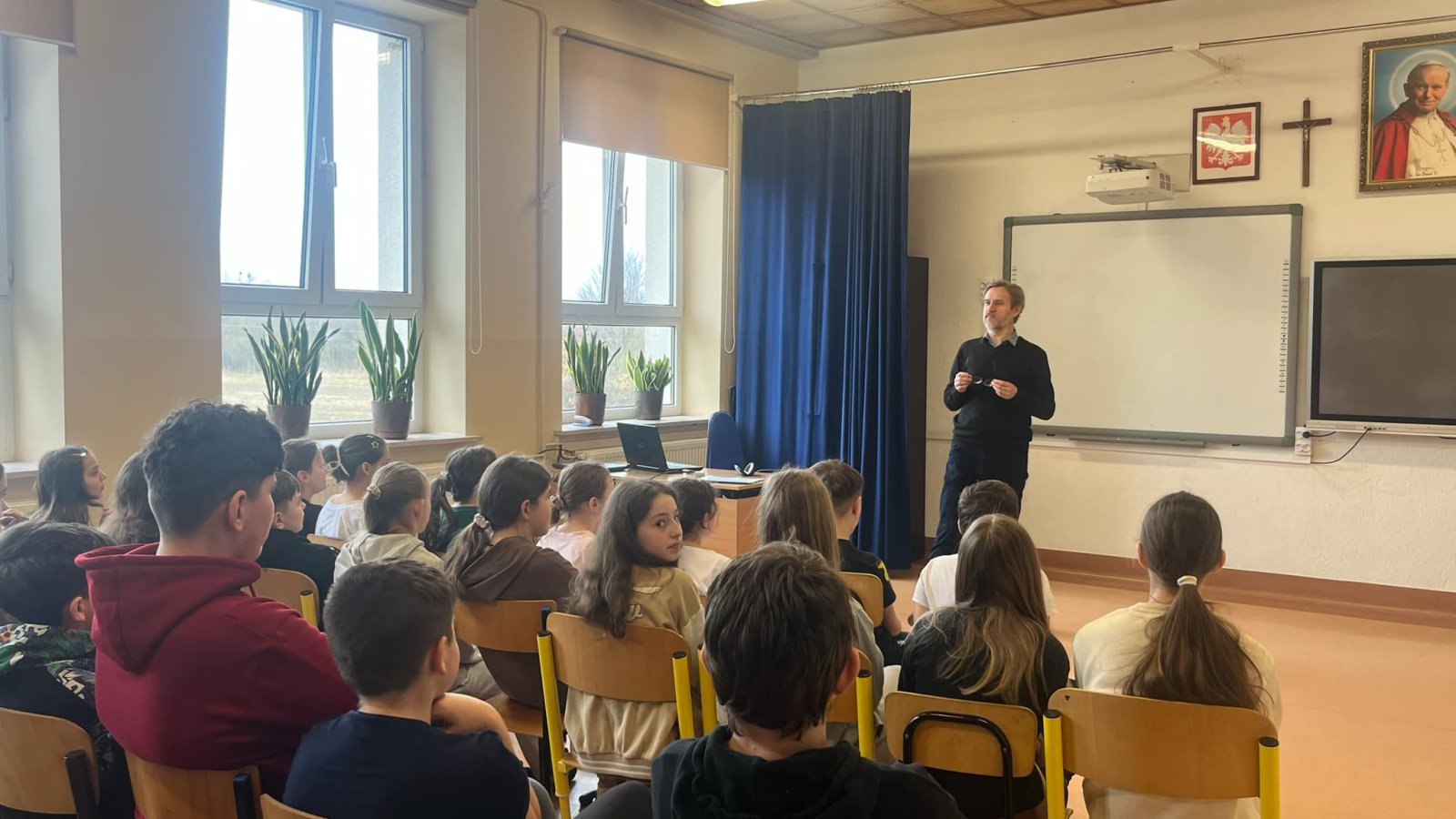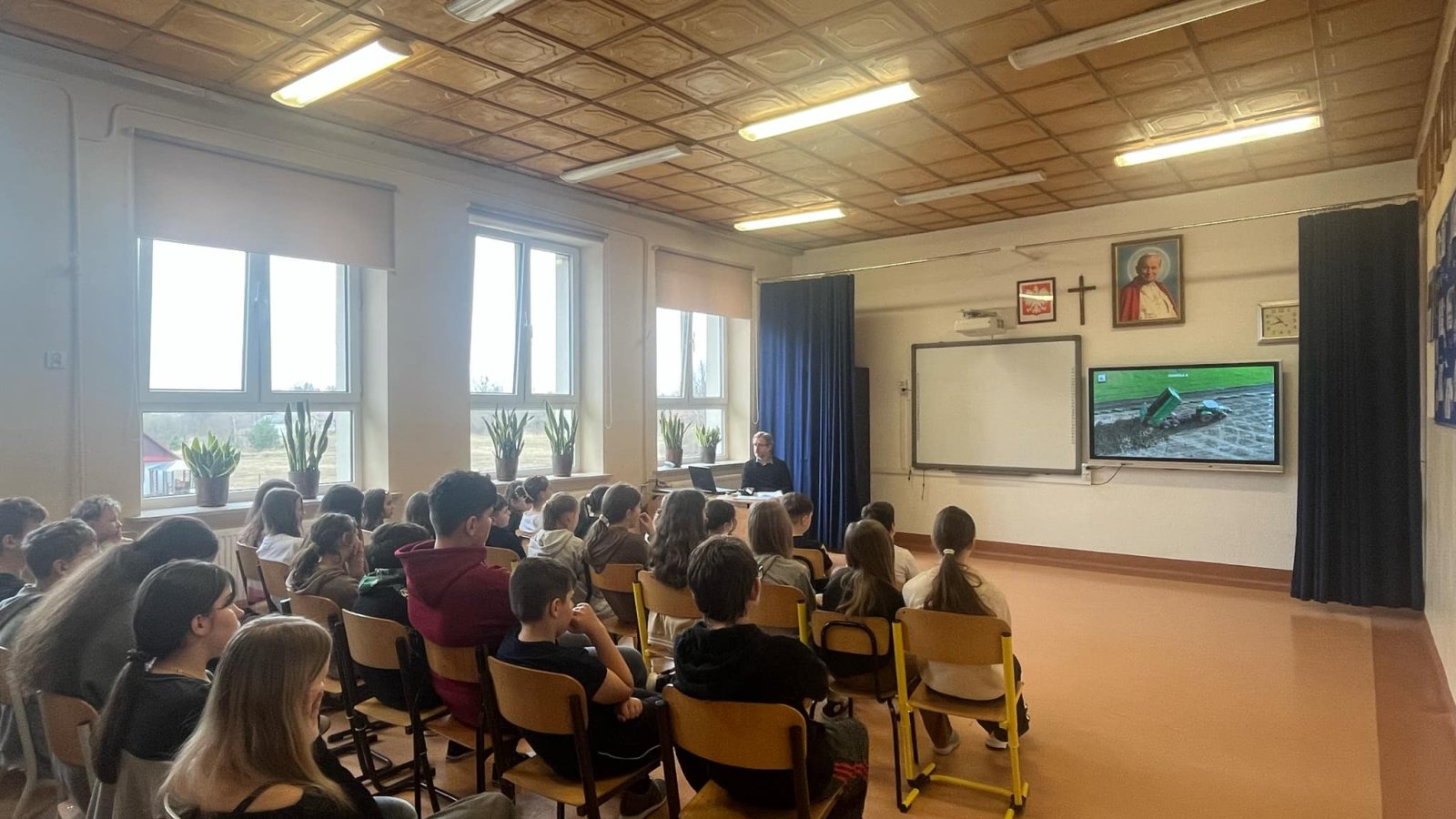 W ostatnim czasie w naszej szkole odbyło się spotkanie z panem Mariuszem Łysiakiem - pracownikiem Kasy Rolniczego Ubezpieczenia Społecznego (KRUS). Przeprowadzona prelekcja skierowana była do uczniów klas 0-VIII. Celem spotkania było uświadomienie młodym ludziom zagrożeń, jakie mogą wystąpić podczas pracy w gospodarstwie rolnym. Nasz gość zachęcił też uczniów do wzięcia udziału w konkursie plastycznym pt. "Wioski bez troski".
