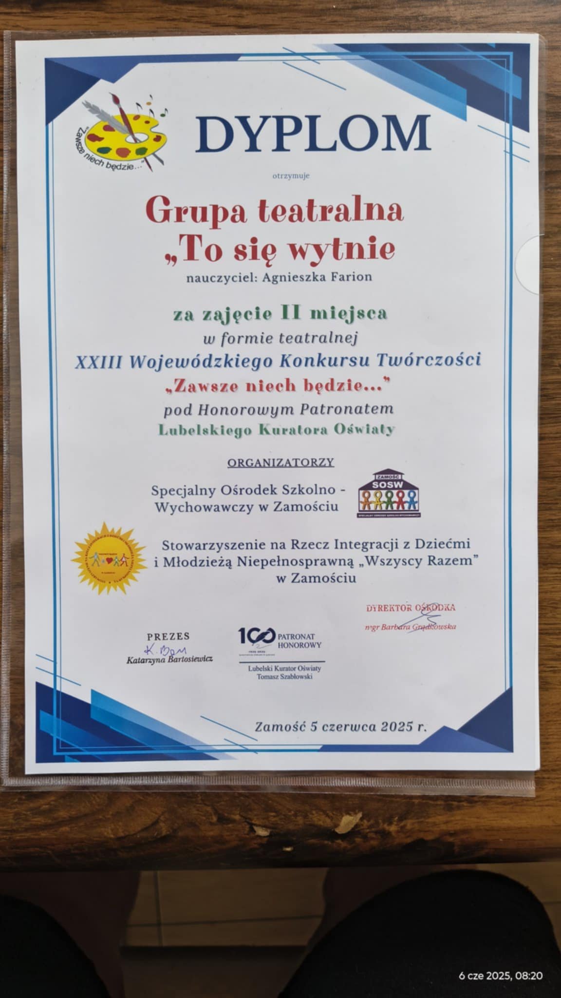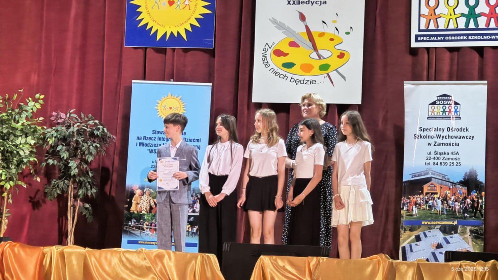 Wielkie brawa dla naszej uzdolnionej grupy teatralnej, która zdobyła zaszczytne II miejsce w XXIII Wojewódzkim Konkursie Twórczości "Zawsze niech będzie..." organizowanym przez Specjalny Ośrodek Szkolno-Wychowawczy w Zamościu oraz Stowarzyszenie na Rzecz Integracji z Dziećmi i Młodzieżą Niepełnosprawną „Wszyscy Razem” w Zamościu. Warto zaznaczyć, że Honorowy Patronat nad wydarzeniem objął Lubelski Kurator Oświaty Tomasz Szabłowski. Przedsięwzięcie miało na celu nie tylko stwarzanie możliwości do rozwoju artystycznego dzieci i młodzieży, ale przyświecała mu również piękna idea integracji, bowiem w konkursie przewidziano także kategorie dla uczniów z niepełnosprawnościami. Dzięki temu każdy miał szansę poczuć się ważny i podzielić swoim talentem.
