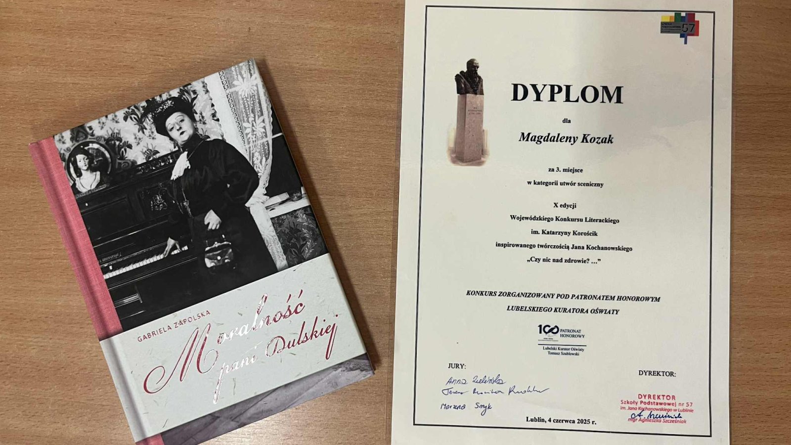 Cieszymy się niezmiernie, ponieważ nasza uczennica - Magdalena Kozak zajęła III miejsce w X Wojewódzkim Konkursie Literackim im. Katarzyny Korościk inspirowanym twórczością Jana Kochanowskiego "Czy nic nad zdrowie...?", w kategorii "utwór sceniczny". Organizagorem wydarzenia była Szkoła Podstawowa nr 57 im. Jana Kochanowskiego w Lublinie, a honorowy patronat nad przedsięwzięciem objął Lubelski Kurator Oświaty Tomasz Szabłowski. W pisarskich zmaganiach rywalizowało aż 69 uczniów z całej Lubelszczyzny, ale mimo dużej konkurencji Magda znalazła się w gronie laureatów. Jesteśmy bardzo dumni z naszej tegorocznej absolwentki. Życzmy wielu sposobności do rozwijania talentu na dalszych etapach edukacji.