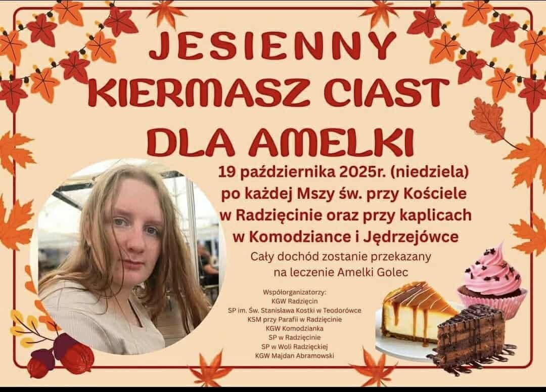 Serdecznie zapraszamy na Jesienny Kiermasz Ciast dla Amelki, który odbędzie się 19 października 2025 r. (niedziela) po każdej Mszy św. przy kościele w Radzięcinie oraz przy kaplicach w Komodziance i Jędrzejówce.